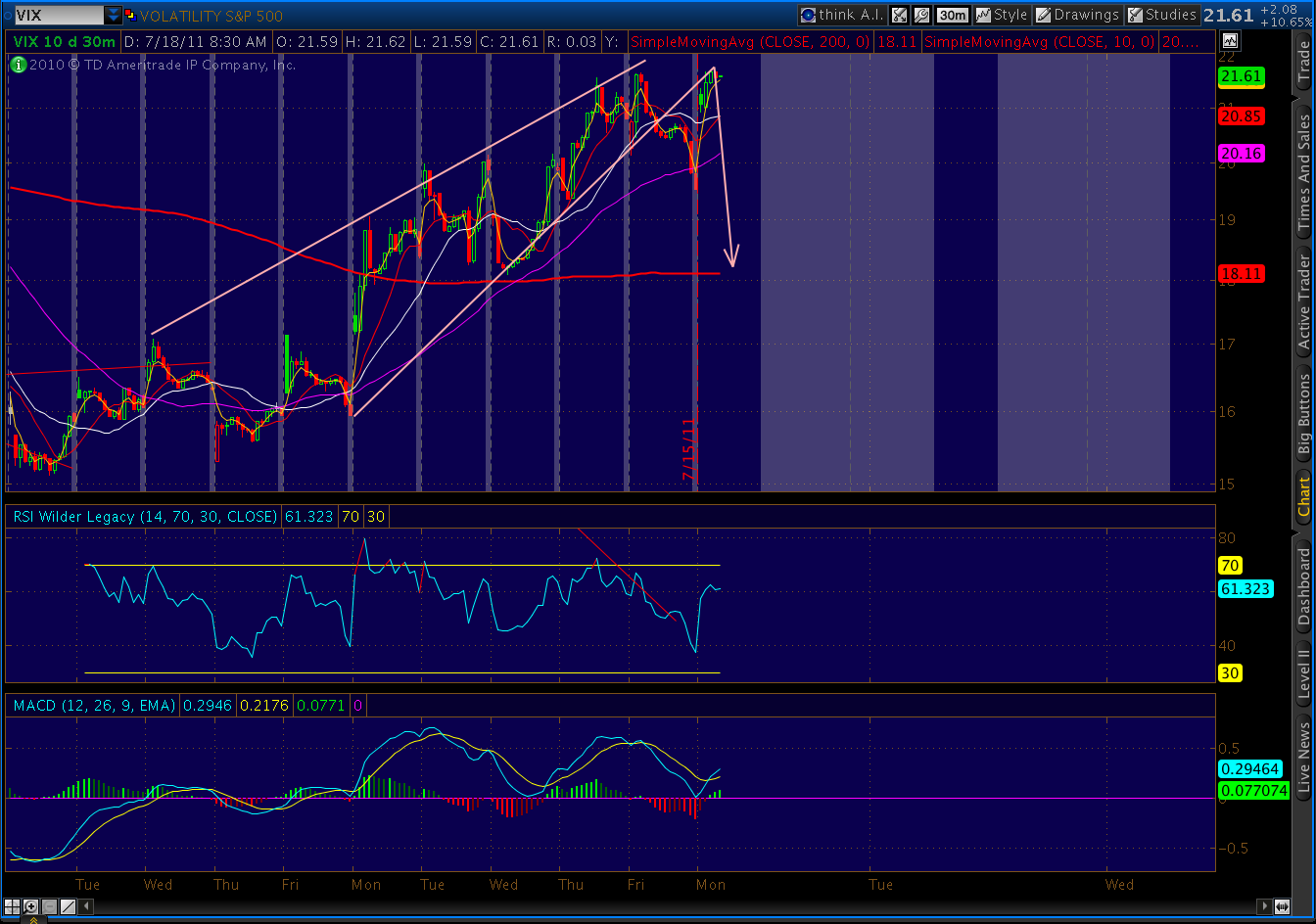 VIX completed the backtest of the rising wedge it fell out of Friday, should head down from here.