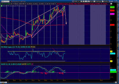 SPX down 14.62 to 1301.52. For all the fear raging through the market, we’re still only at the bottom of the falling wedge and the -1 std dev line (also the .382 Fib) is holding just fine. Don’t think we’ll broach the 1258.60 mark. Took some short profits and added some on the long side here.