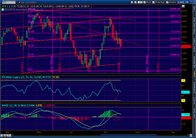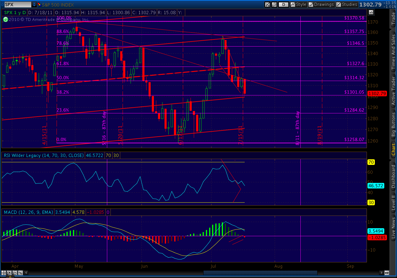 We did get several bounces off 1298.60, coming with 7 cents at 7:57 and 2 cents at 8:38AM. At that point, we were within spitting distance of the falling wedge bottom TL and the .382 Fib line. But, here, the selling pressure intensified and we bottomed at 1295.92 before retracing back to 1305.44 at the close.