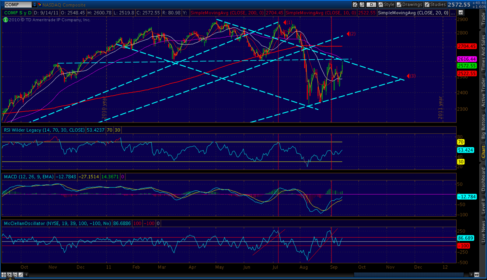I’ve redrawn the channel to include today’s market action. The existing line (w/ shadows) would have accommodated yesterday’s rise, but not today’s. Channels can and do shift all the time, but this one caught me off guard.
