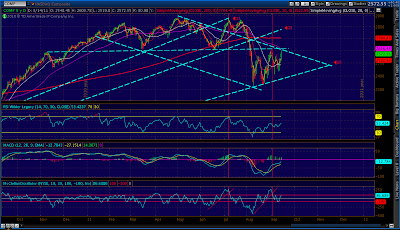 In that case, too, the market rallied to the +1 regression channel line instead of the midline as I had been expecting (based on the 2007 analog.) We are within a point or two of the midline right now.