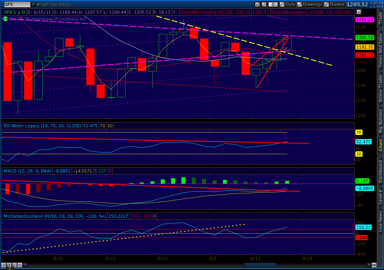 Looking at the daily chart on spy and spx we are forming a wedge that looks to be peaking today. After the wedge breaks there is support at around 1187 SPX.