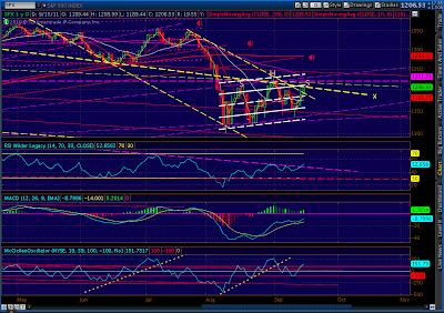 I’m distressed (and poorer) at having called the top a few days early. This same thing happened at the end of the Feb – July topping pattern. On Jun 24, when seemingly everyone was calling for a flash crash, I called for a rally from 1267 to 1330 within the next 5 trading days. It happened in 4. I happily took my short position, only to see the market rally another 40 points before peaking.
