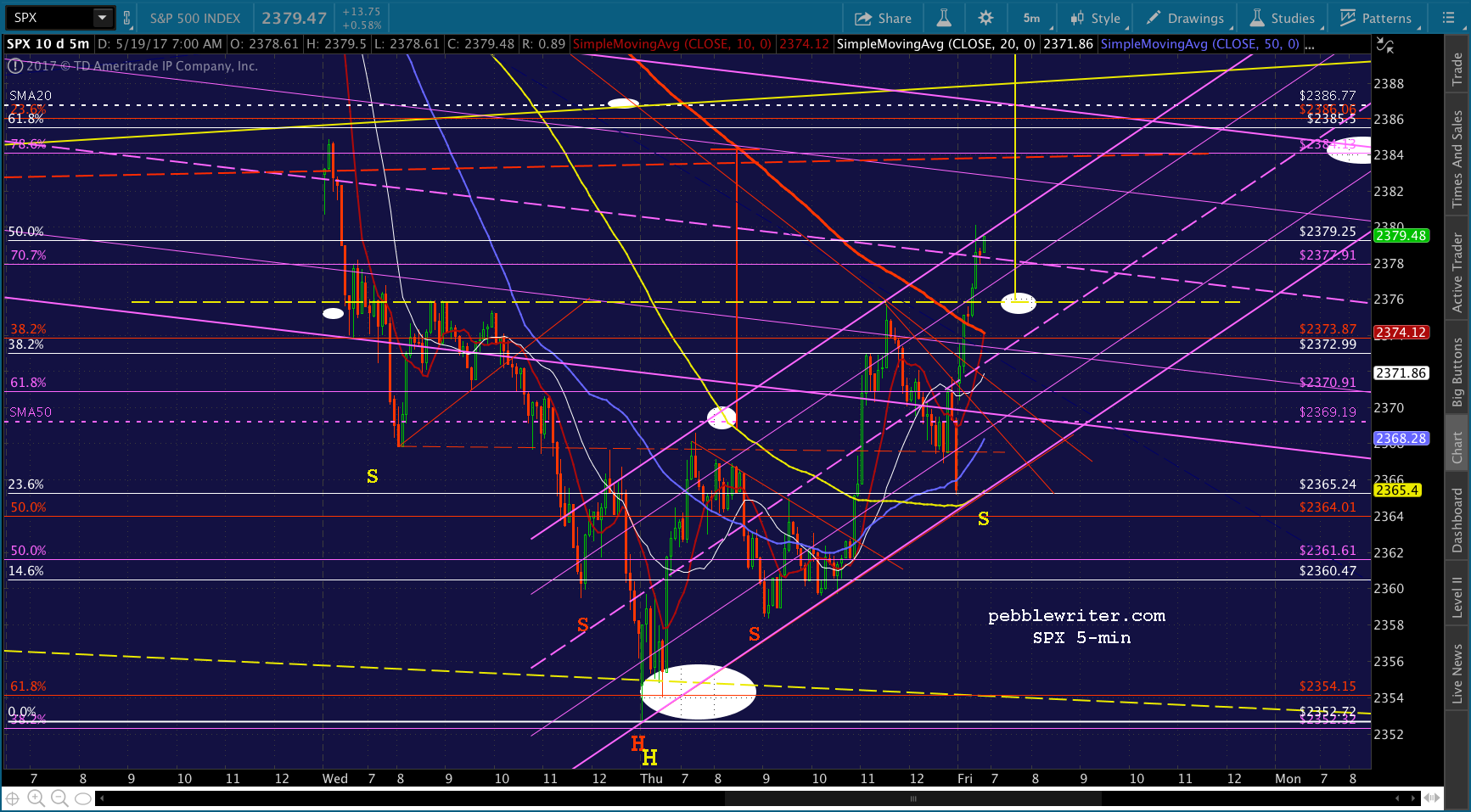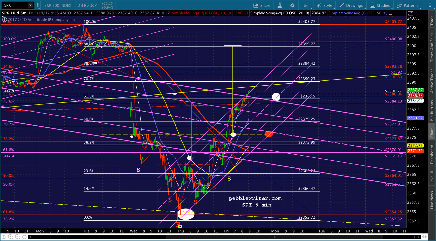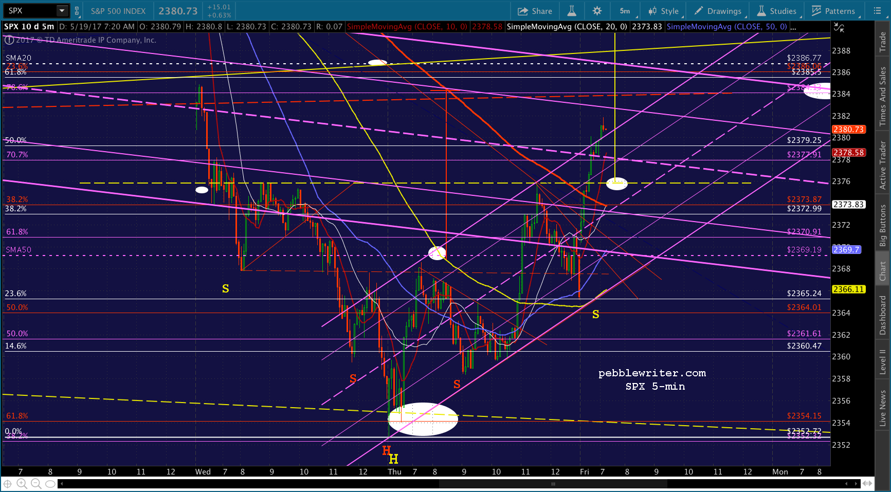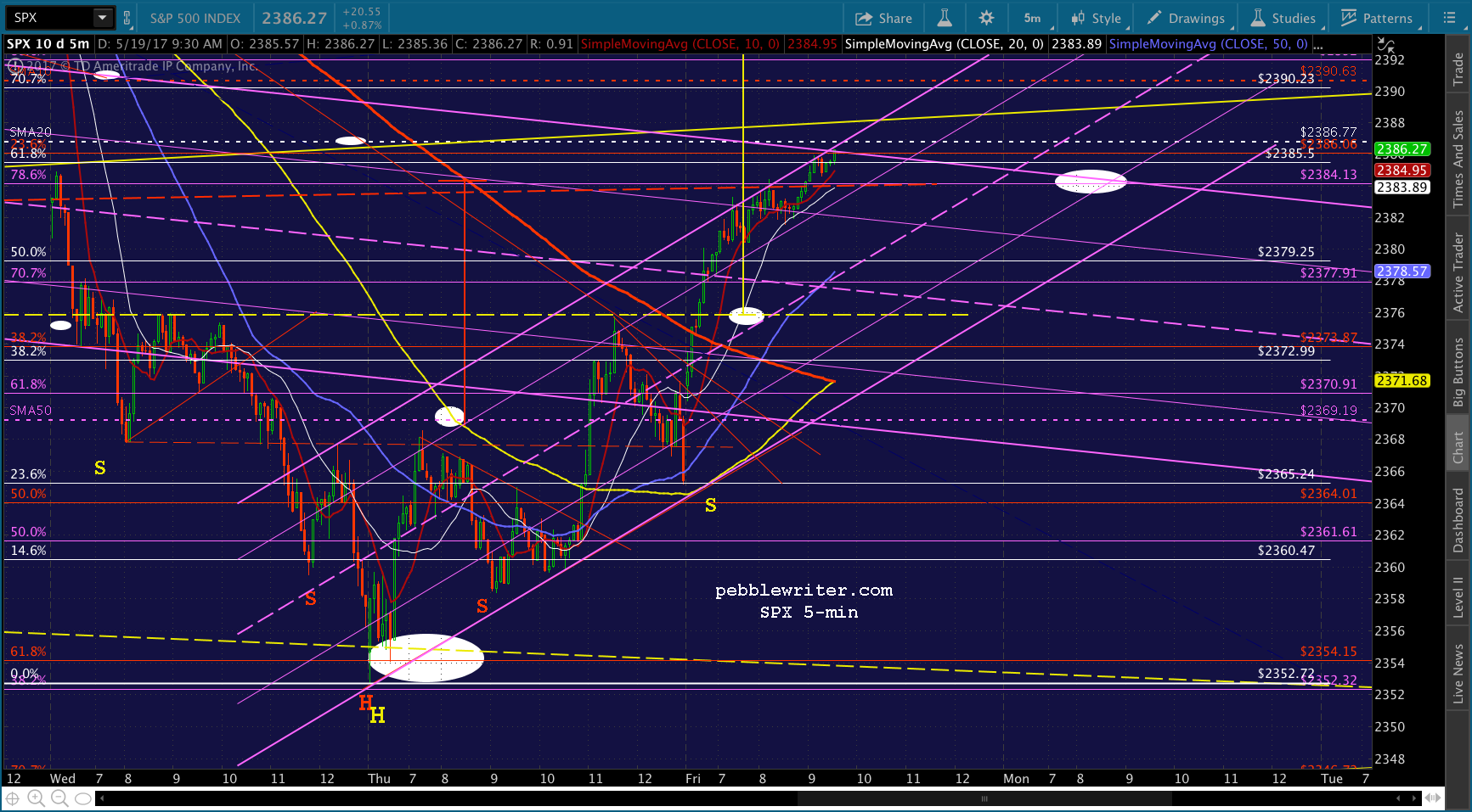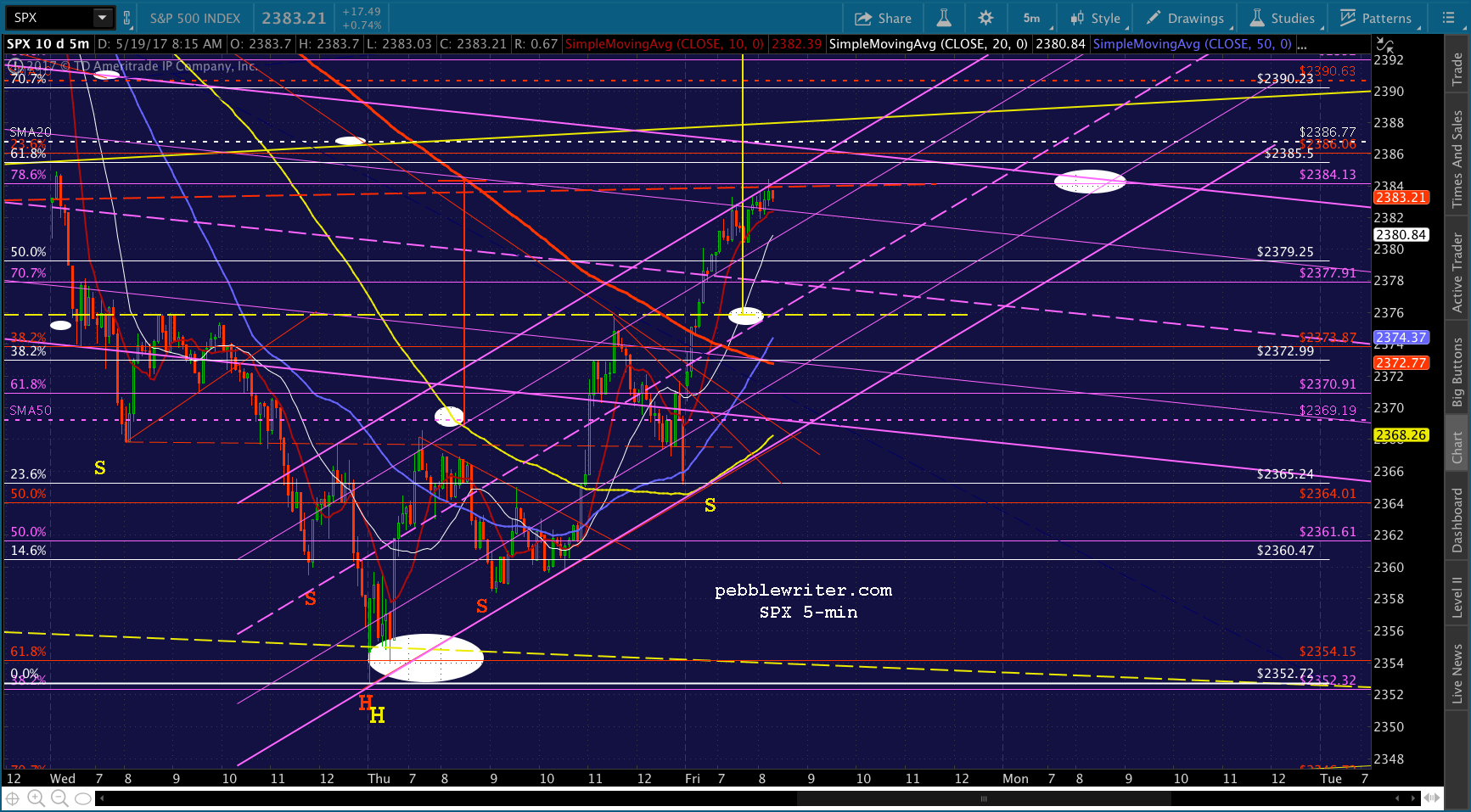 Coming up on the red target now at 2375.84. I’d plan on taking profits there and spend the weekend in cash. Remember what happened on Apr 24 and don’t get greedy. As negative a close as this is, TPTB can work magic over a weekend, especially where the yellow channel is involved. If you really want to gamble, stay long. But, as always, don’t think about it unless you can hedge or handle the gap risk.