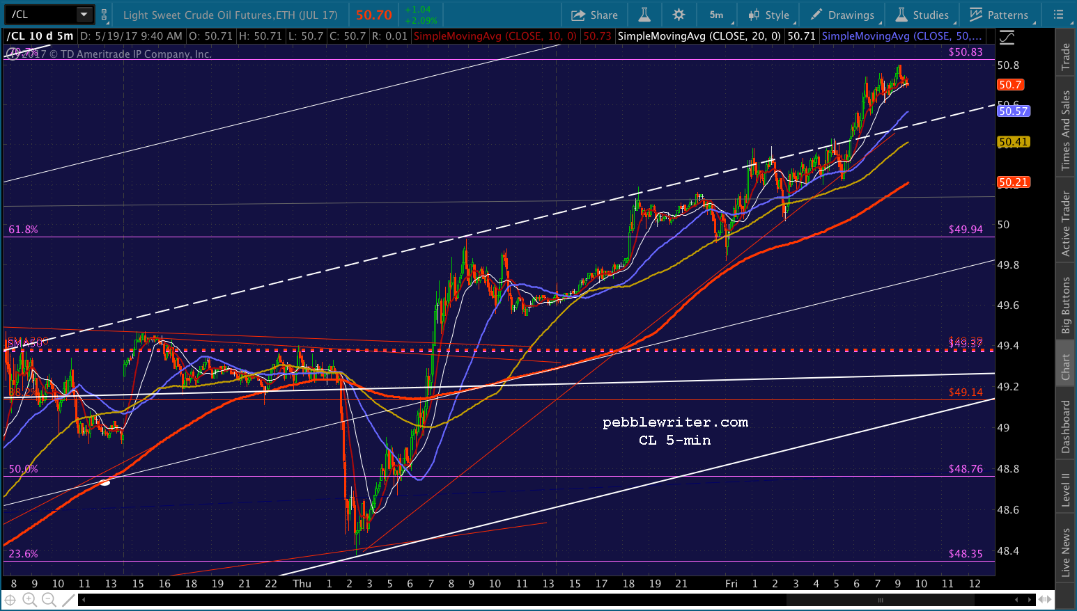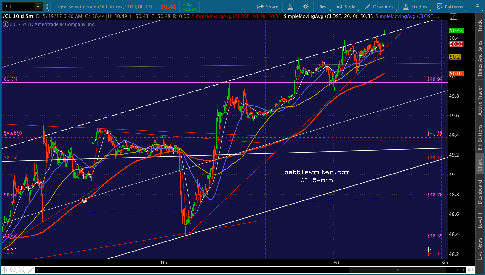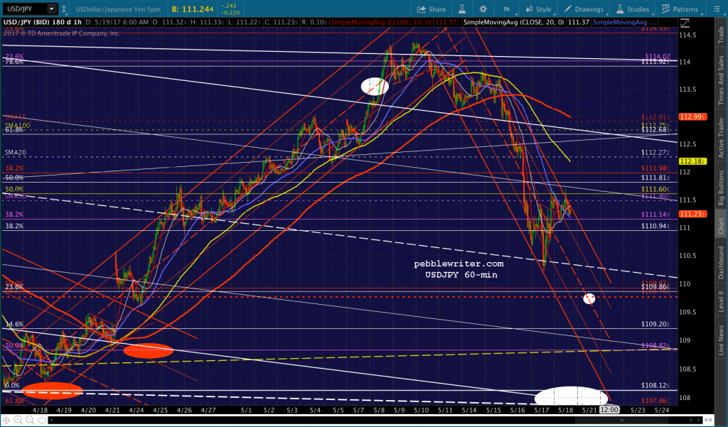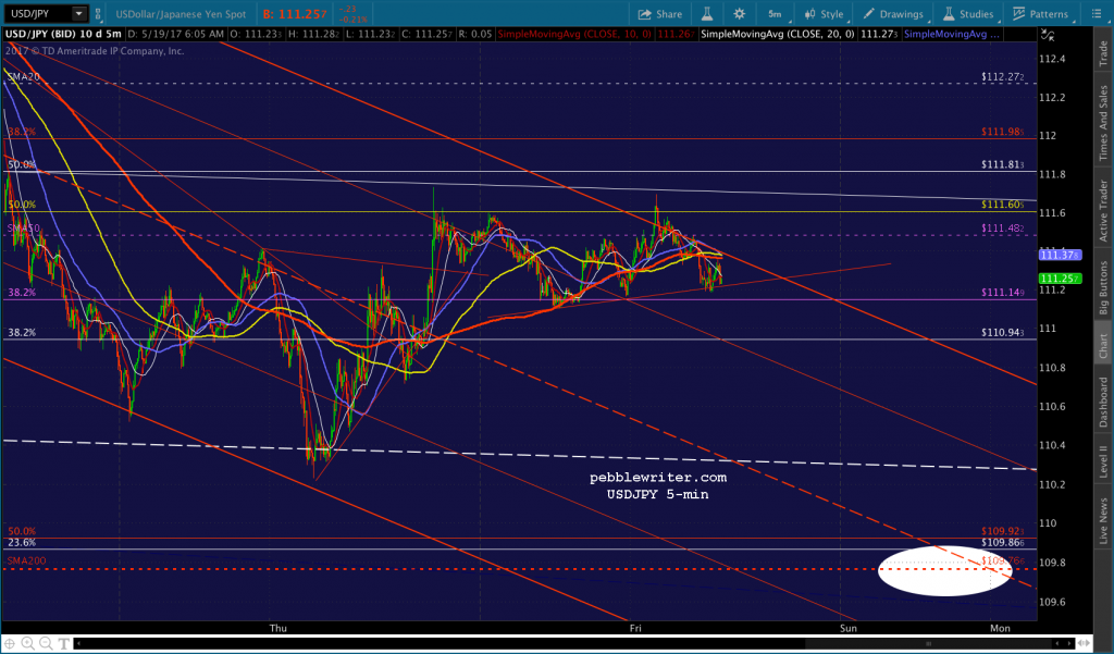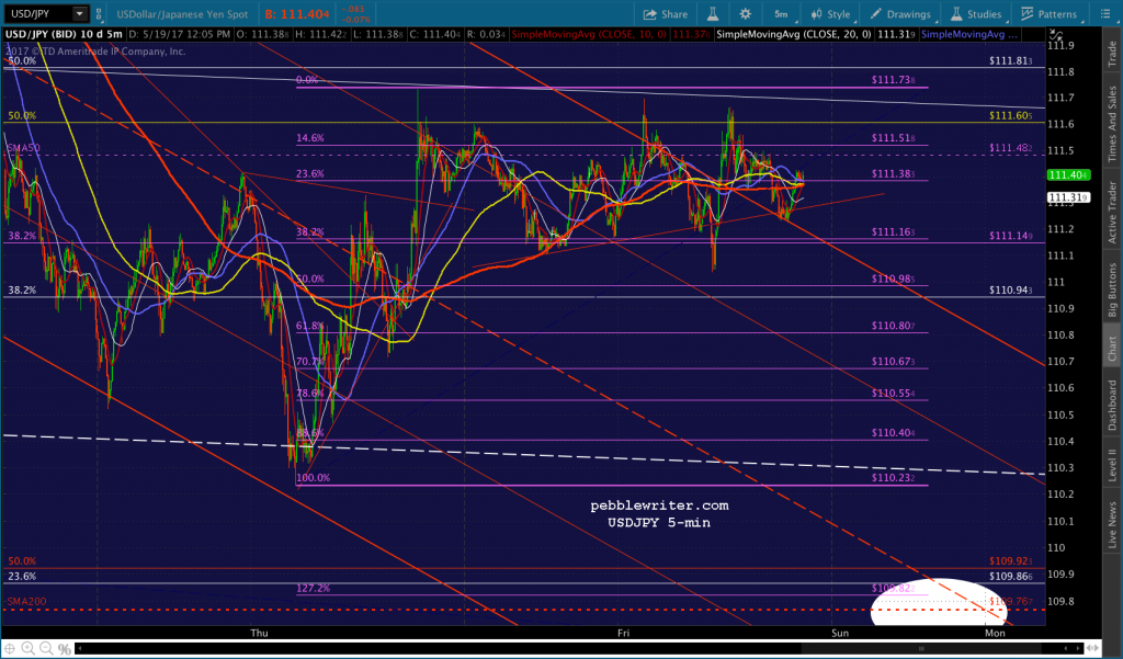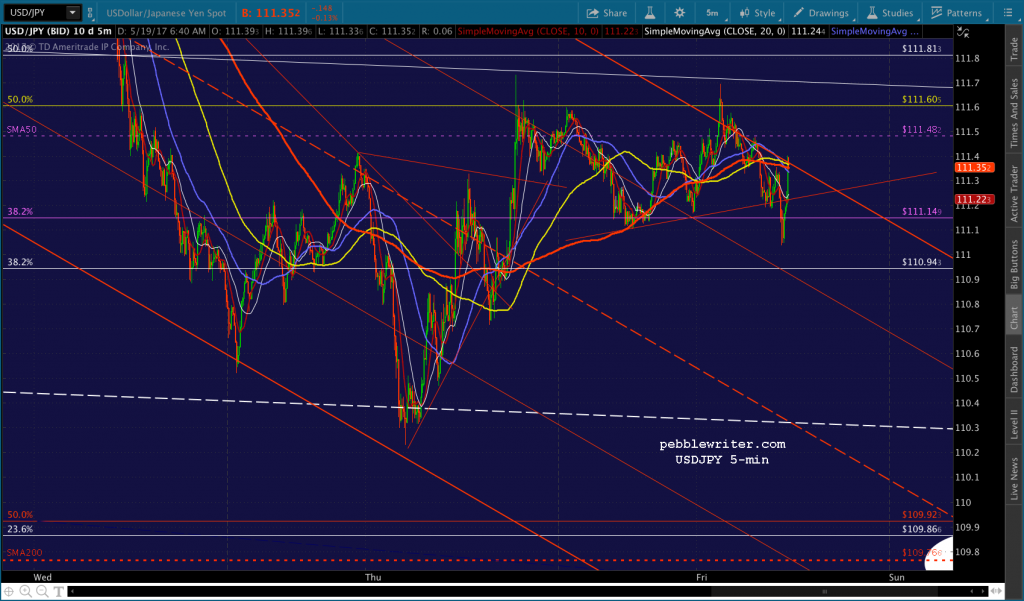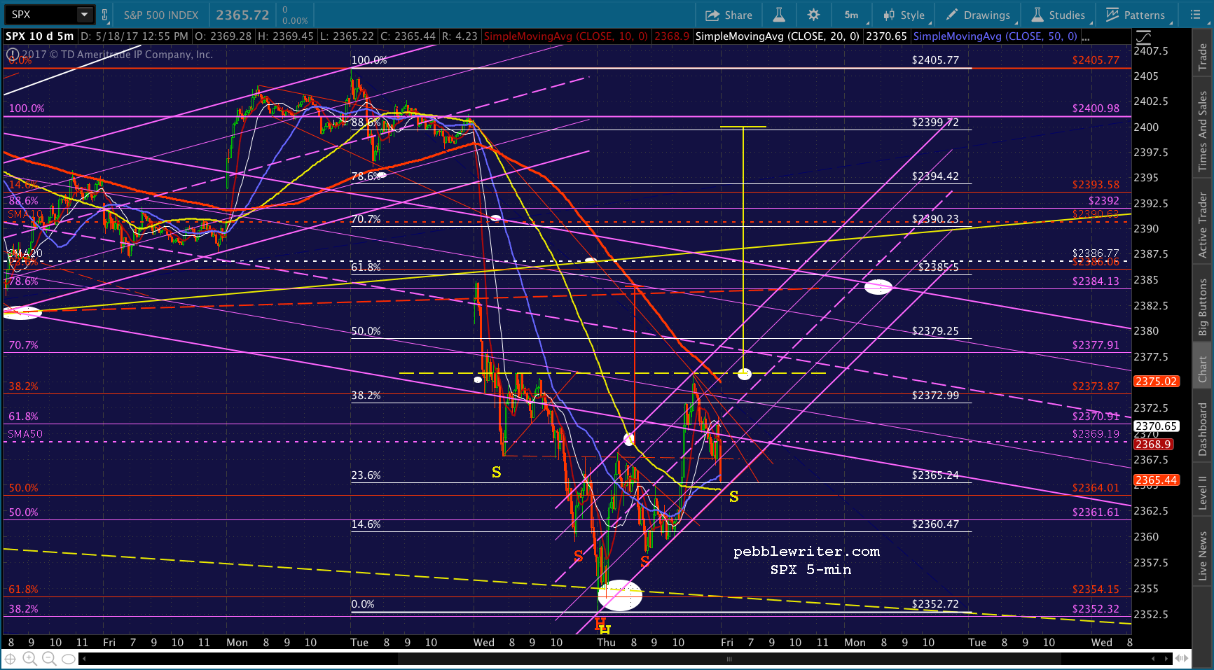 Coming up on the red target now at 2375.84. I’d plan on taking profits there and spend the weekend in cash. Remember what happened on Apr 24 and don’t get greedy. As negative a close as this is, TPTB can work magic over a weekend, especially where the yellow channel is involved. If you really want to gamble, stay long. But, as always, don’t think about it unless you can hedge or handle the gap risk.