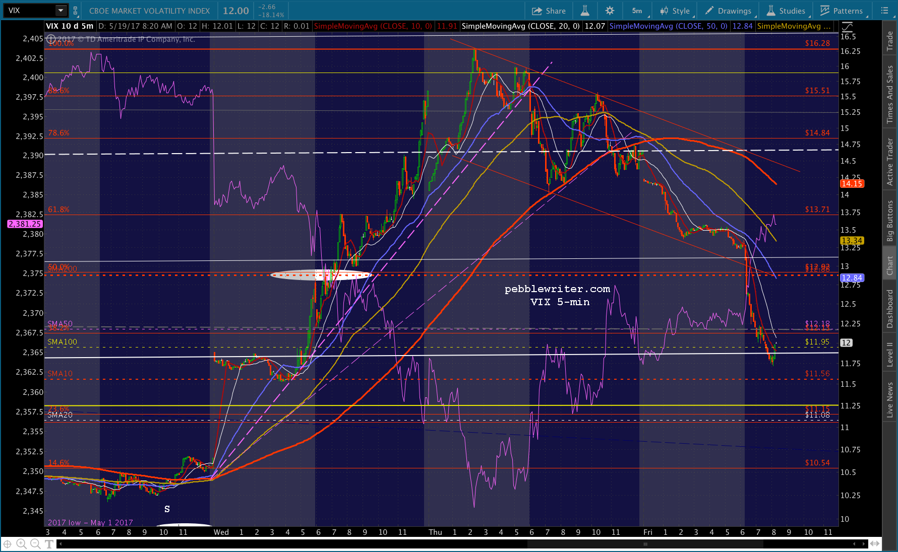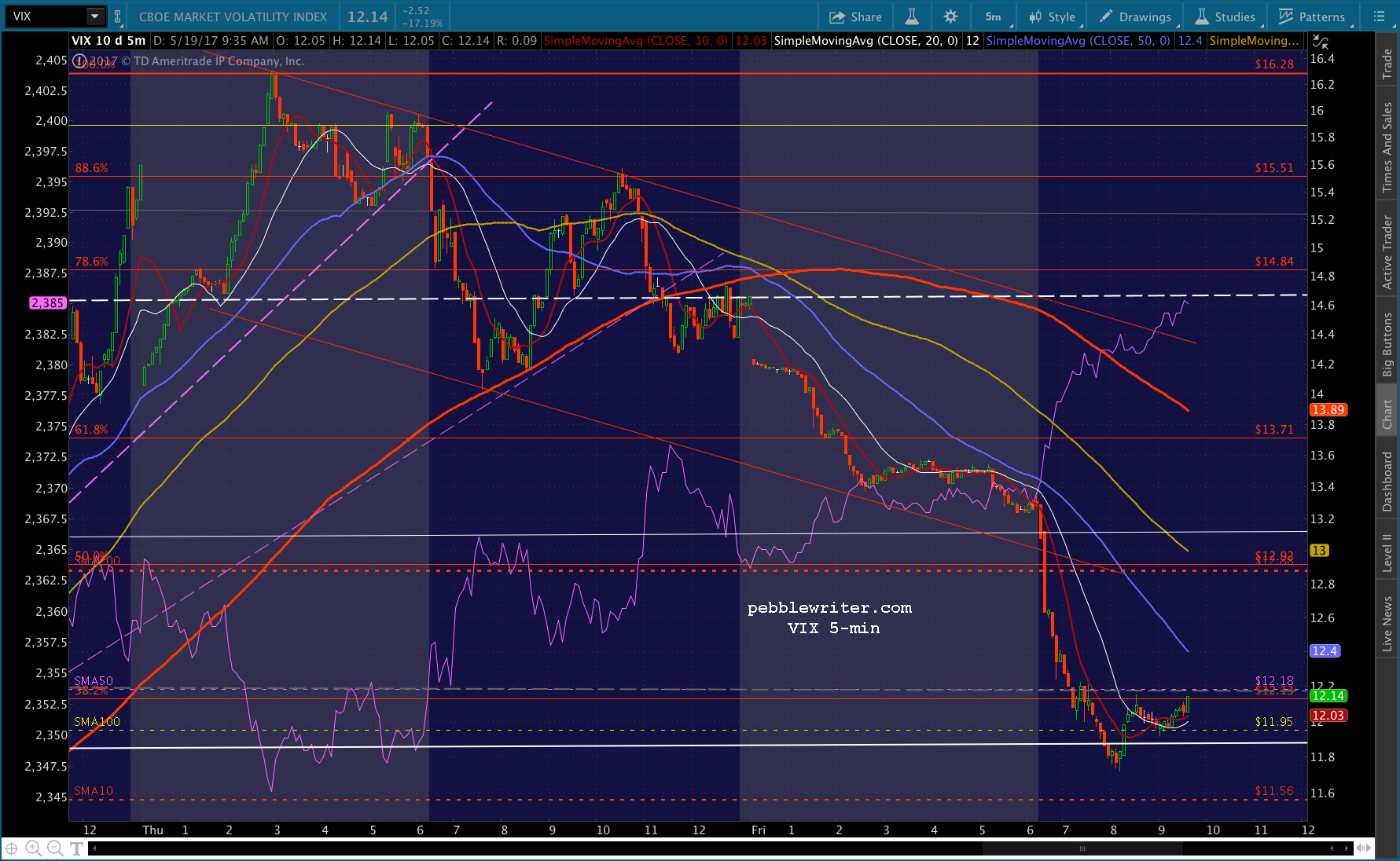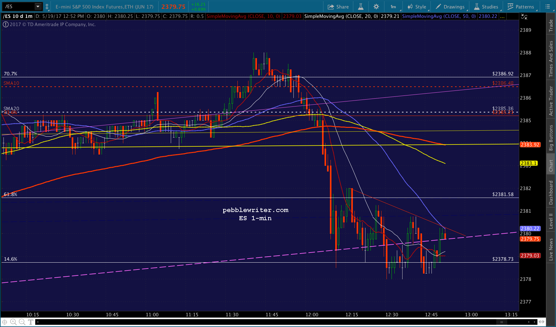 My guess is it’ll go sideways for most of the rest of the day. But, if it ever gets some downside going (VIX is still sneaking higher) then the intersection of the yellow neckline and purple channel bottom at 2375.84 makes the most sense to me.