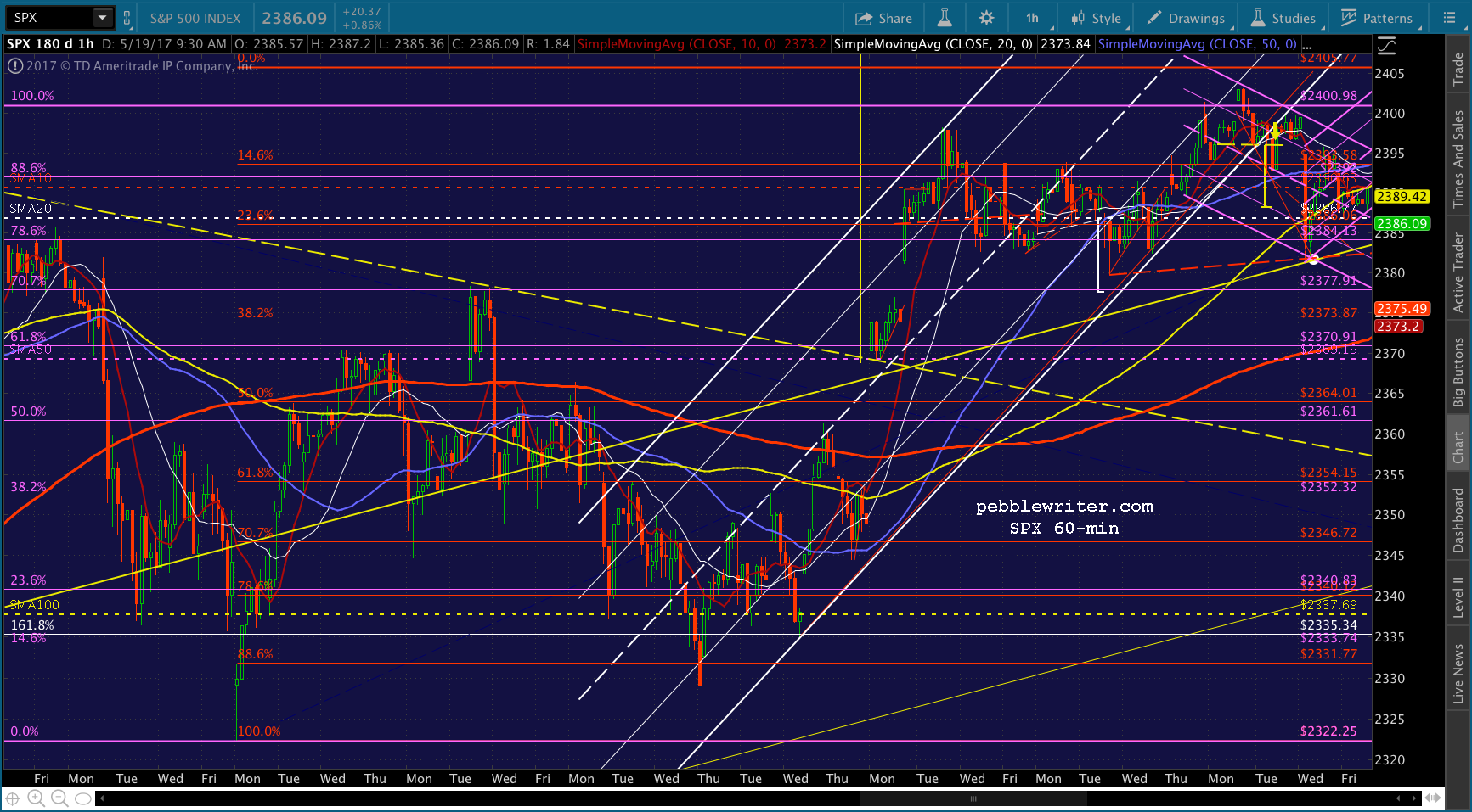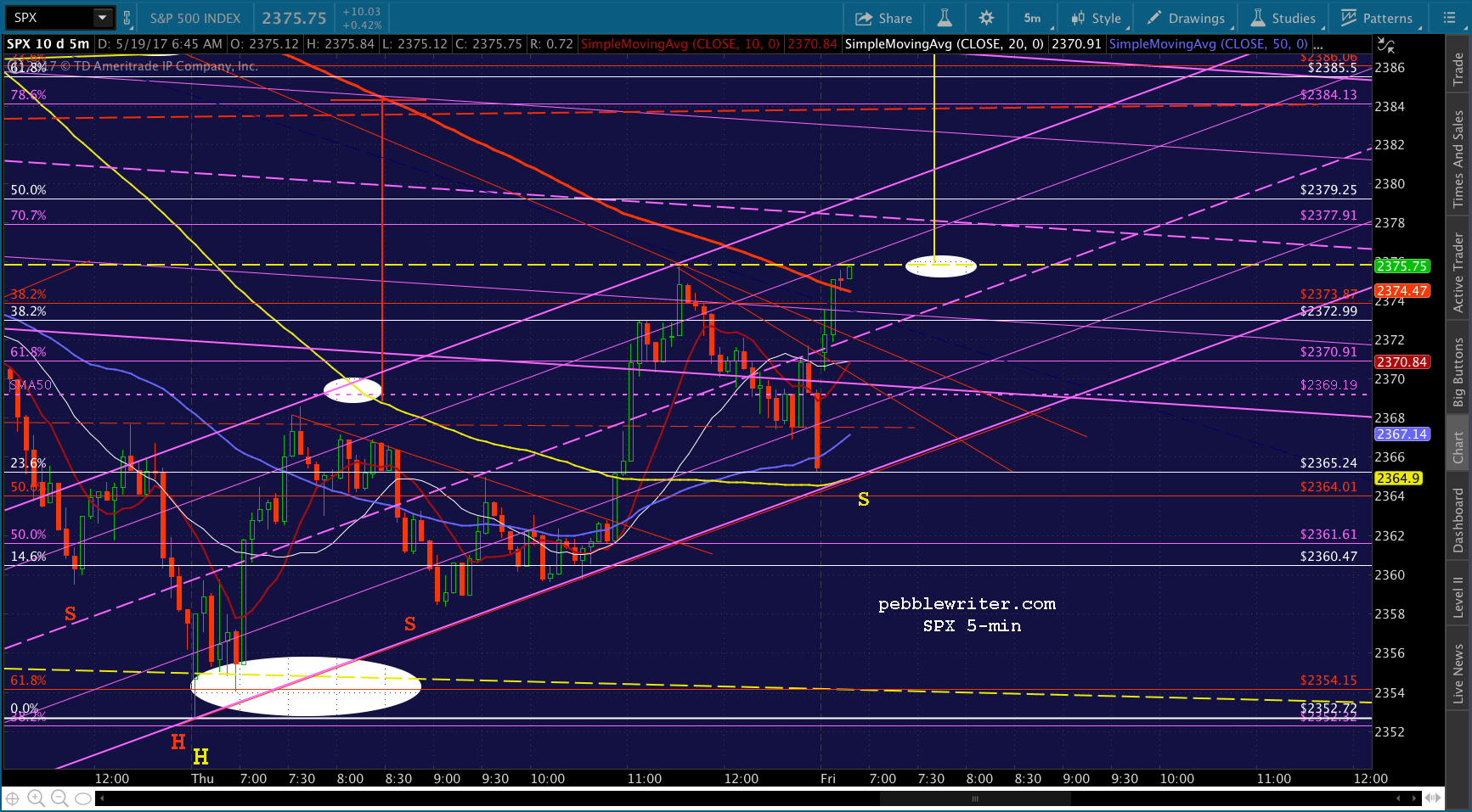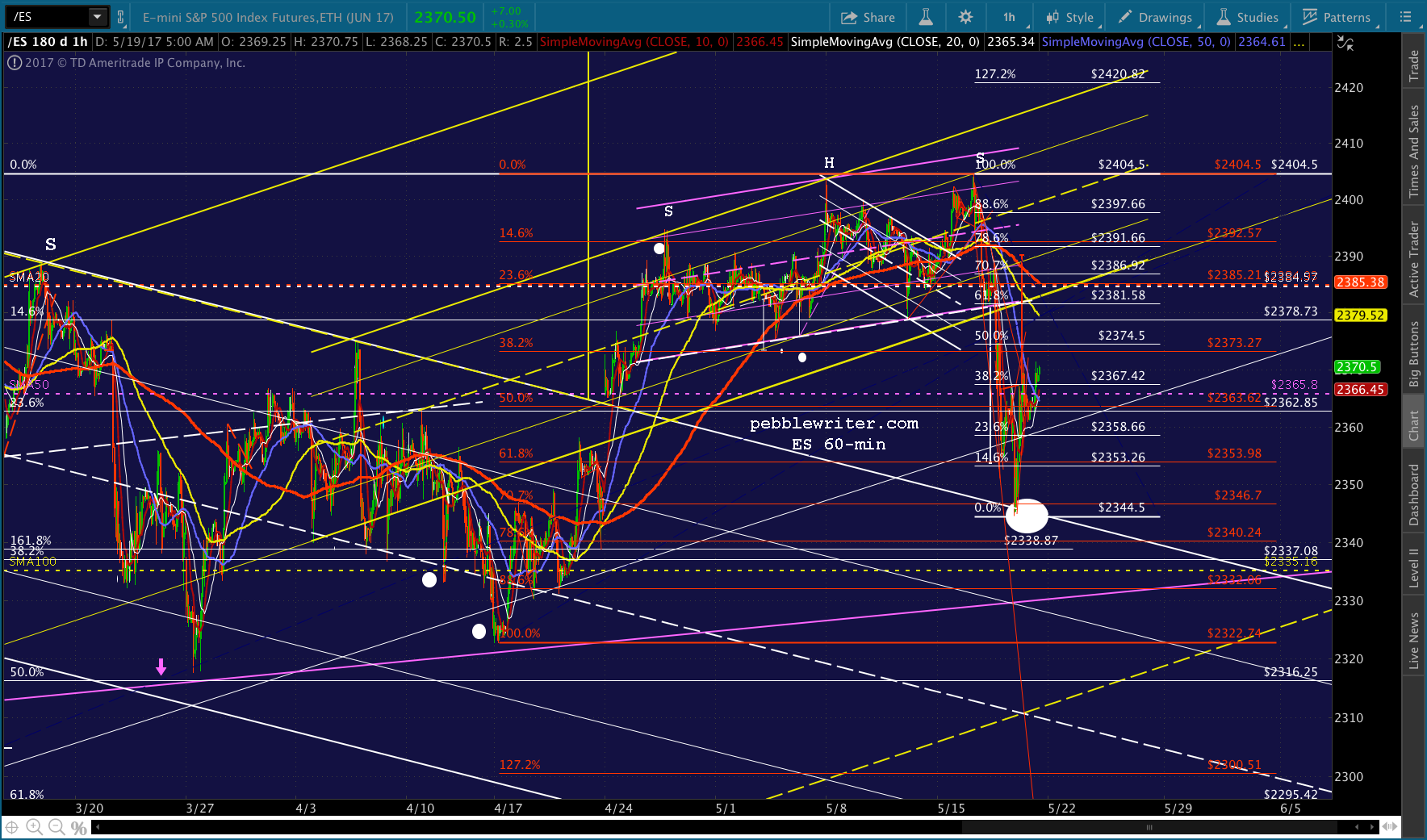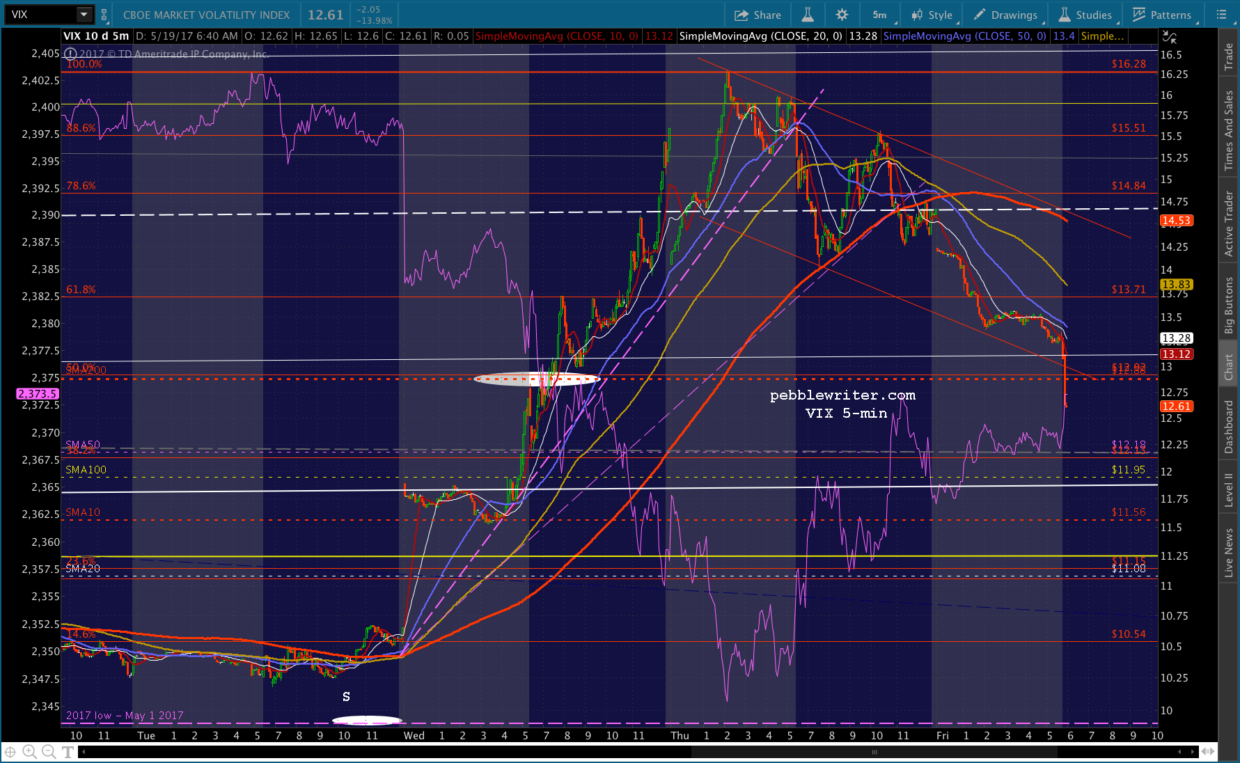 My guess is it’ll go sideways for most of the rest of the day. But, if it ever gets some downside going (VIX is still sneaking higher) then the intersection of the yellow neckline and purple channel bottom at 2375.84 makes the most sense to me.
