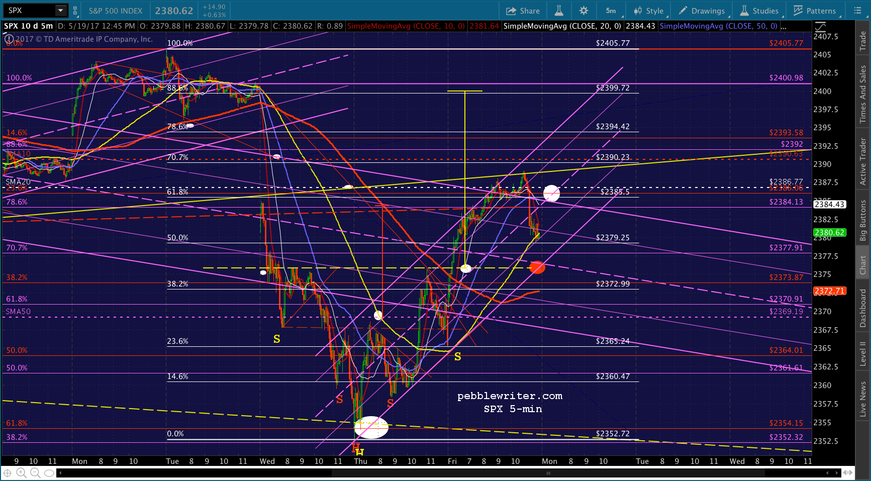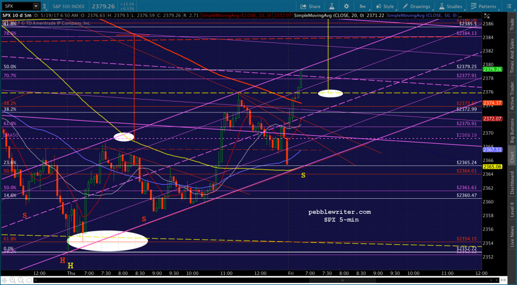 I’m going to take a brief break, will be back at 12:00. I’d plan on going long again at 2375.83 or if SPX breaks out past the red TL. If the yellow should be tested and fail, it would make sense to stay short for 2369.
