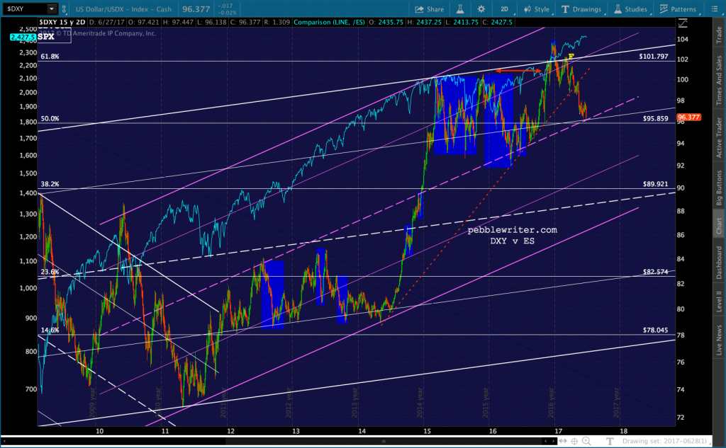 continued for members...Note that SPX stopped on a dime on the purple .886 at 2419.86, another of our downside targets. This was not by happenstance. It got DXY and EURUSD where they needed to go.
