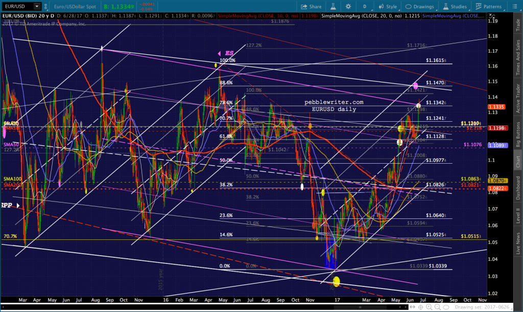 EURUSD’s chart is still slightly ambiguous, with the white .886 and white channel top still a preferred turning point. The white channel fits the highs better, while the purple channel fits the lows better.