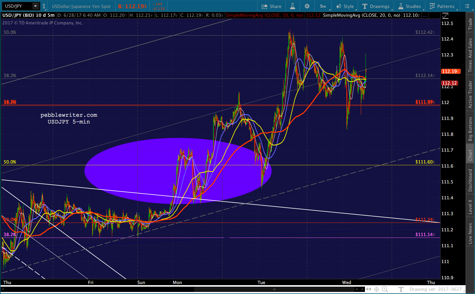 USDJPY has overplayed its hand, as usual, and should be ready to tumble back to the falling white channel, now at 111.24. But, it could easily postpone that move for a few more days.