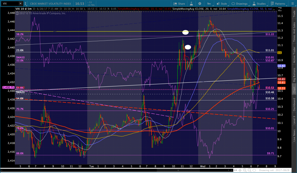 VIX just dropped below its SMA5 200, meaning the breakdown might be at hand. This will likely help SPX break back above the yellow channel top at 2435. The next goal would then be to get it back above the SMA5 200 at 2437 and, then, the SMA10 at 2438.18.