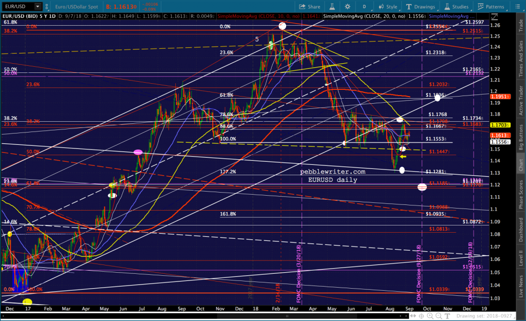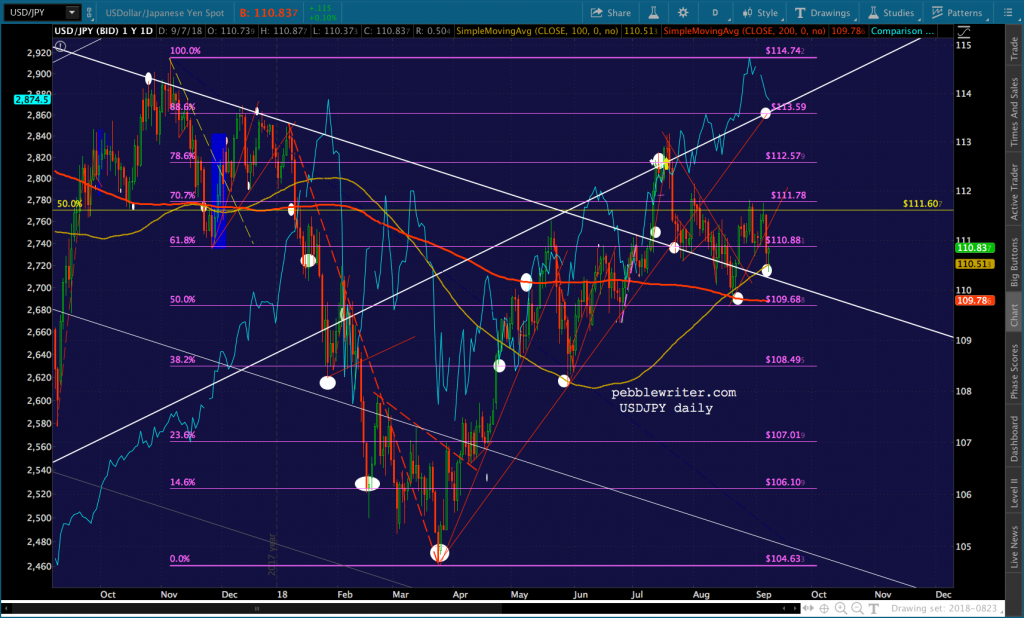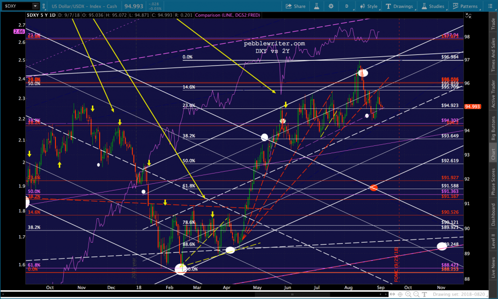 On the currency front, DXY is back above the little purple TL – a positive. But, it still looks quite overextended. If TPTB can get SPX up to 2965 by Sep 27, I suspect we’ll see the Fed throw some doubt on the Dec rate hike. This would presumably weaken the dollar and take some pressure off EM currencies.