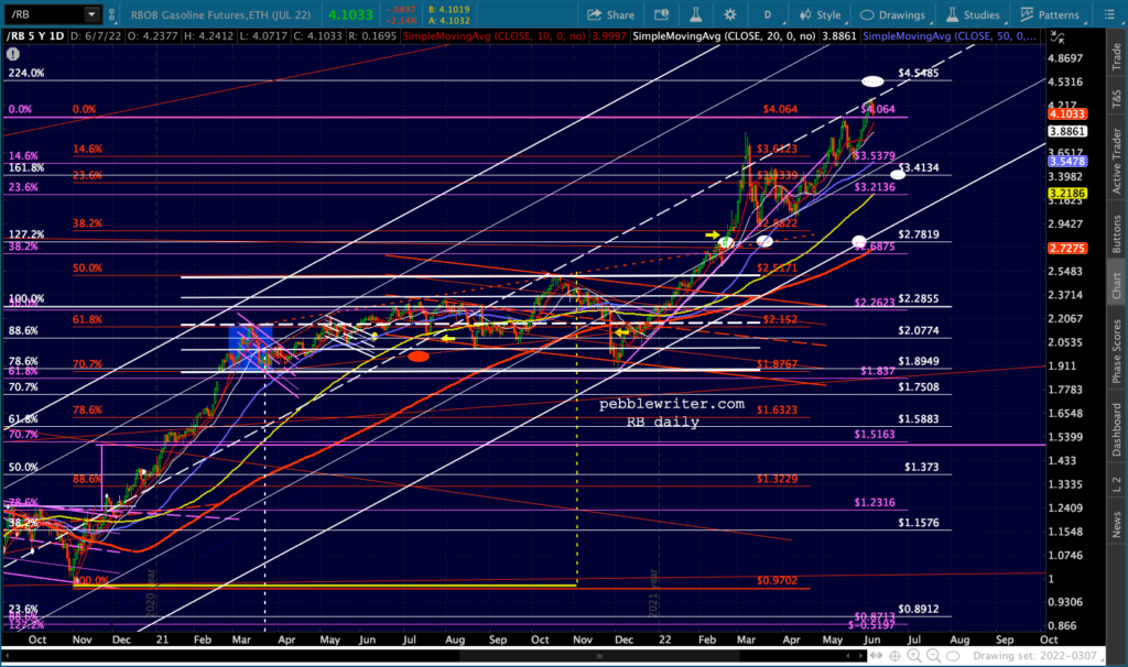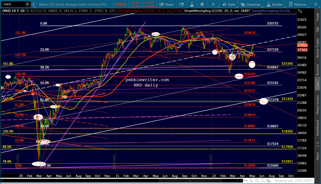 They’e been trying to get the NKD back above resistance for months. At this point, they face not only the SMA200 but a channel midline and a TL from last September connecting all the tops. How much more currency destruction will they push through in order to try to keep the NKD from imploding? I guess we’ll find out.