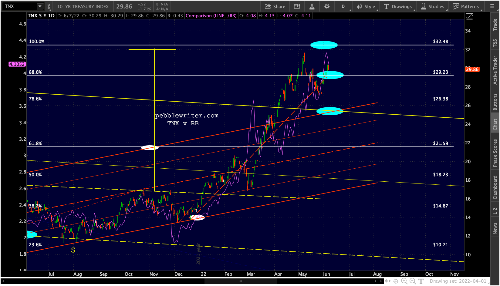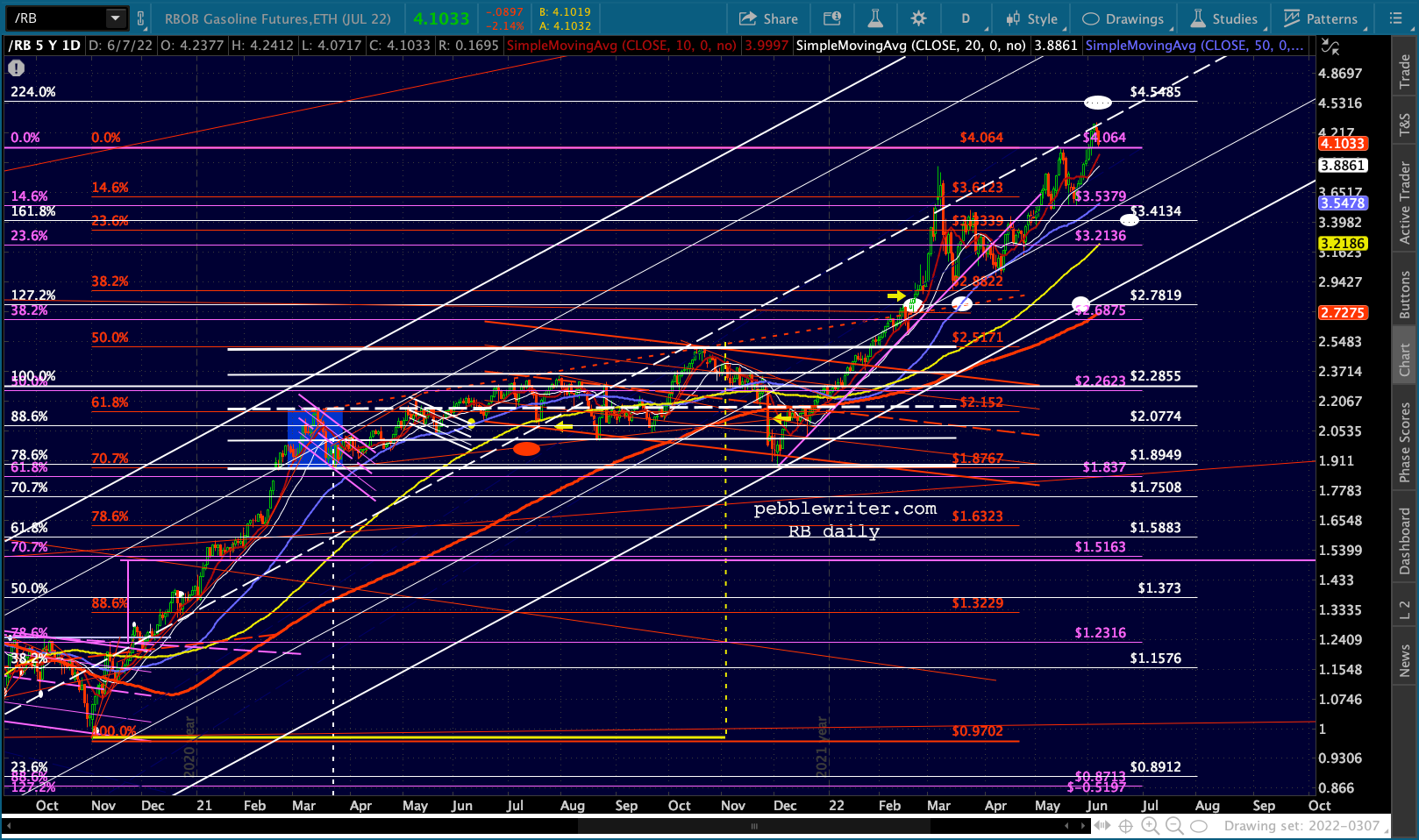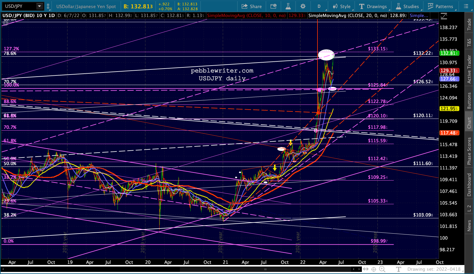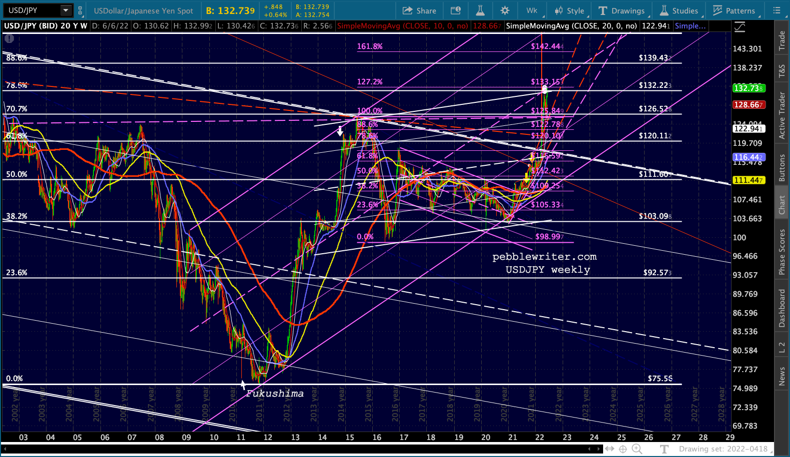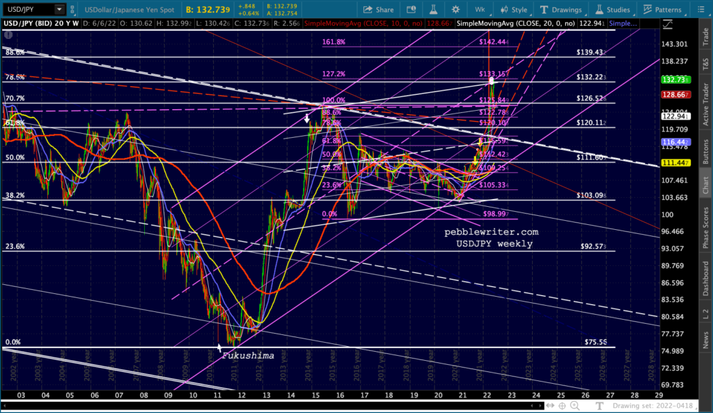 USDJPY faces not only the .786, but the top of a flag pattern and the midline of the huge purple channel.