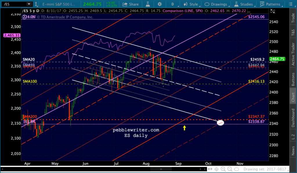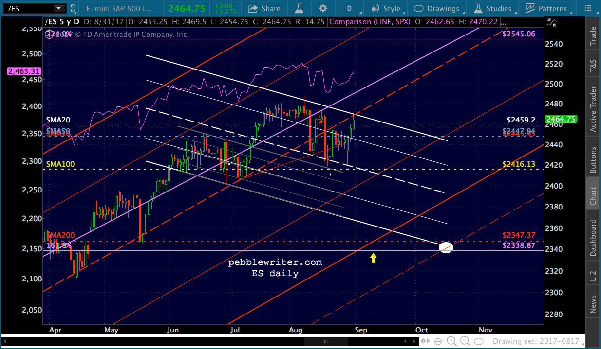 ES is currently backtesting its rising red channel midline. If it can’t make it back above (2469ish) then the target down around the SMA200 (2338-2347) remains in focus (optimally, 2338 on Friday, Oct 13.) Otherwise, we’re likely to rack up incrementally new highs for the foreseeable future.