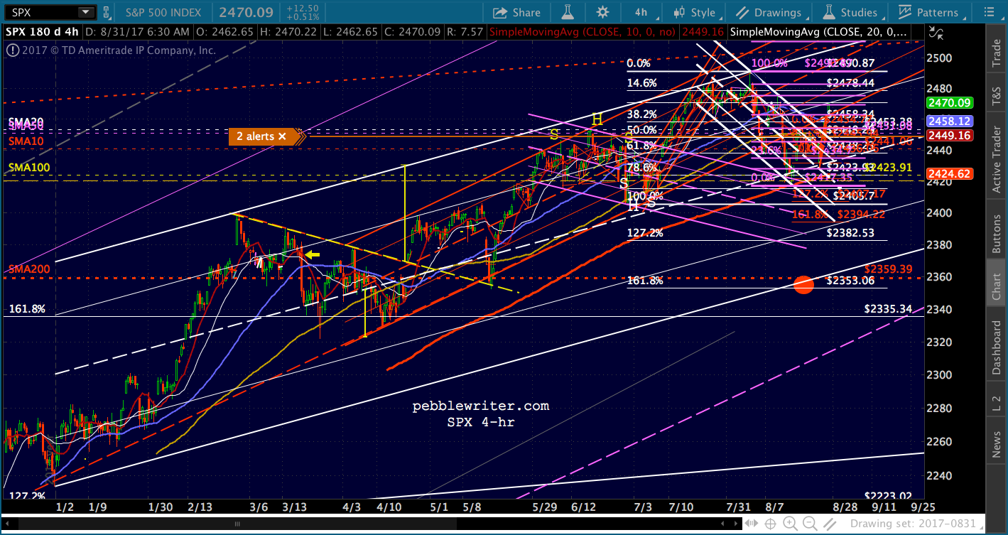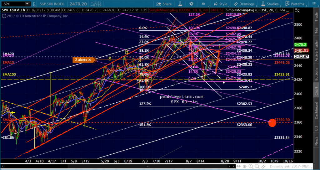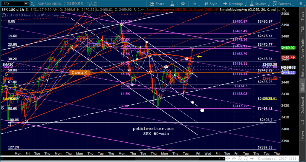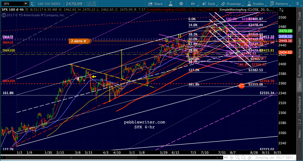 I’m enough of a cynic that I’d short here at 2469 (SPX 2470) and take a chance on a reversal. But, keep a very close eye on VIX and that potential breakdown and be ready to switch sides.