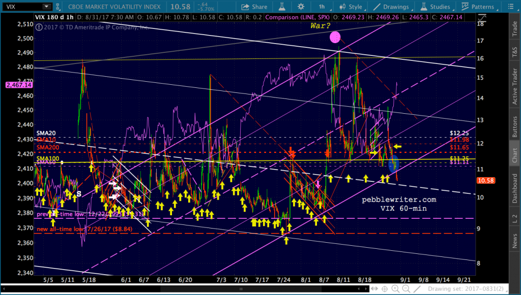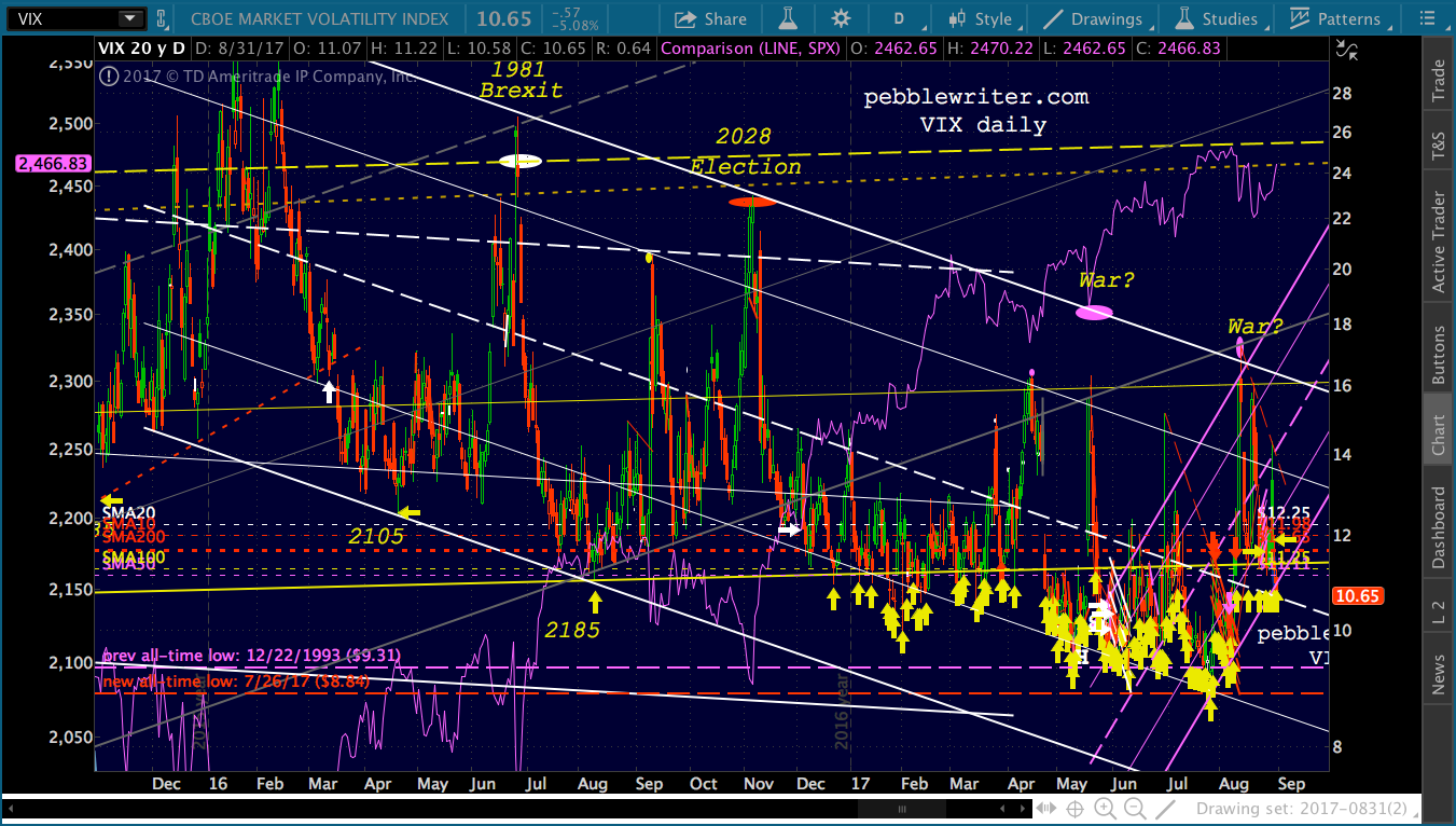 VIX, on the other hand, can be hammered into oblivion without inflicting any damage — other than to unsuspecting bears. And, that’s exactly what happened. Of the 168 sessions so far in 2017, VIX has tagged or dipped below the yellow channel line 108 times.