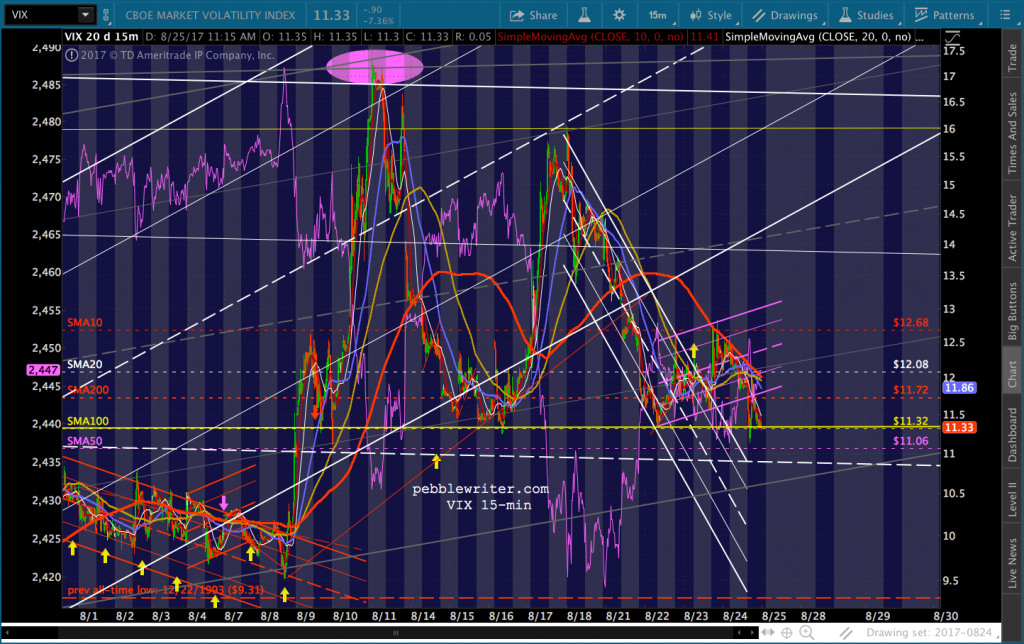 SPX just tagged the white midline. I’d look for a reversal here, if only to the white channel top and SMA5 200. But, it’s going to come down to VIX vs USDJPY.
