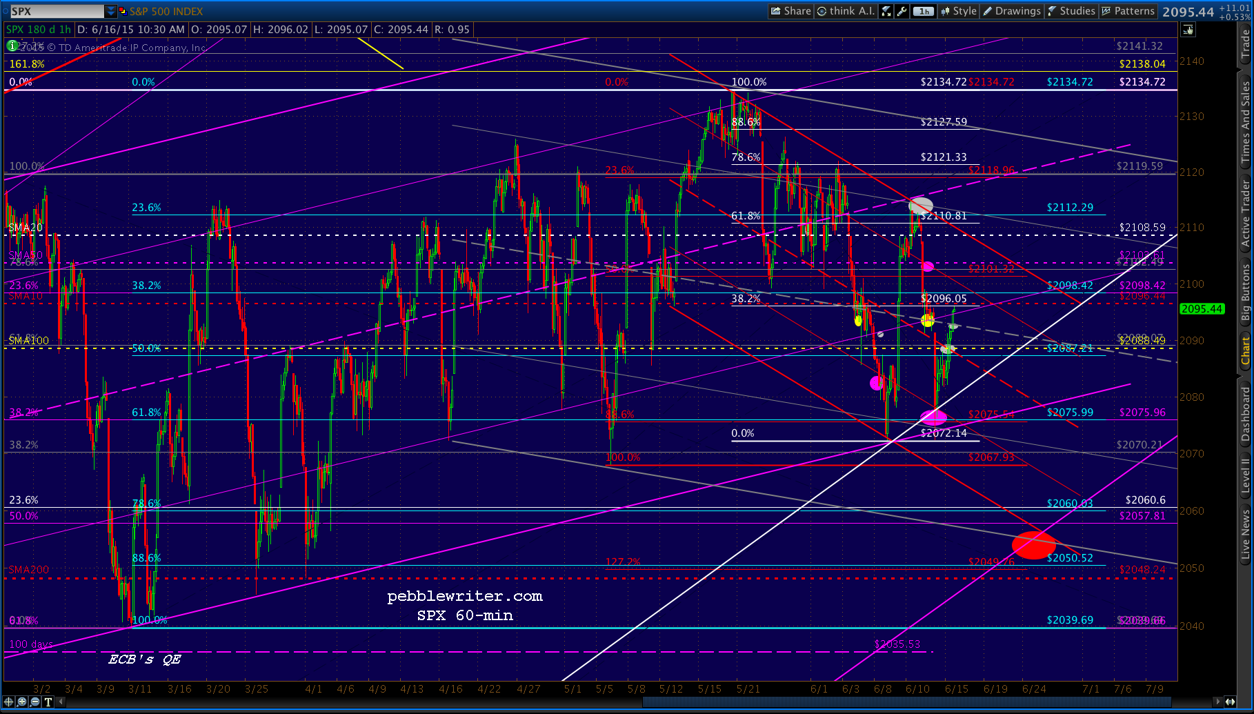 To reach 2050, however, might very well require a full backtest of the .618 Fib at 120.11. So, I’d maintain my short bias for the time being and play the downside with relatively tight stops from here at 2096.