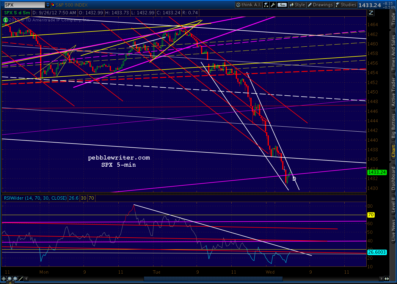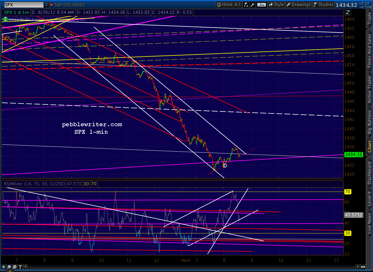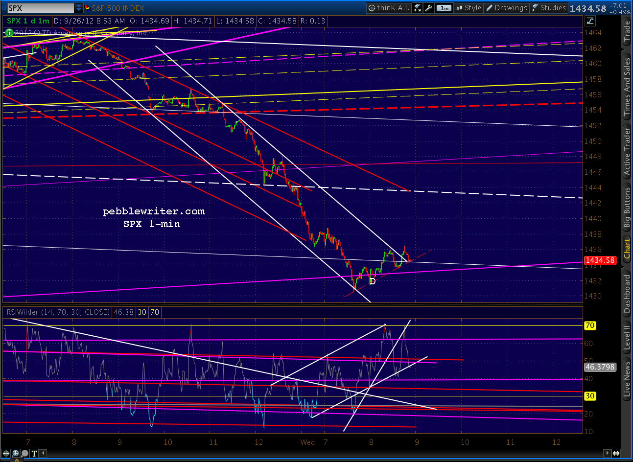 I’m inclined to give my stop a little more leeway, as the 1429 – 1474 .886 is just below at 1434.17. If we don’t arrest by 1430, however, I’m pulling the plug on the longs. At that point, the purple channel has probably failed and we’re not going to bounce until 1412.