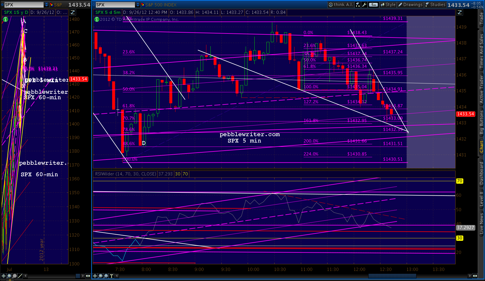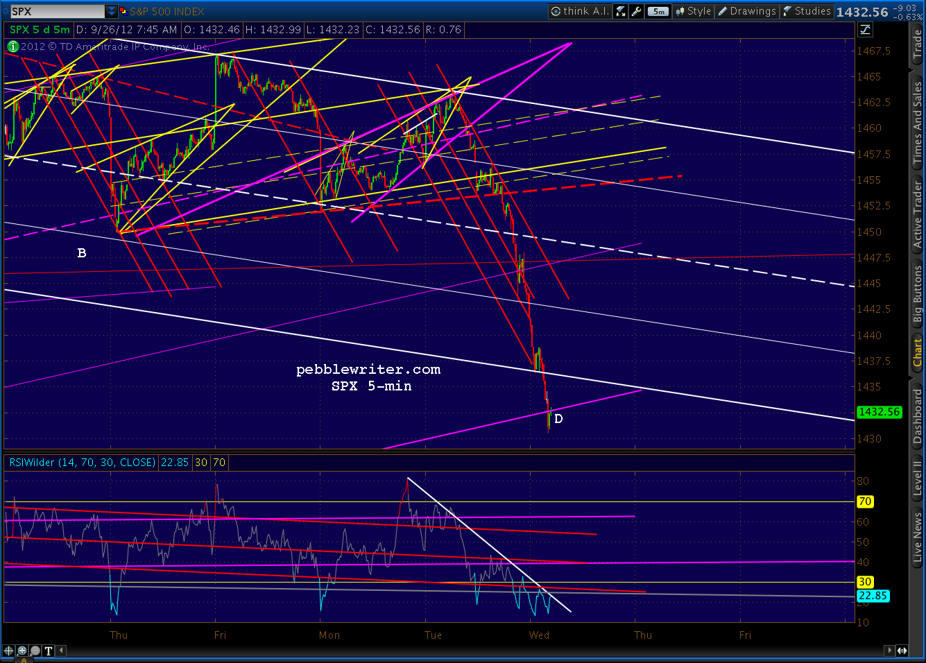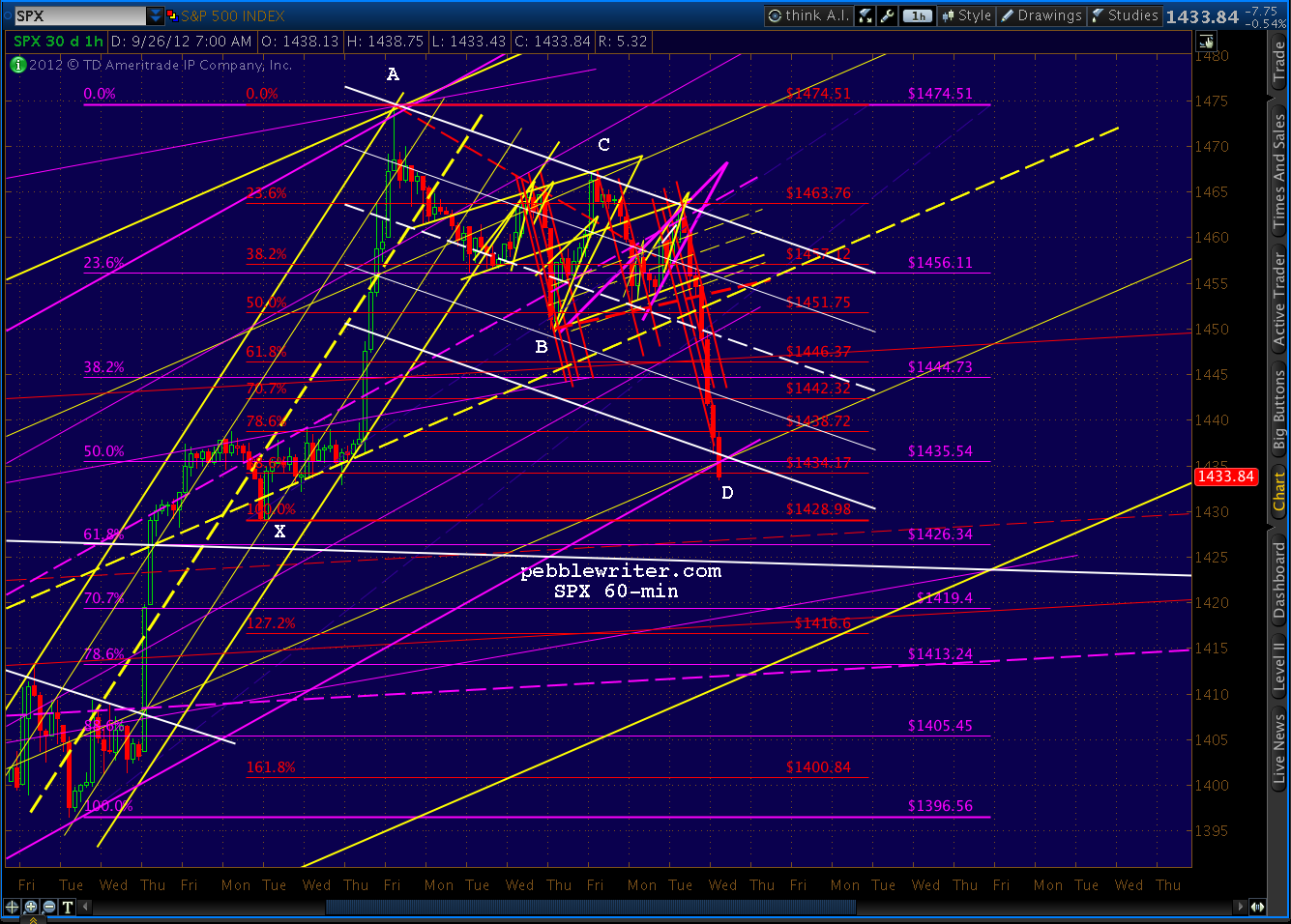 I’m inclined to give my stop a little more leeway, as the 1429 – 1474 .886 is just below at 1434.17. If we don’t arrest by 1430, however, I’m pulling the plug on the longs. At that point, the purple channel has probably failed and we’re not going to bounce until 1412.