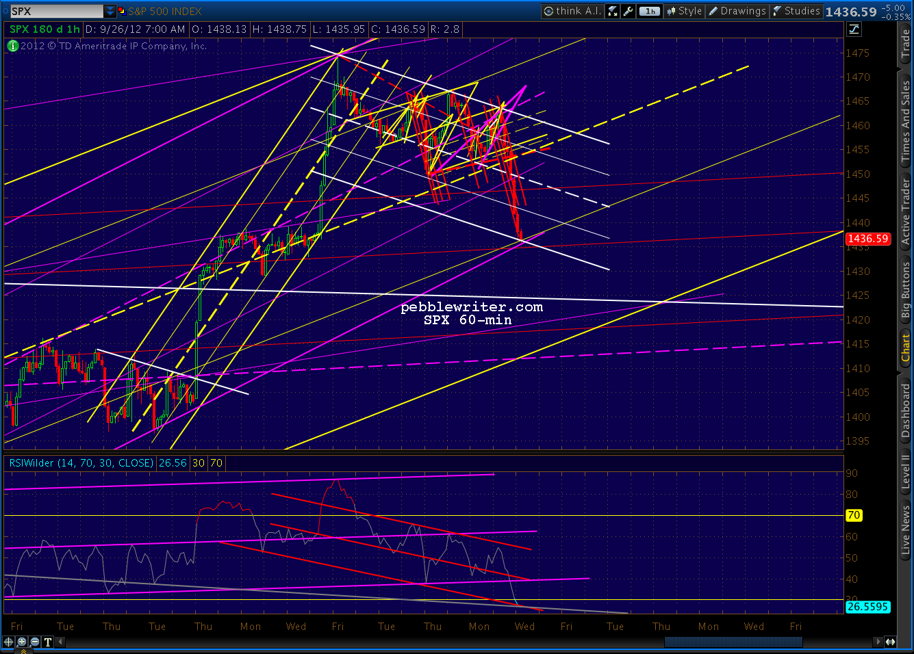 I thought we would get a bounce there and come back to tag my 1439 target Monday, but the market looks like it just can’t wait. The e-minis are down a few points, and that should drag SPX down to that 1439 level on the opening bell.