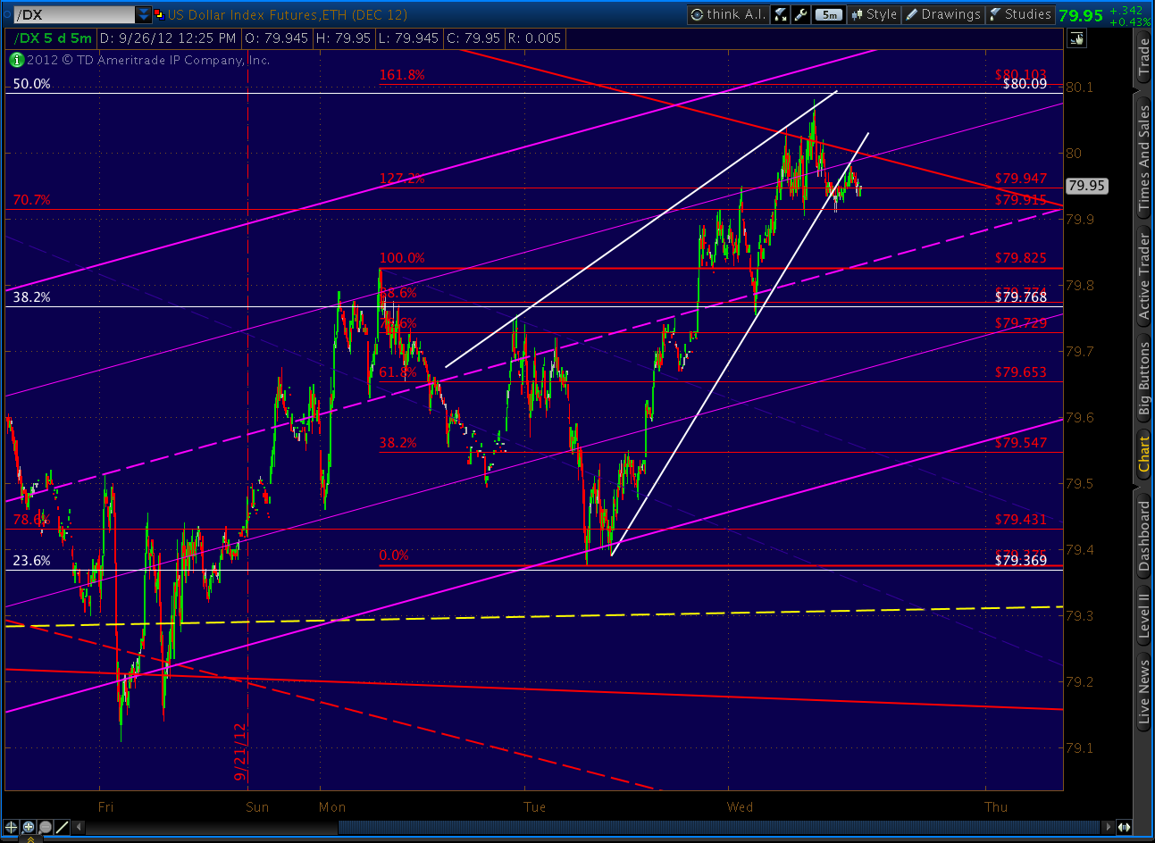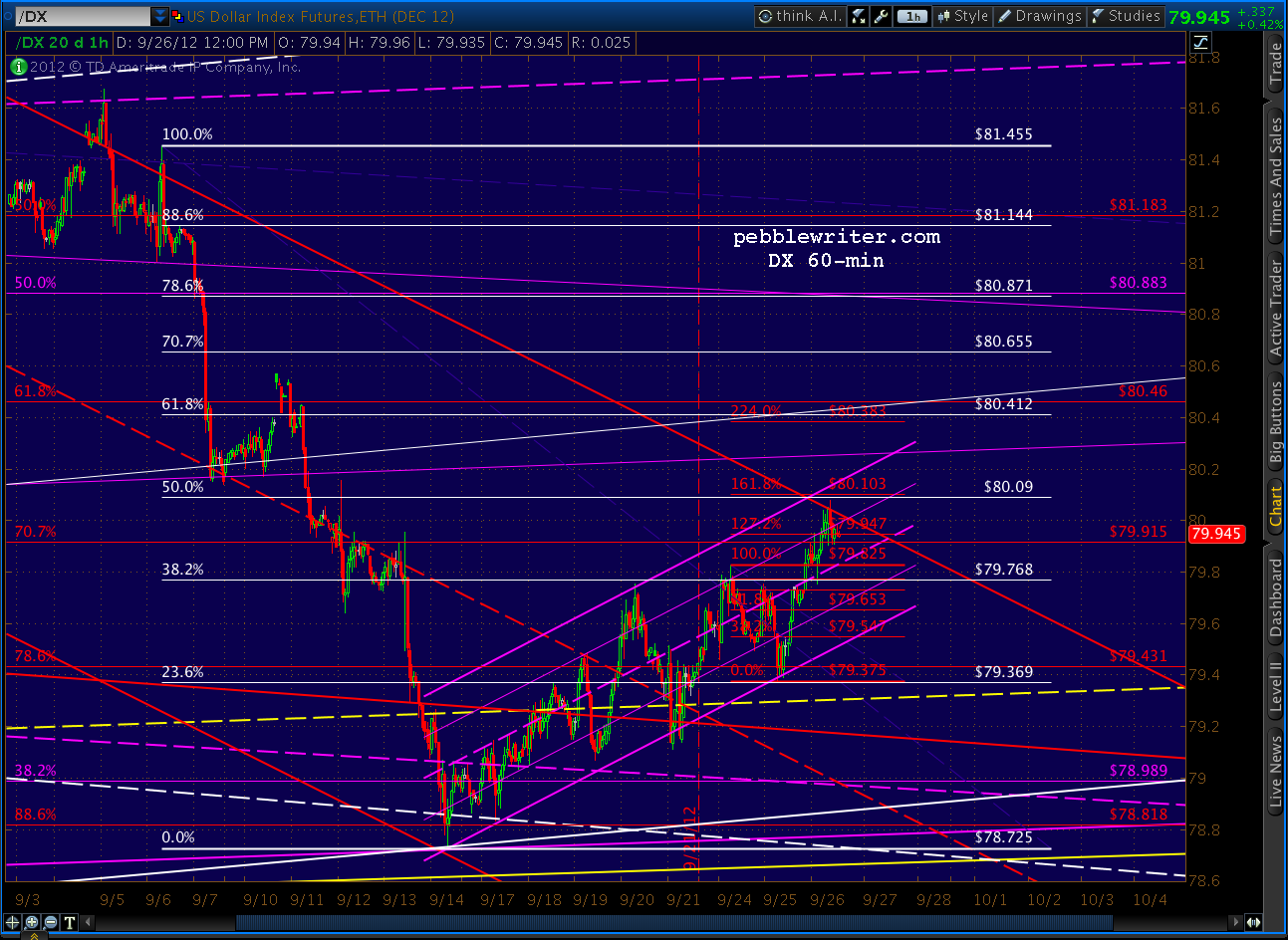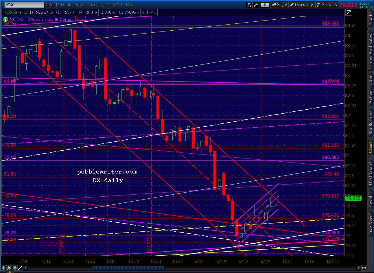 On a day when it feels like we’ve been swimming upstream for hours, I think we’re finally going to be rewarded. Check out the dollar charts. The channel from July has been a very solid predictor of stock action. Recall that it completed a Bat Pattern the other day.