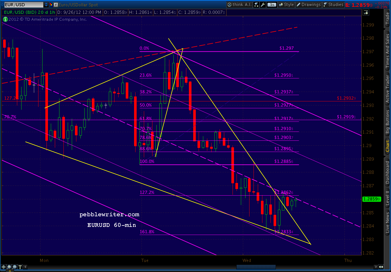 There’s a channel within the big channel that’s easier to see without 20 Fib grids cluttering up the chart. This morning’s low comes at a key intersection I’ve been watching.