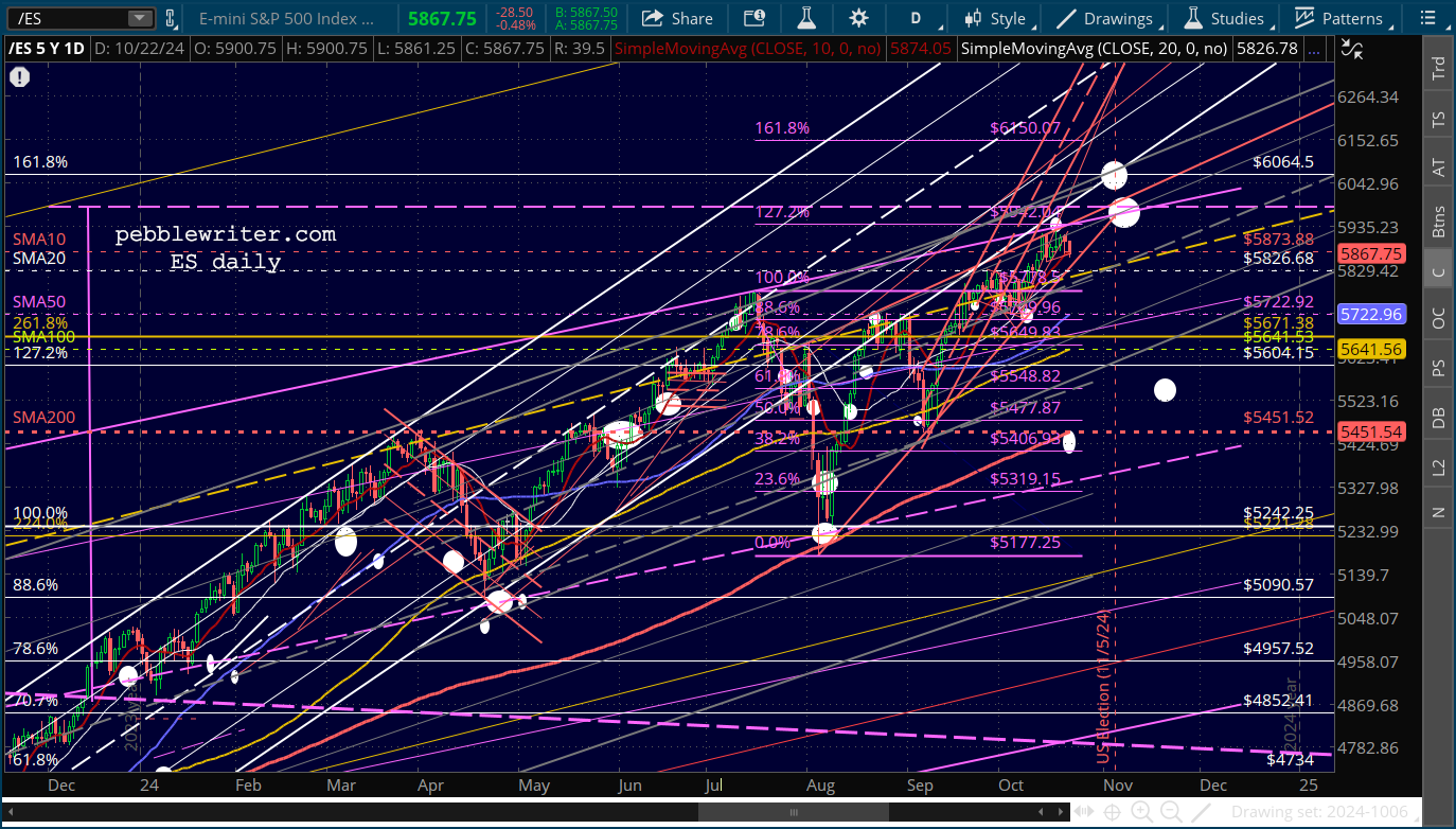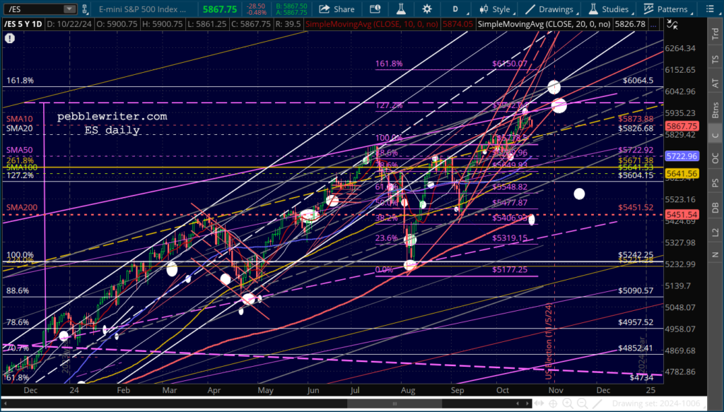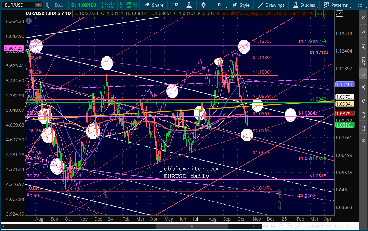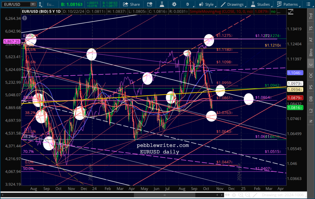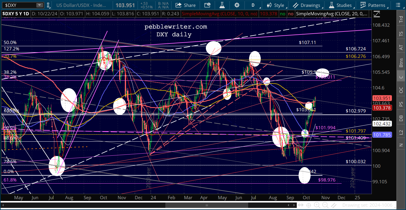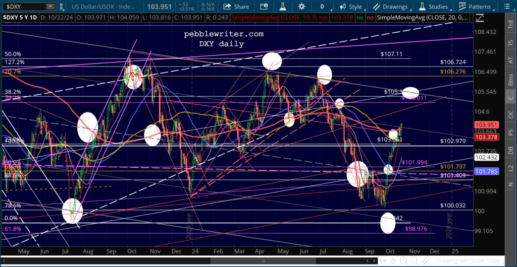 The market is also gnashing its teeth over the strength of the US dollar. Our charts show that the USD has almost reached a relatively important trend line which has presided over three previous bounces. There’s no reason to think it won’t provide another one in the next few days, which to me means that stocks will get one more chance to reach SPX 6009..
