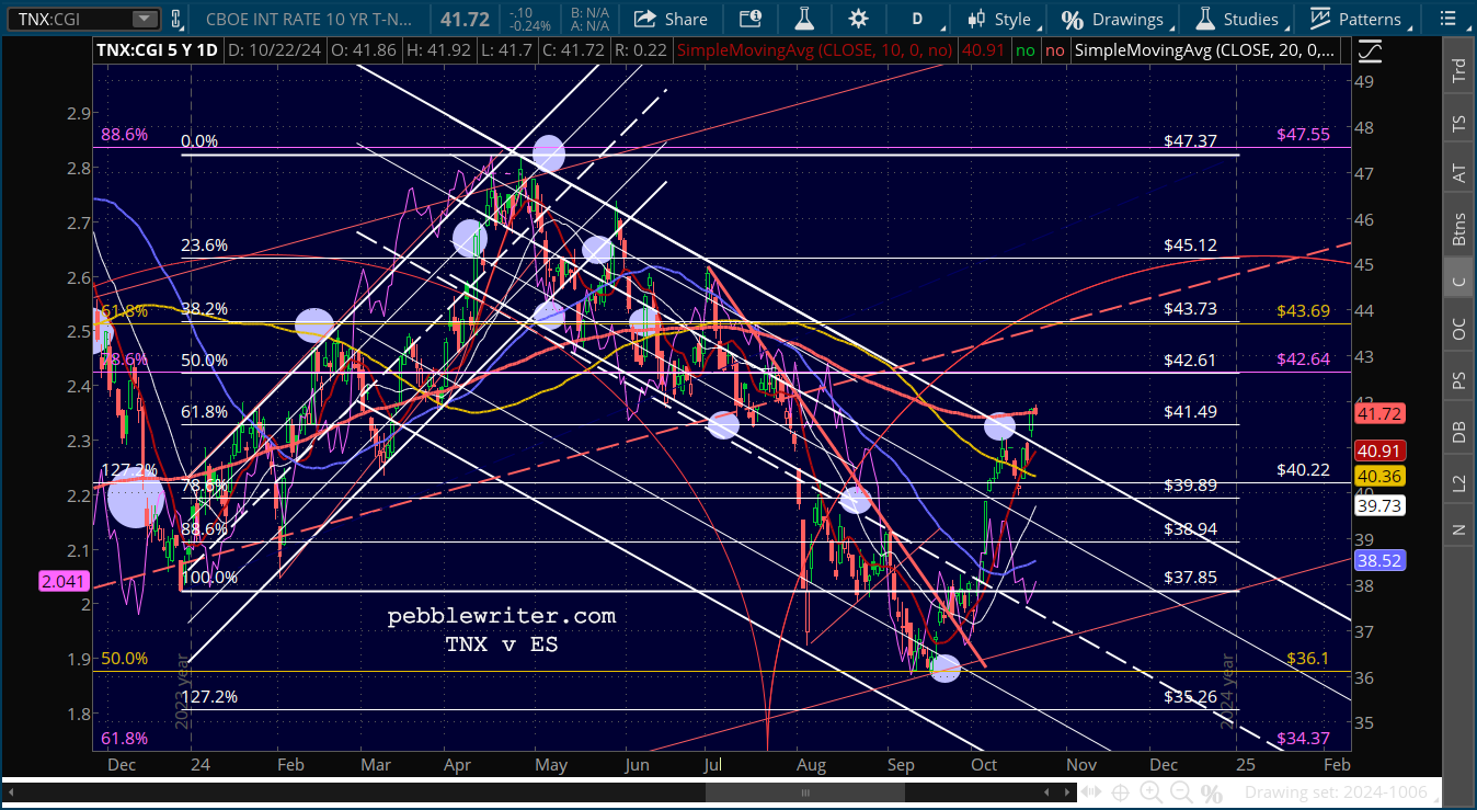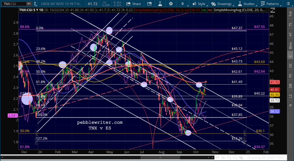 As we discussed yesterday, the 10Y is threatening to break out above the SMA200 and the falling white channel. The rise in interest rates reflects not only the actual but the aditional potential rise in oil and gas prices that would accompany a broadening of an Israel-Iran conflict.