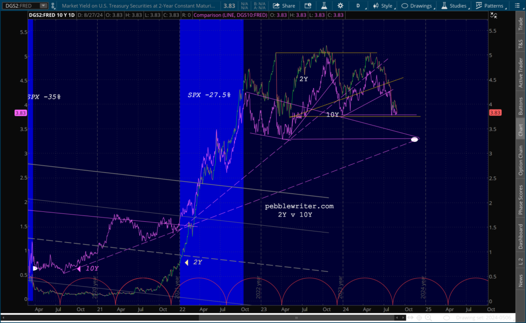 This is quite important as both the 2Y and 10Y are in danger of breaking down, with the 2Y having shown the greater weakness ytd, Remember, its those 2Y yields which, when they fall faster than the 10Y after the 2s10s breaks out (which it has) lead to market crashes.