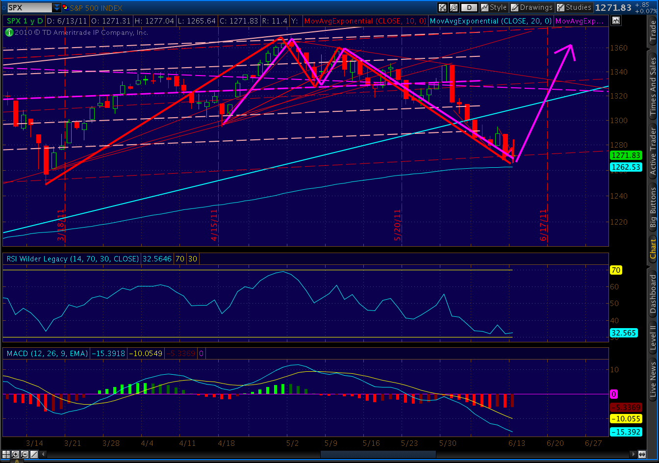 If the SPX slide stops around here (ideally 1263), we would have a butterfly pattern (since the open, visible on the 5 minute) nestled inside another butterfly (also on 5 minute, since Friday’s low) nestled inside a crab (since 4/18 on the daily), nestled inside yet another crab (since 3/16 on daily.) Think of them as four very bullish Russian nesting dolls, collectively indicating an upside of 1329 or better.