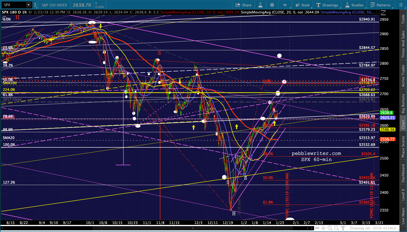 …we get to the same 1.618 Fib backtest SPX indicates. I’ve adjusted SPX’s falling purple channel to fit the recent lows and Jan 18 highs into the .236 and .786 channel lines.