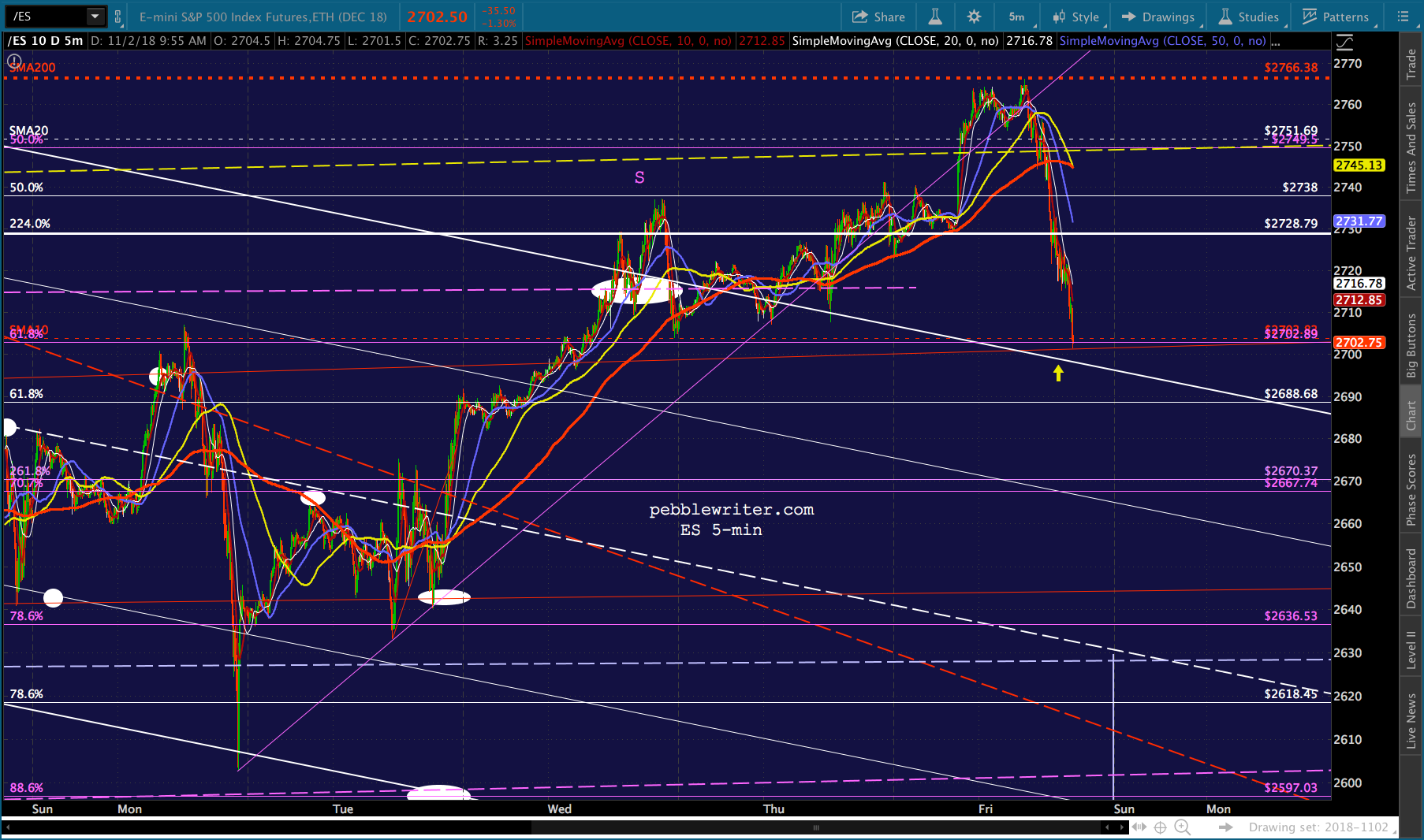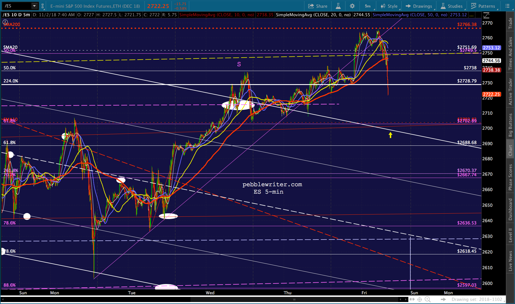 ES has dropped through its 2.24 extension and is suggesting at least a backtest of the white channel from which it broke out on Wednesday — about 25 or so points south.