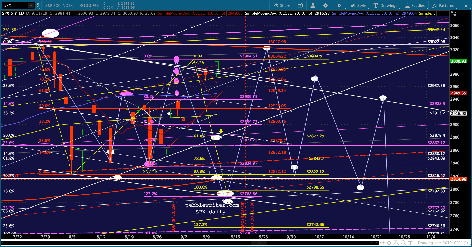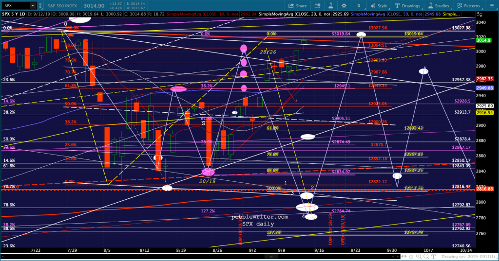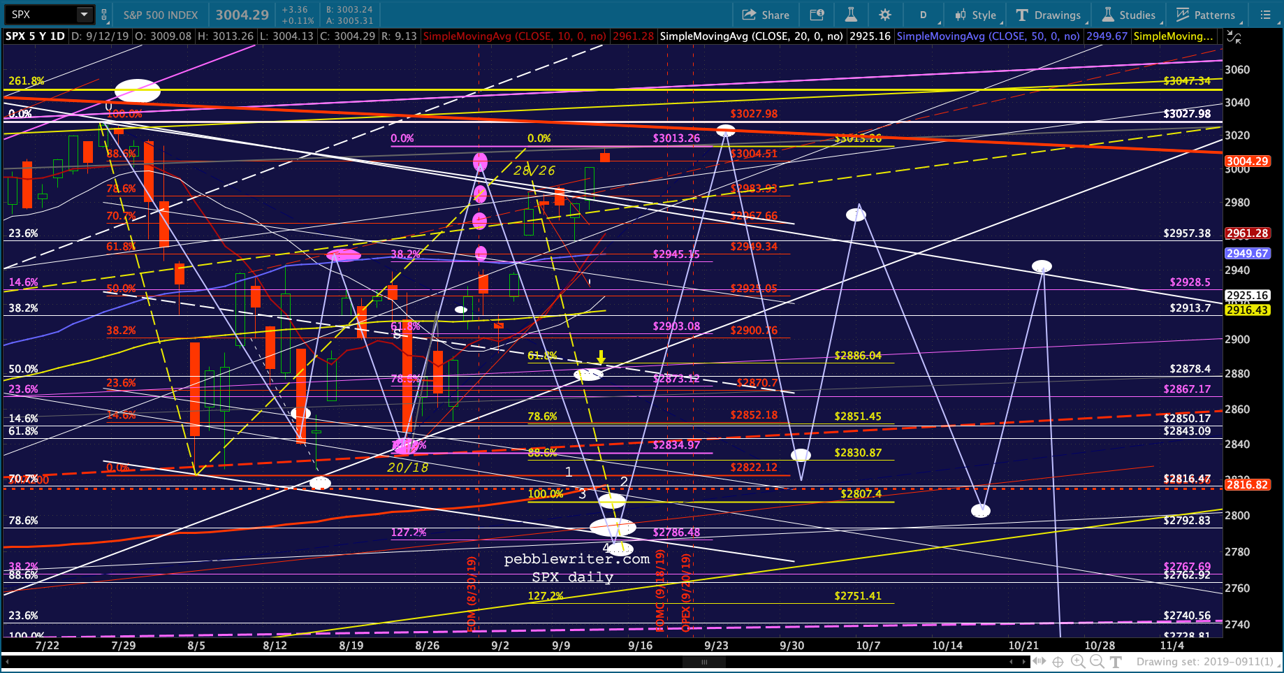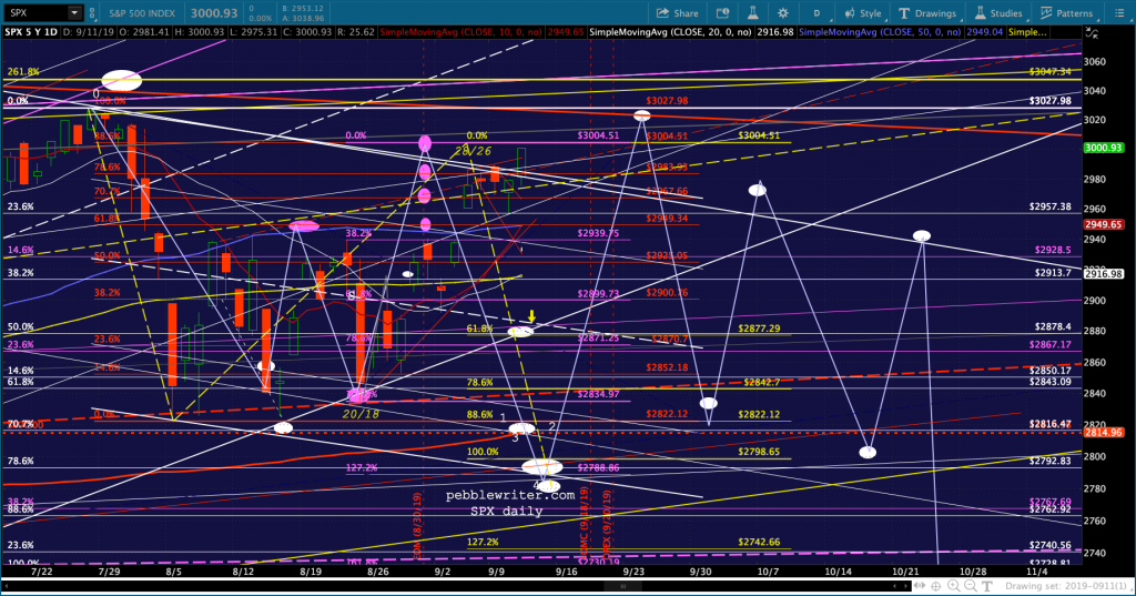 I don’t know how high SPX will pop on the open. But, if it were to reach exactly 3004.51 then the C=A target would be 2798.65 – quite close to the white .786 at 2792.83.