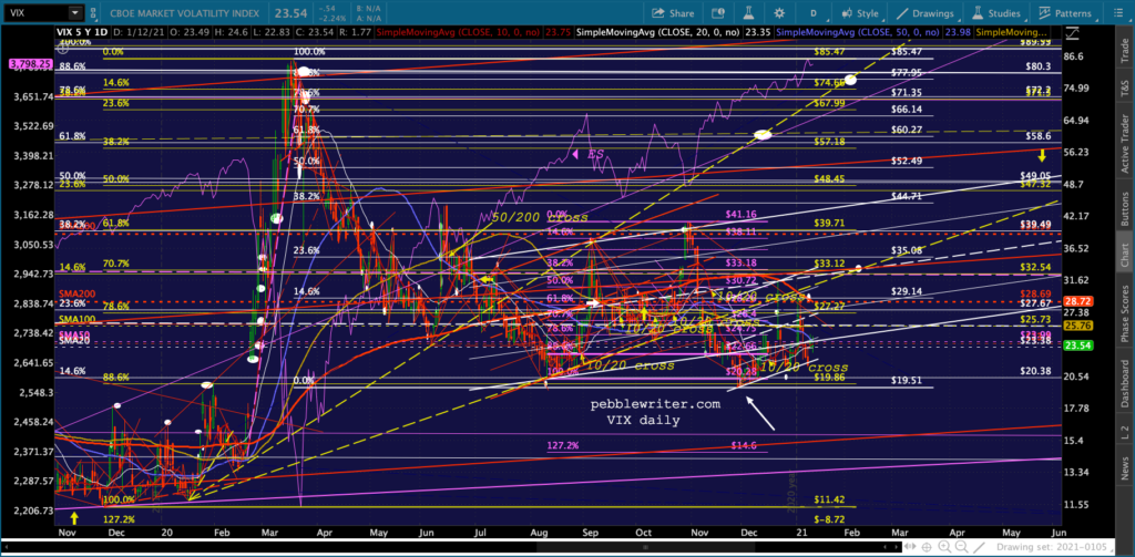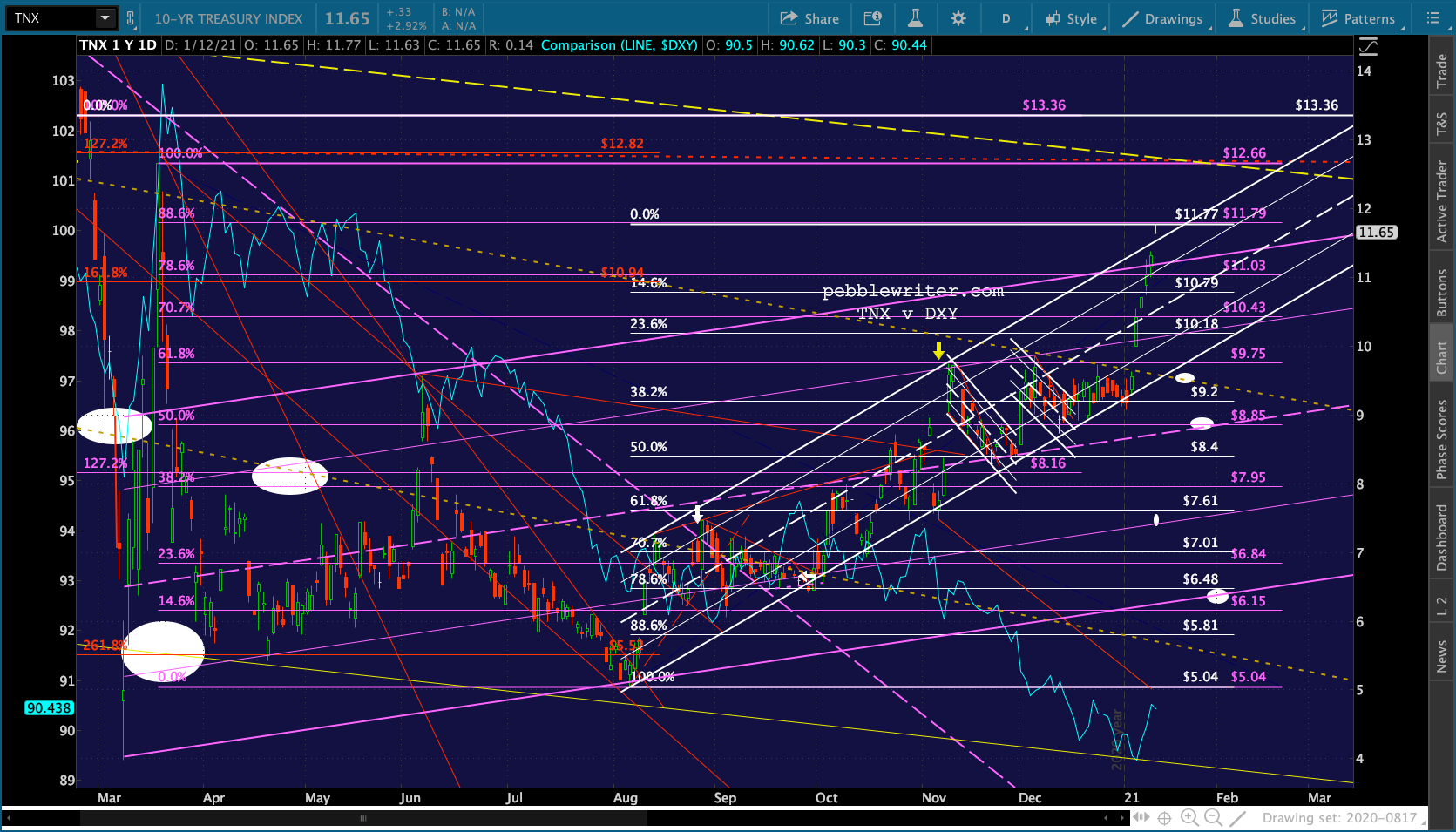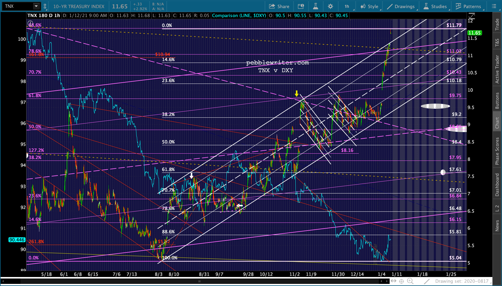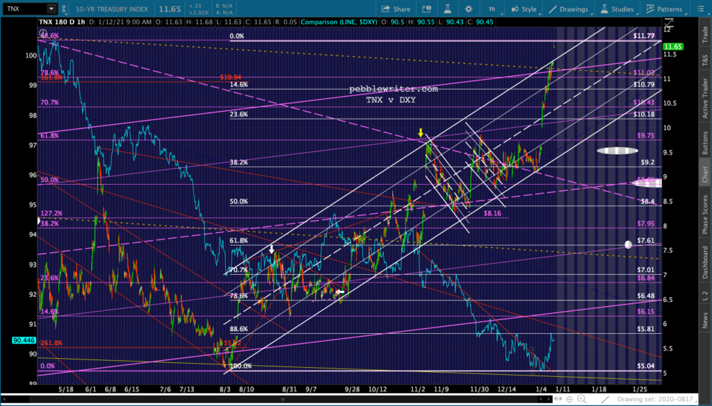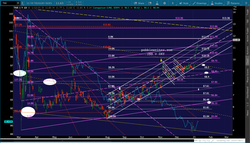 TNX broke out of its rising white channel and purple channel – but to tag a potential reversal at the purple .886 Fib (off the Mar 18, 2020 highs at 1.266.)