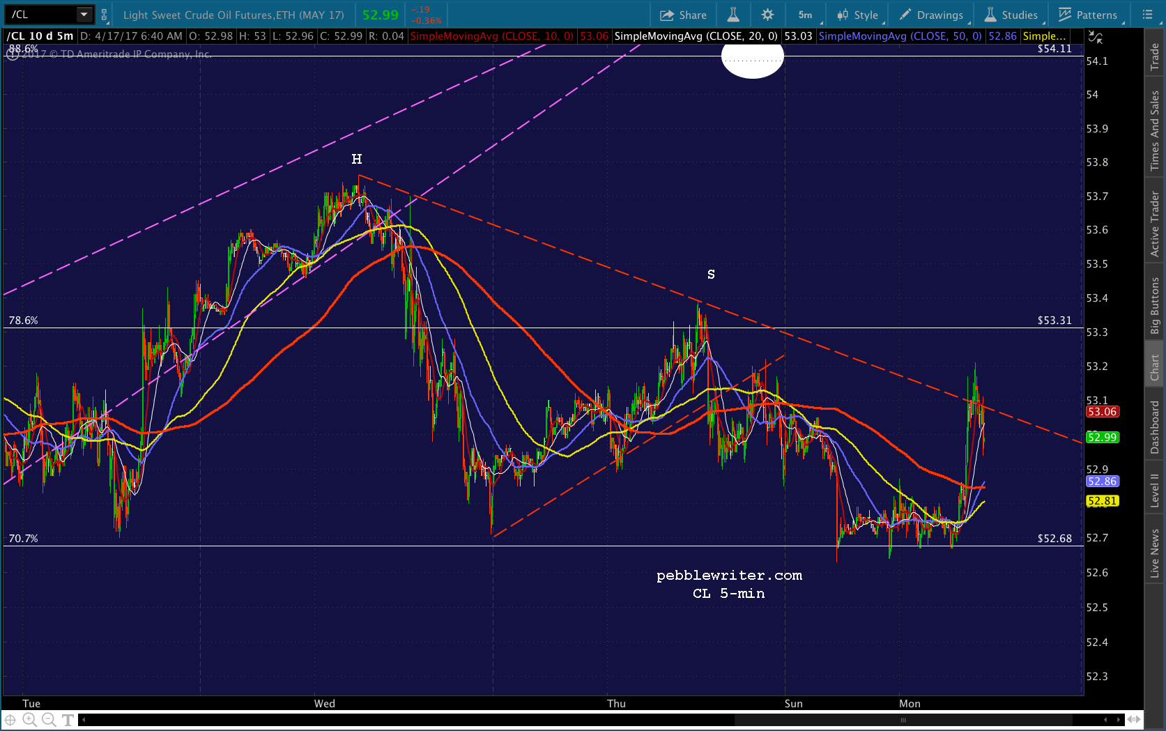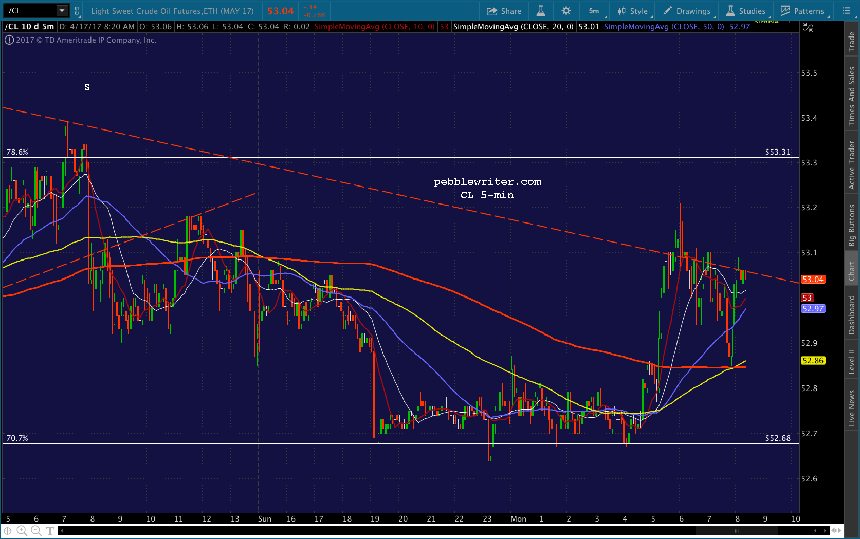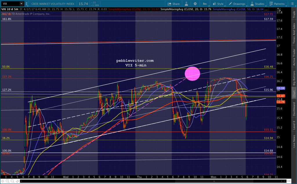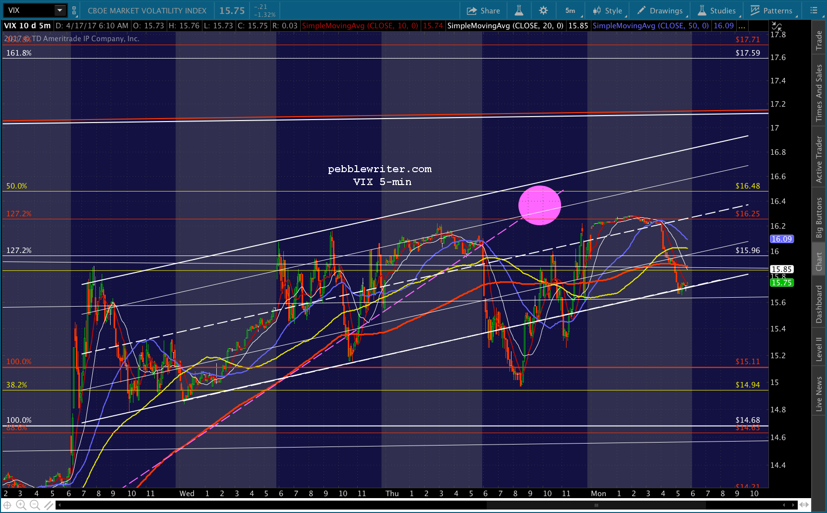 SPX has slipped up past both falling white midlines, which has me a little concerned for the downside case. We’ll see how it does after tagging the SMA5 100. Note that USDJPY and CL are still arguing for lower. Only VIX is keeping it on the rise.