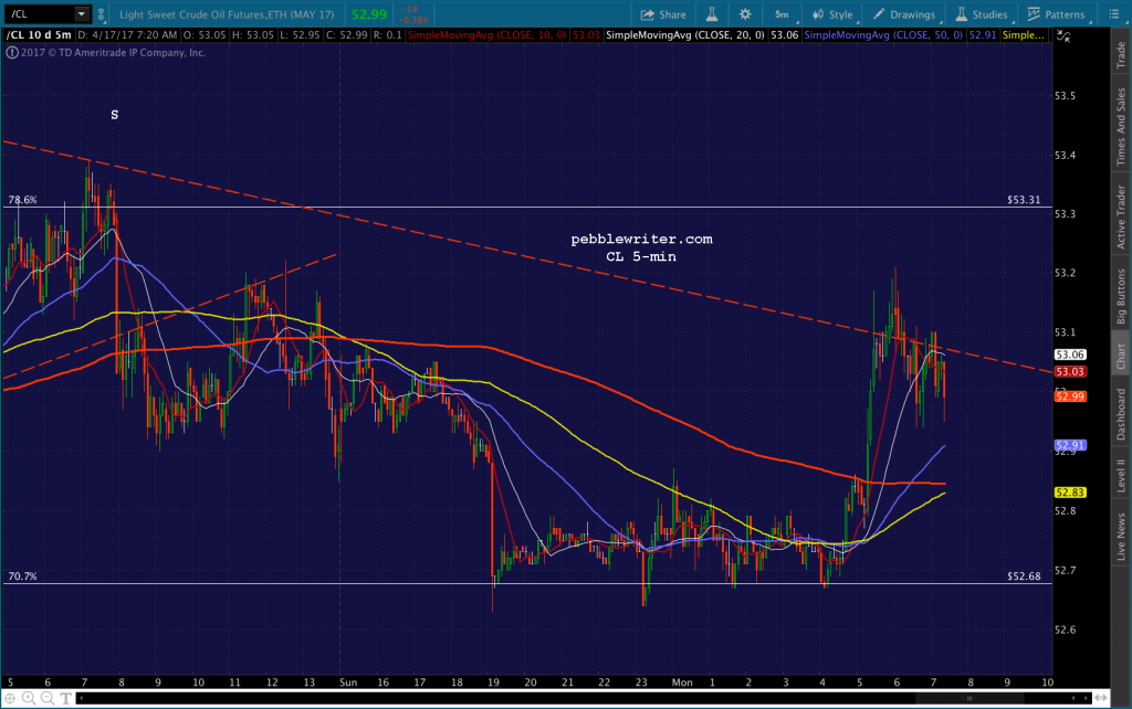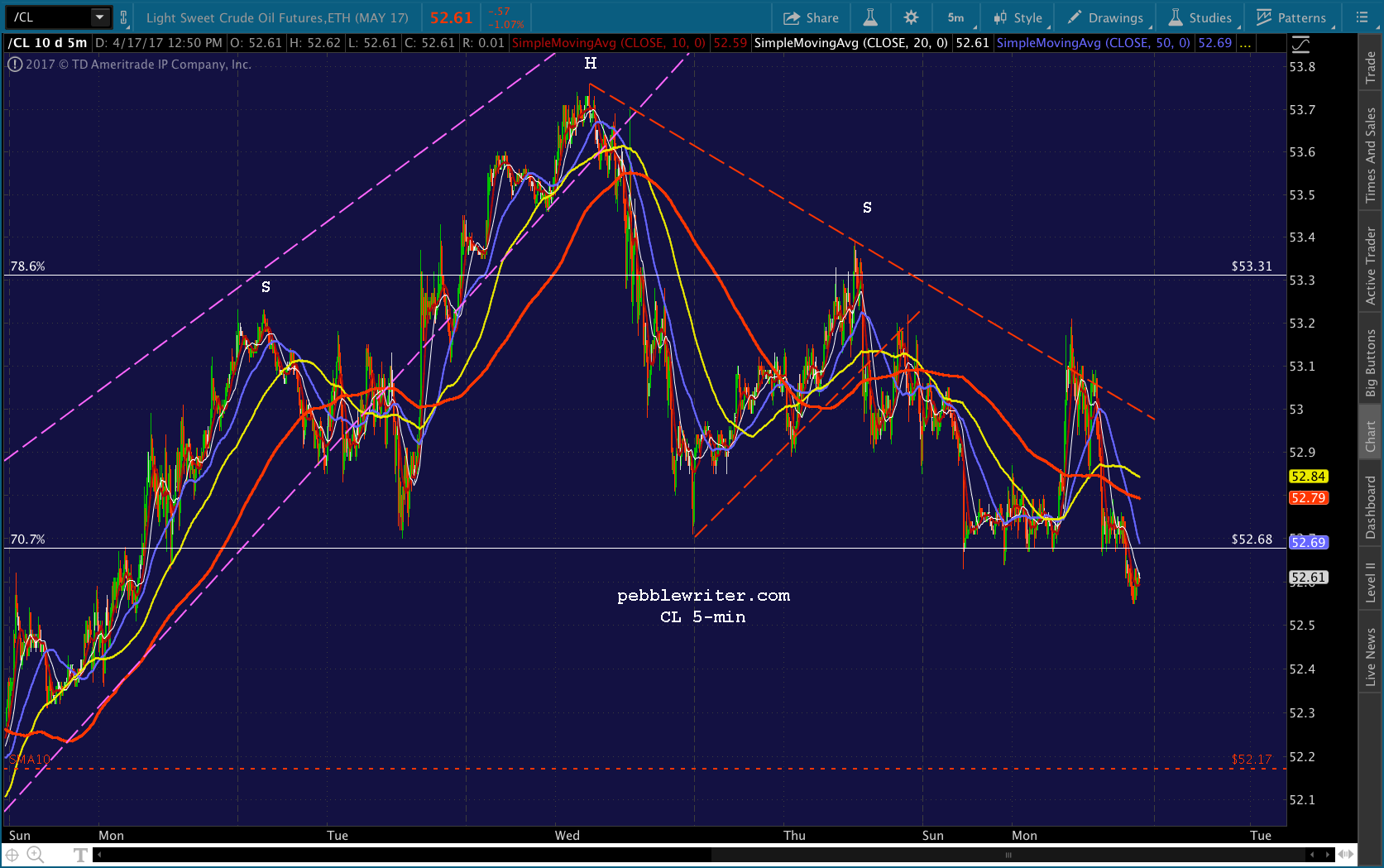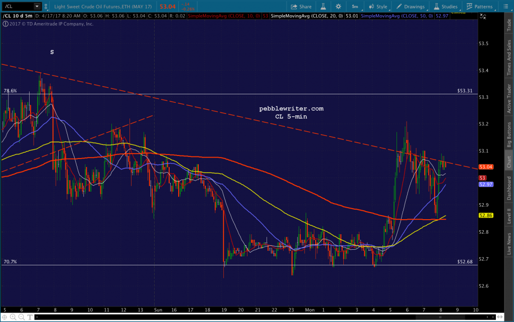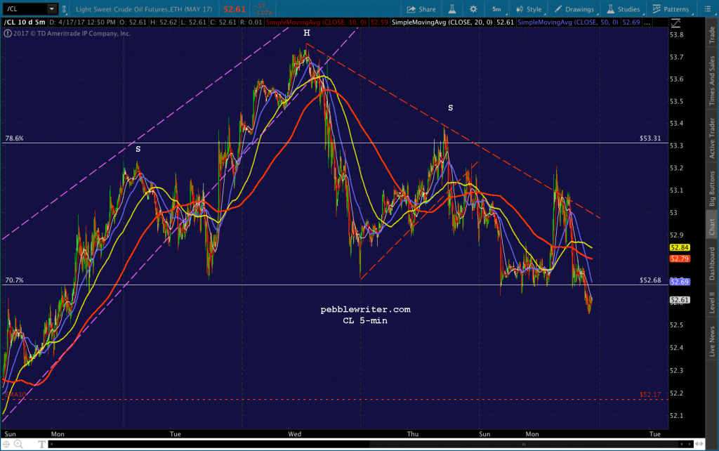SPX has slipped up past both falling white midlines, which has me a little concerned for the downside case. We’ll see how it does after tagging the SMA5 100. Note that USDJPY and CL are still arguing for lower. Only VIX is keeping it on the rise.