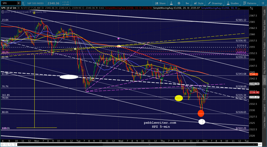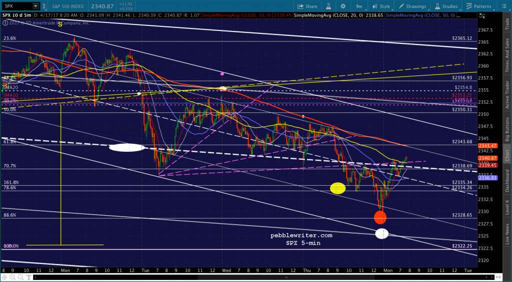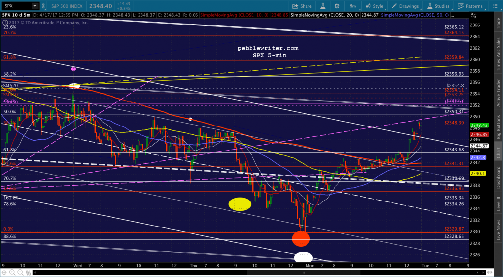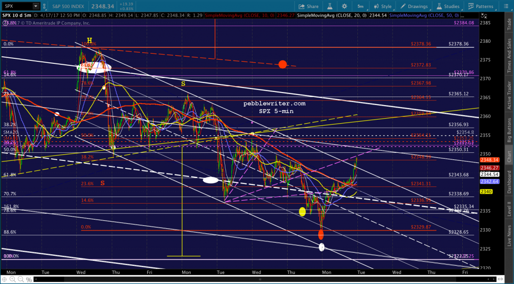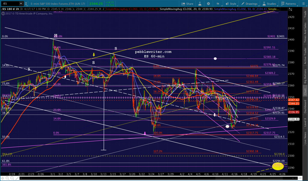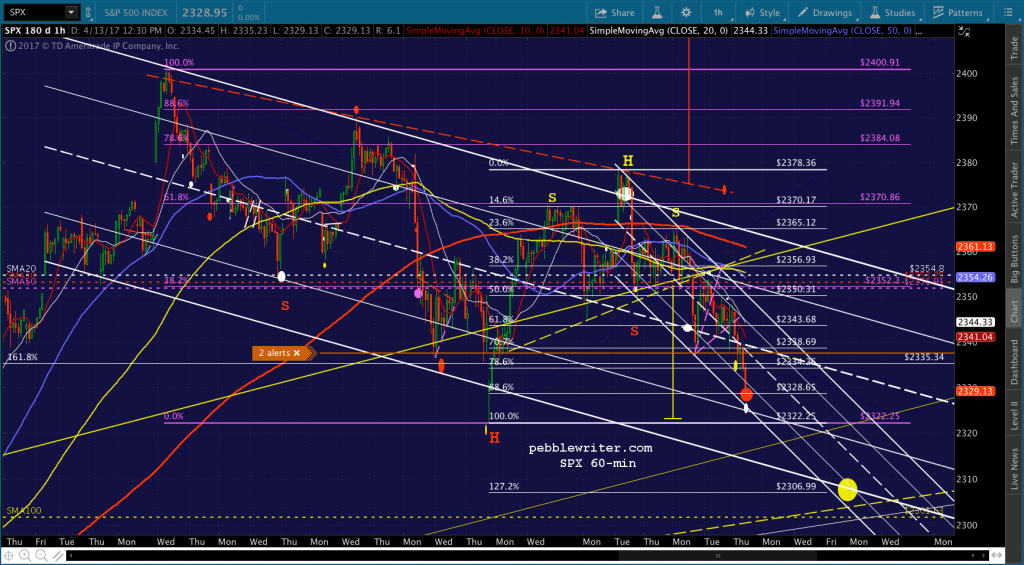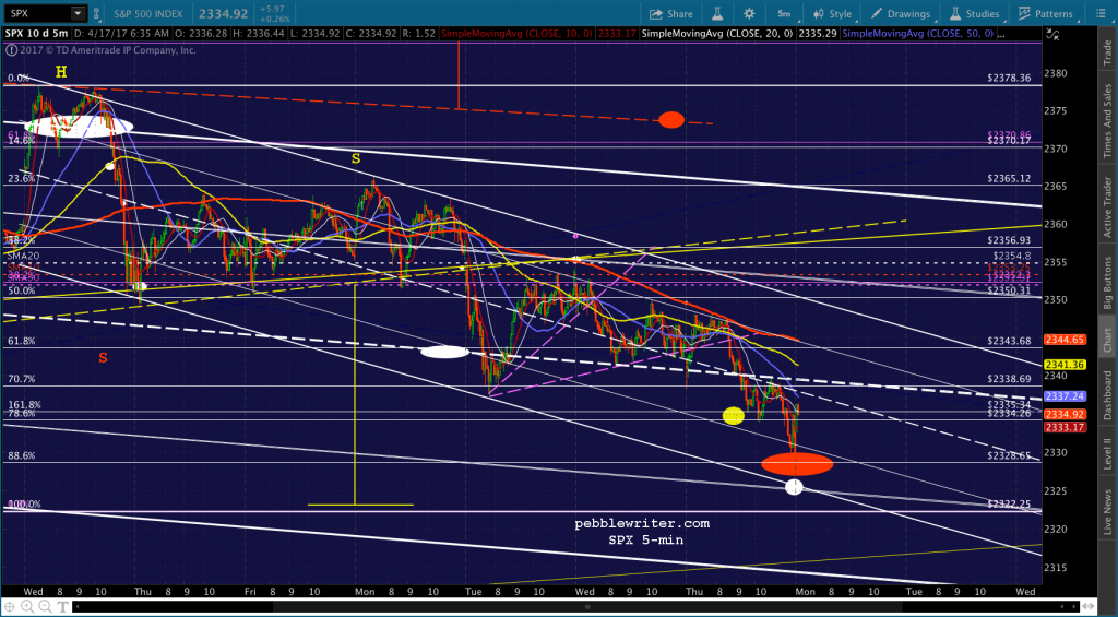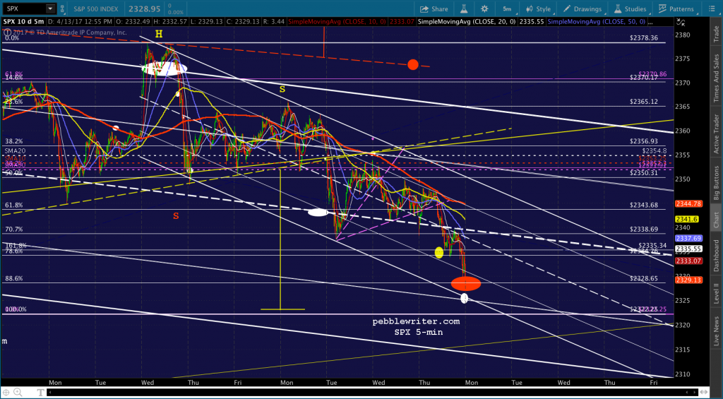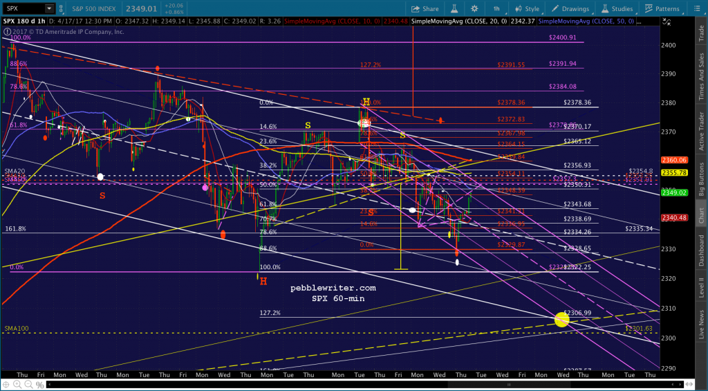 Bottom line, I don’t have a very strong feeling one way or the other about tomorrow’s open. If my 2307 target is in play, it’s likely at least a week away. Interestingly, the falling white channel will intersect with the rising yellow midline at 2307 (the white 1.272) around Apr 25 — which just happens to be the day the Carl Vinson is expected to arrive off the South Korean coast.