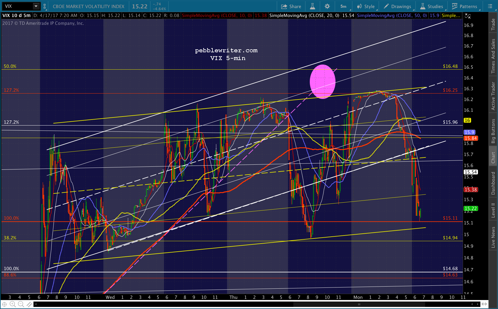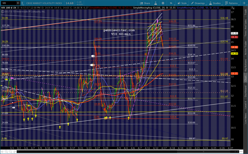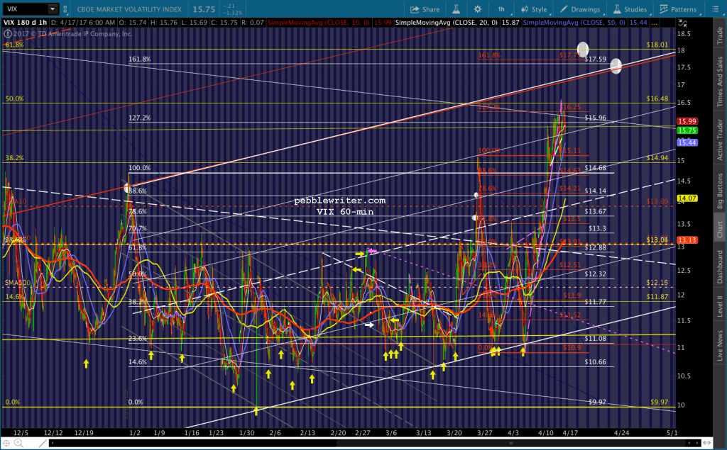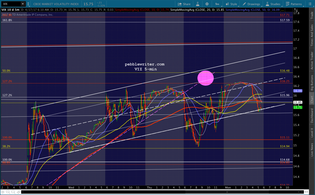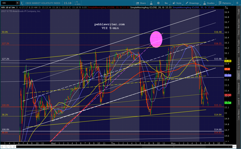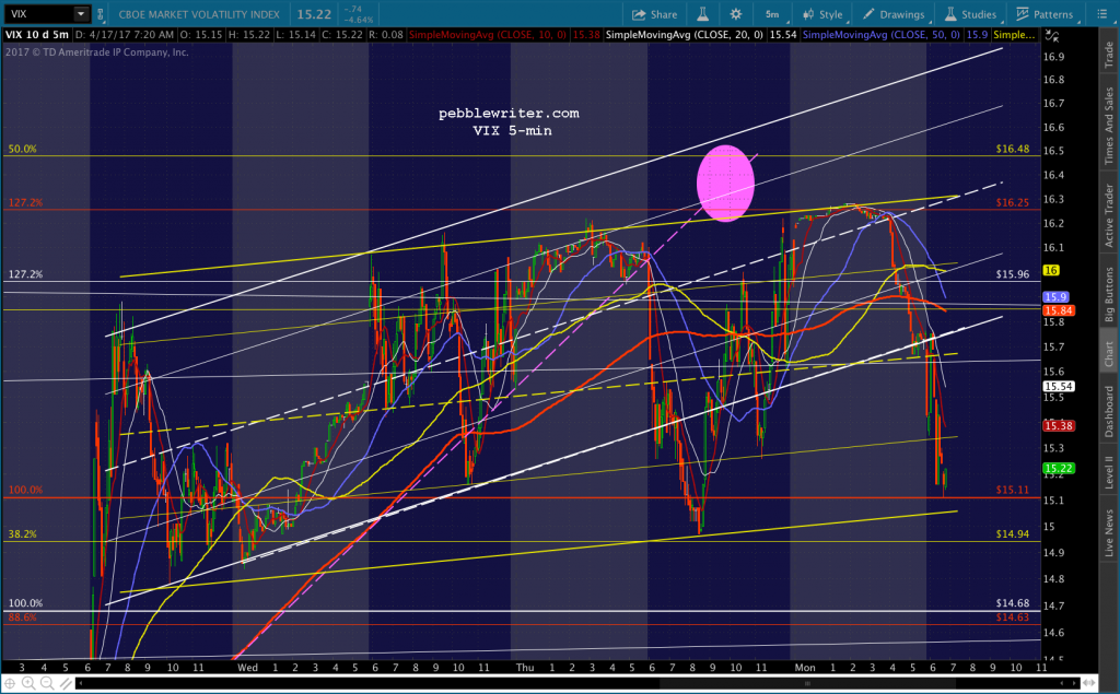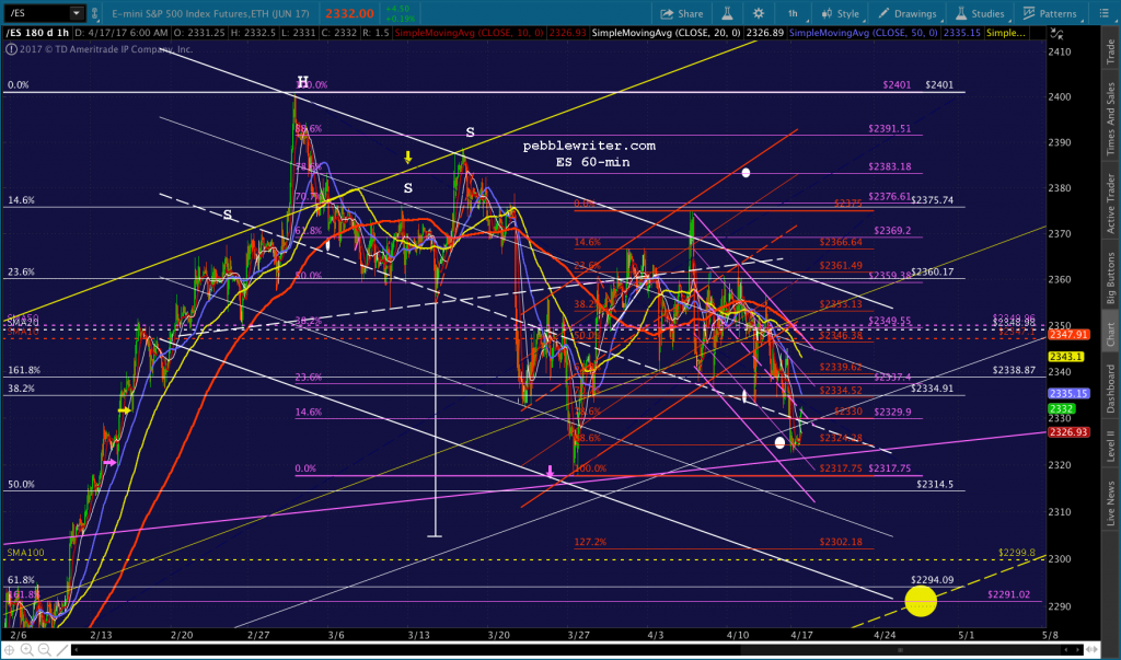 Bottom line, I don’t have a very strong feeling one way or the other about tomorrow’s open. If my 2307 target is in play, it’s likely at least a week away. Interestingly, the falling white channel will intersect with the rising yellow midline at 2307 (the white 1.272) around Apr 25 — which just happens to be the day the Carl Vinson is expected to arrive off the South Korean coast.