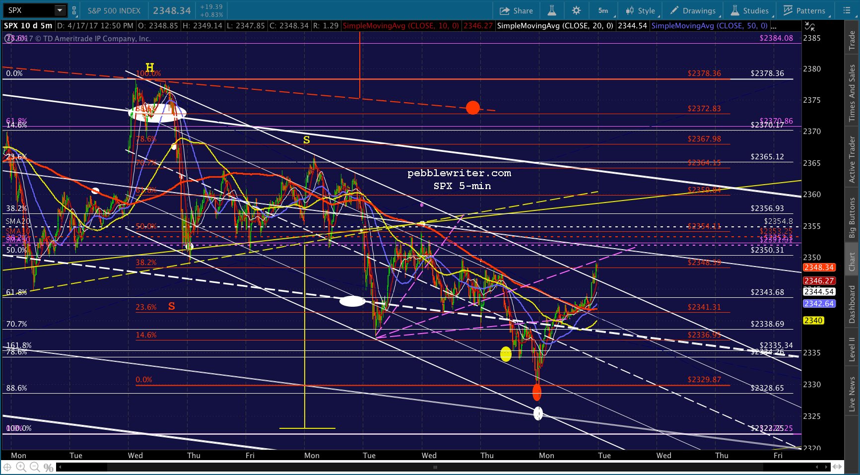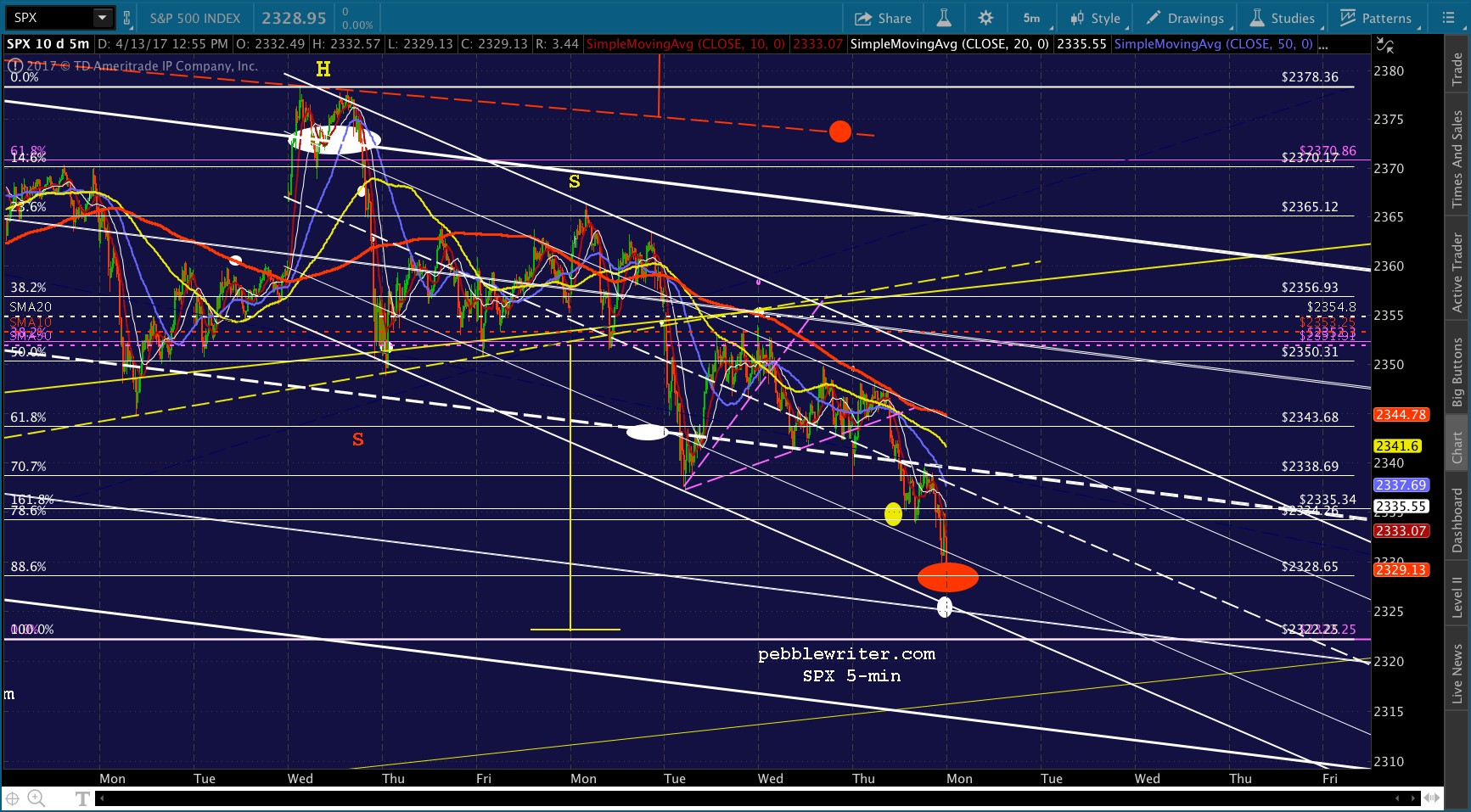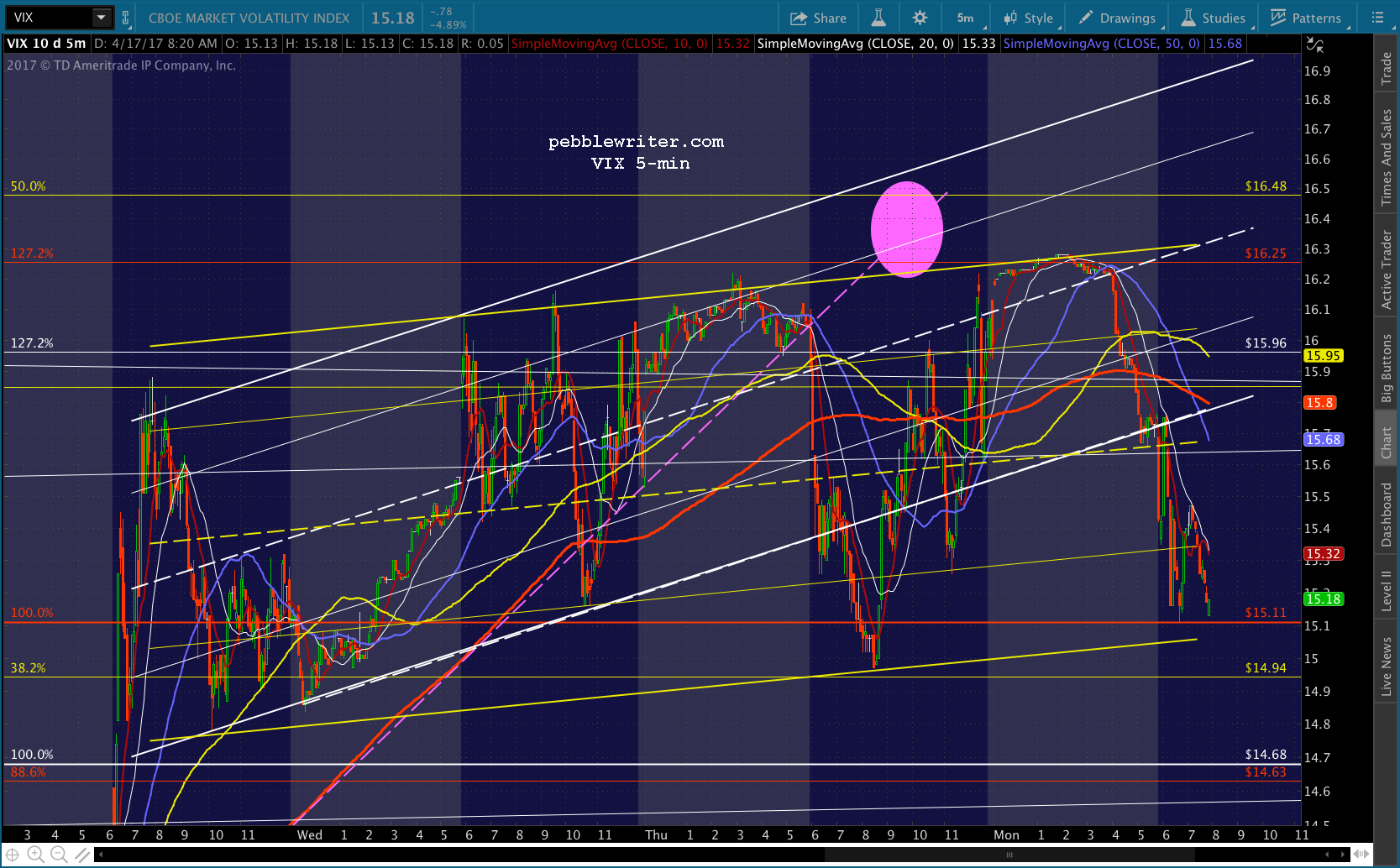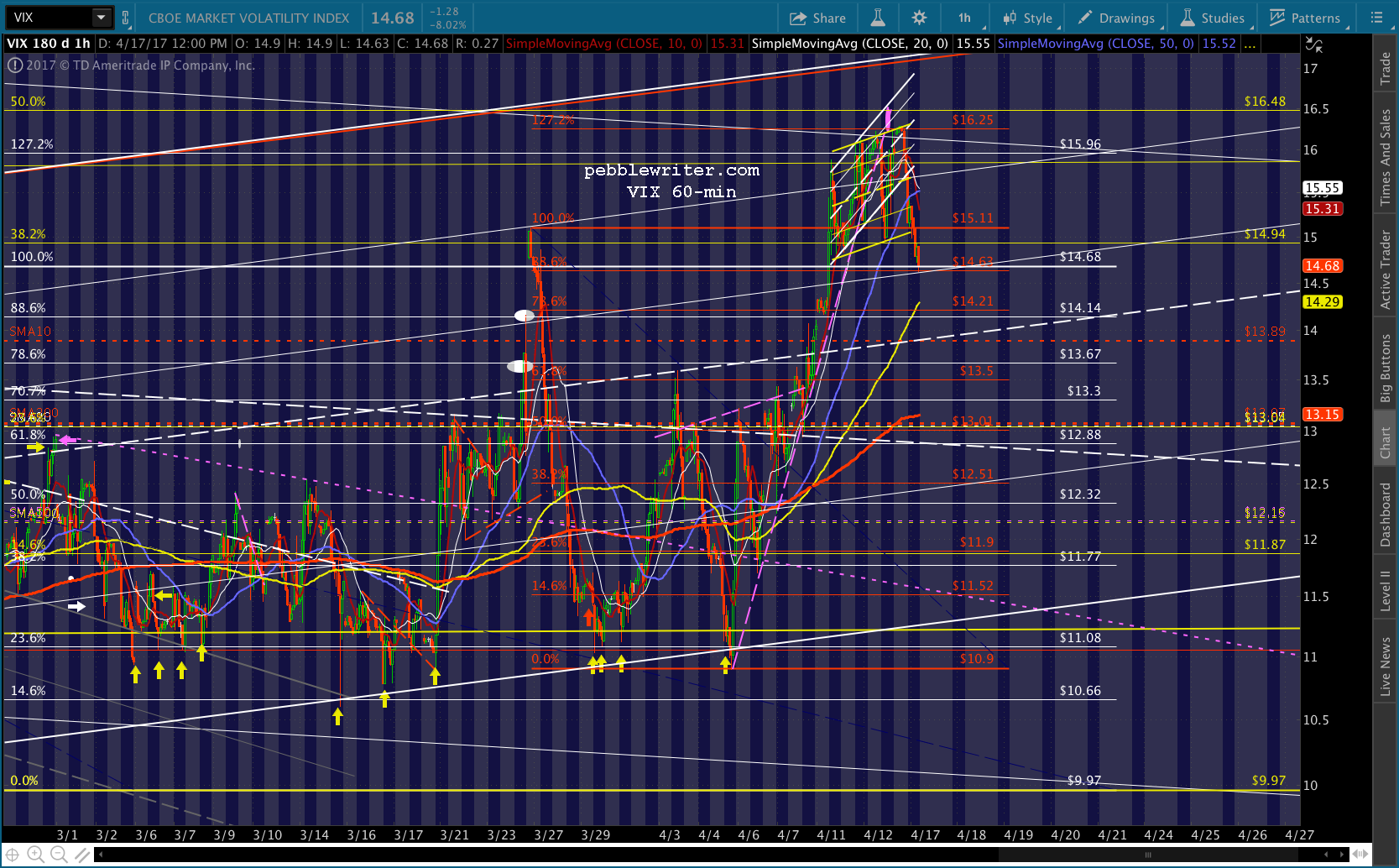 Bottom line, I don’t have a very strong feeling one way or the other about tomorrow’s open. If my 2307 target is in play, it’s likely at least a week away. Interestingly, the falling white channel will intersect with the rising yellow midline at 2307 (the white 1.272) around Apr 25 — which just happens to be the day the Carl Vinson is expected to arrive off the South Korean coast.