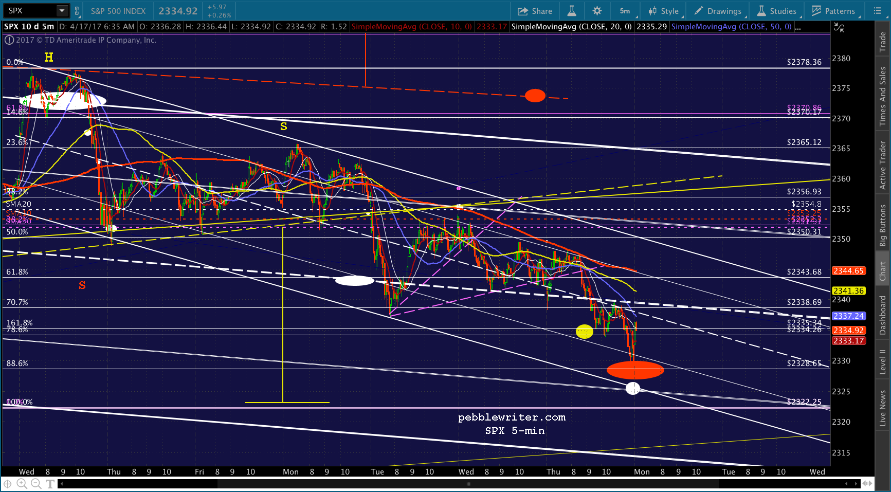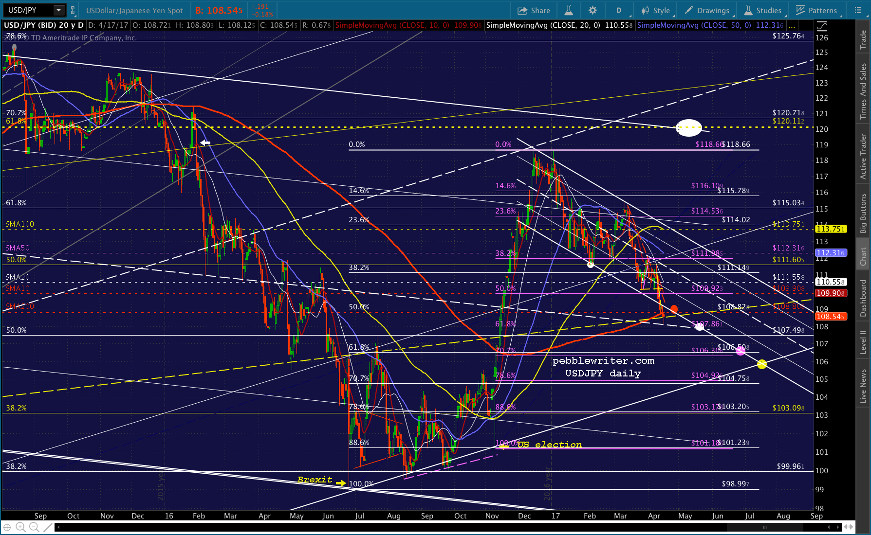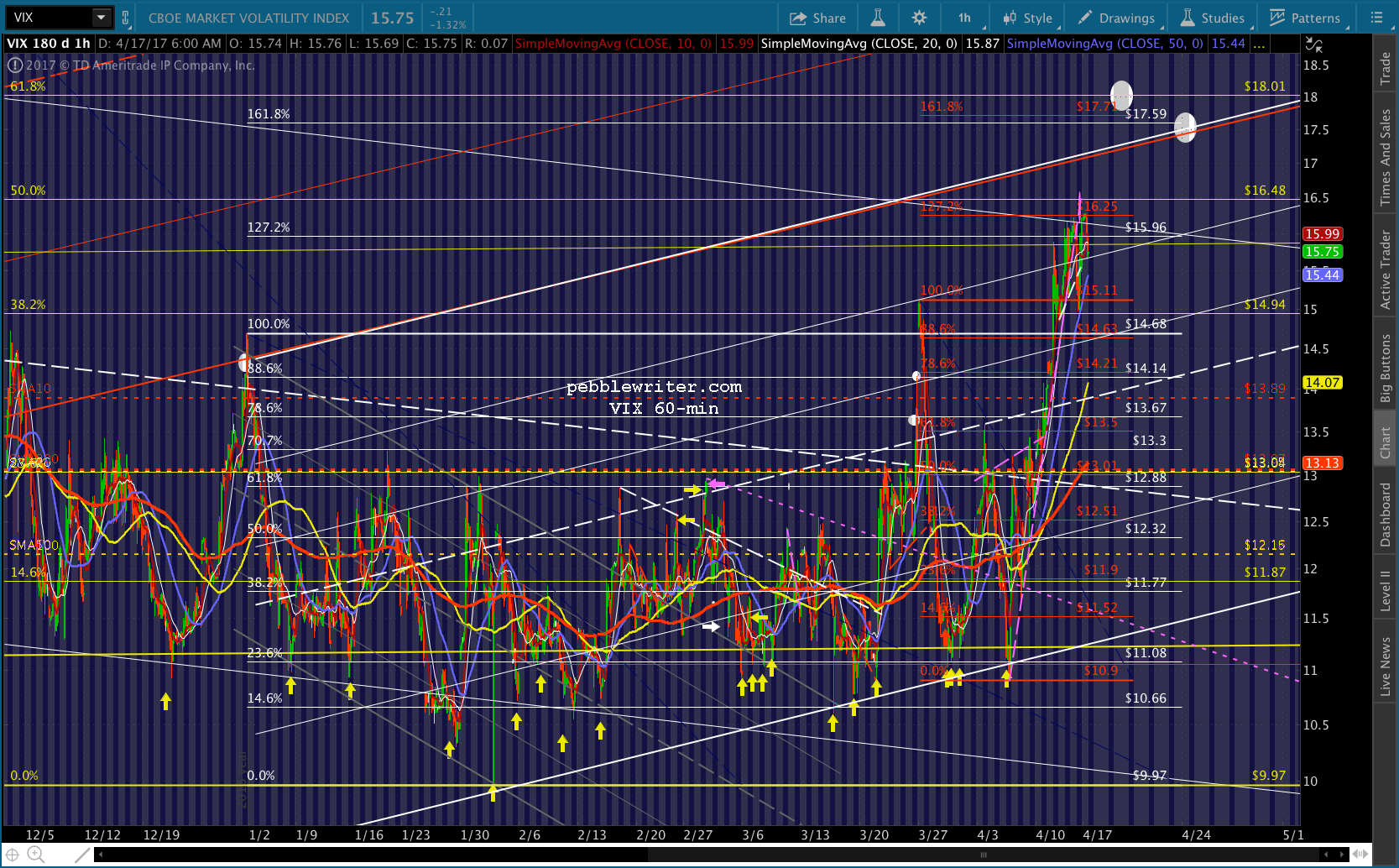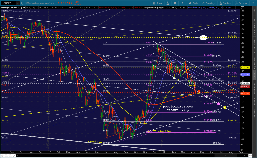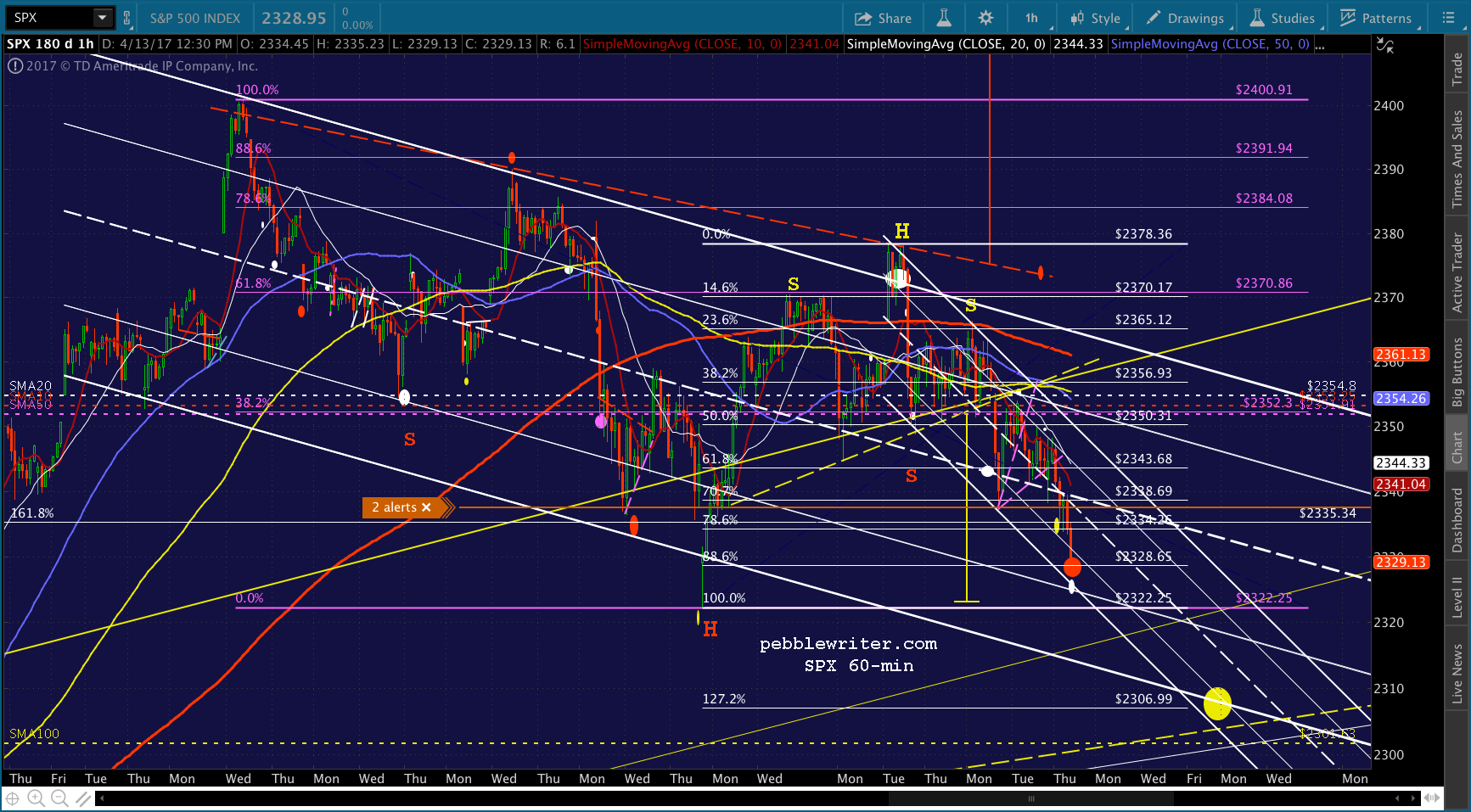 Bottom line, I don’t have a very strong feeling one way or the other about tomorrow’s open. If my 2307 target is in play, it’s likely at least a week away. Interestingly, the falling white channel will intersect with the rising yellow midline at 2307 (the white 1.272) around Apr 25 — which just happens to be the day the Carl Vinson is expected to arrive off the South Korean coast.