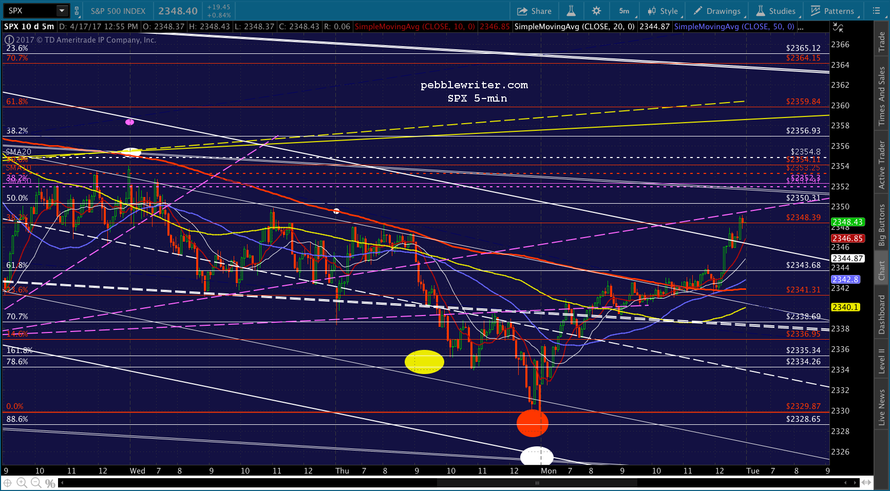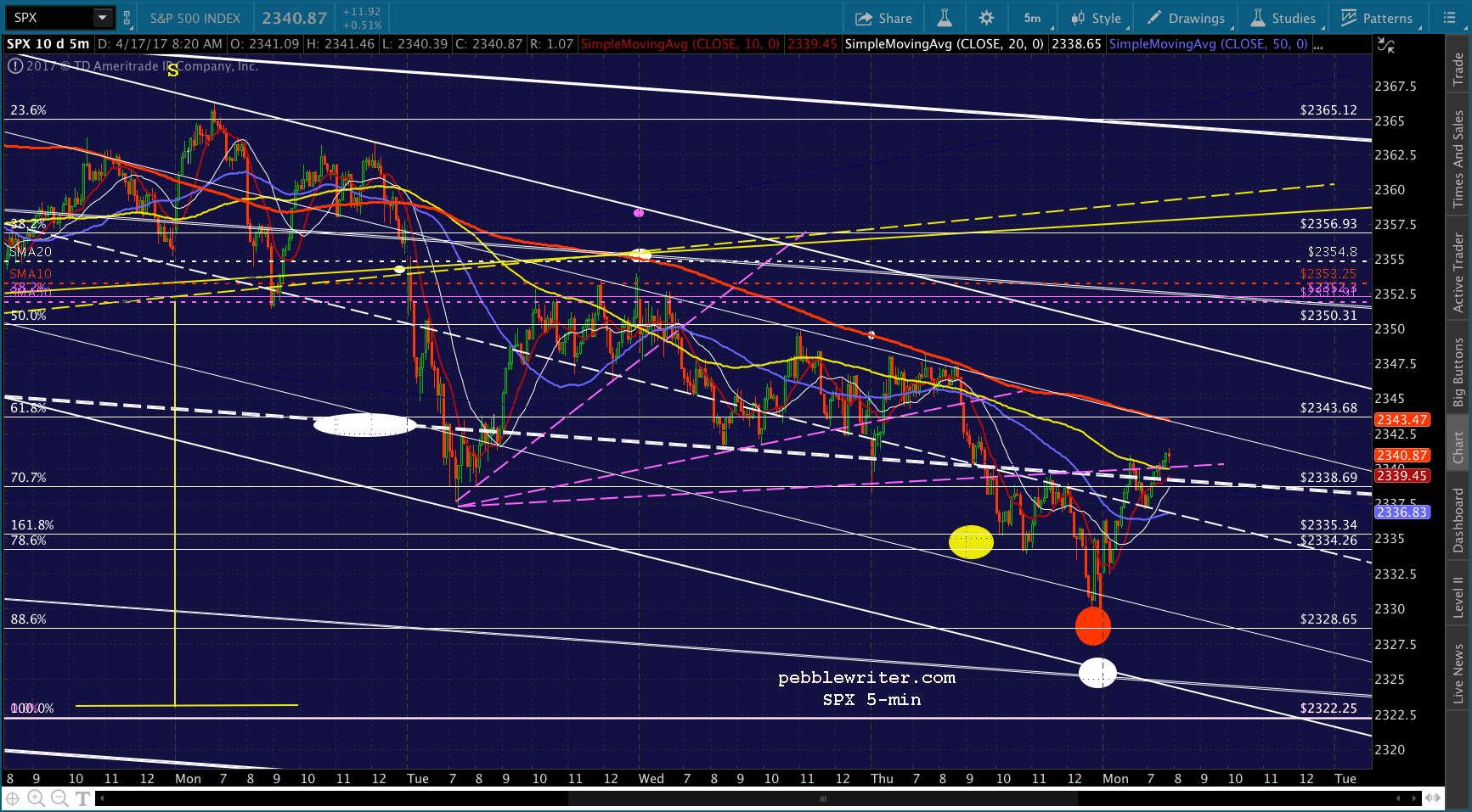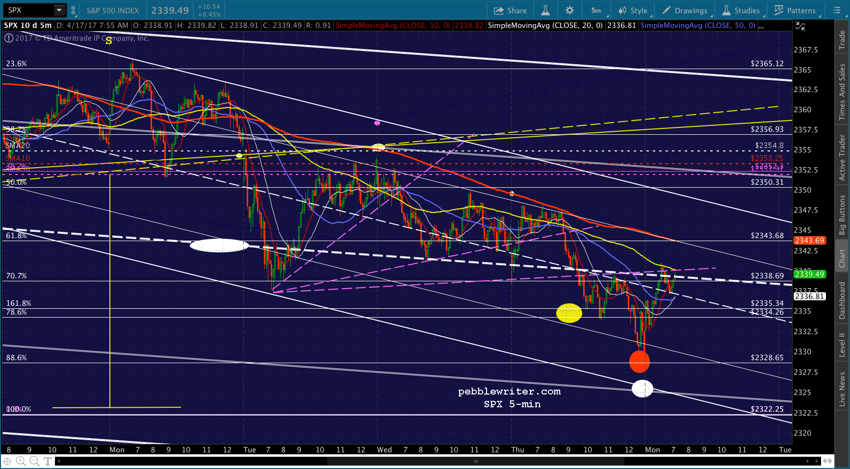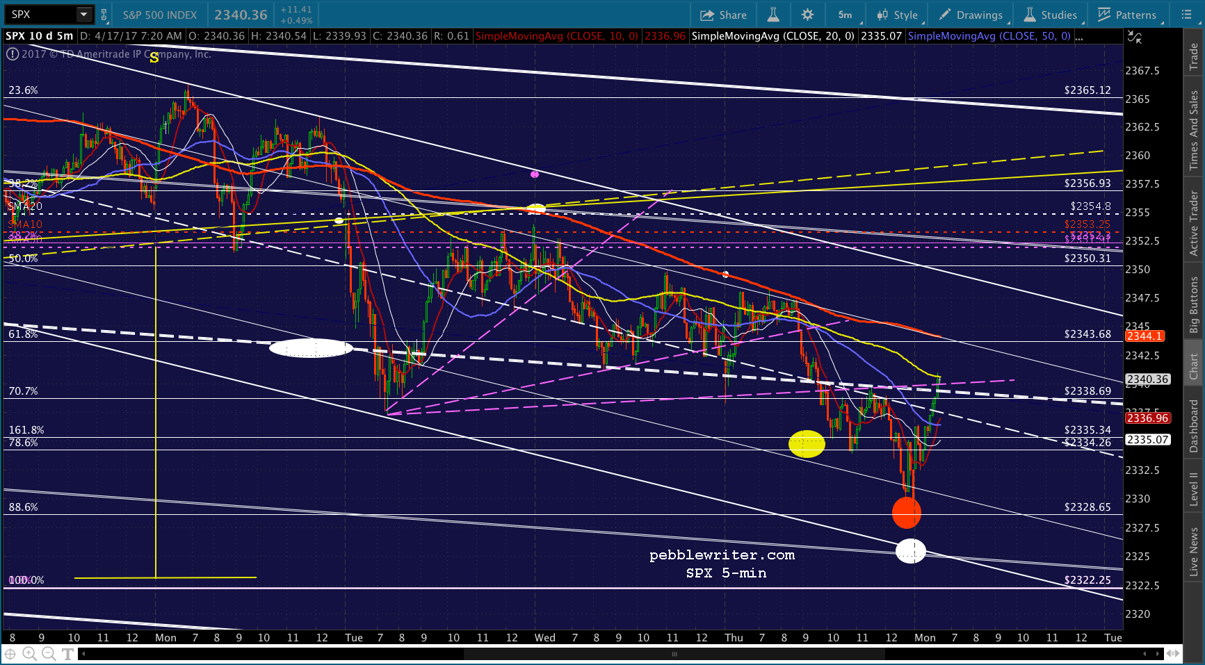 Bottom line, I don’t have a very strong feeling one way or the other about tomorrow’s open. If my 2307 target is in play, it’s likely at least a week away. Interestingly, the falling white channel will intersect with the rising yellow midline at 2307 (the white 1.272) around Apr 25 — which just happens to be the day the Carl Vinson is expected to arrive off the South Korean coast.