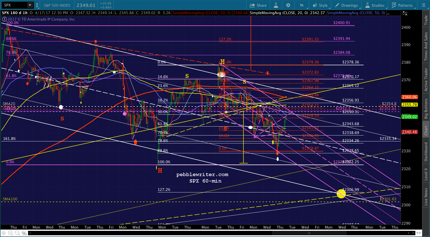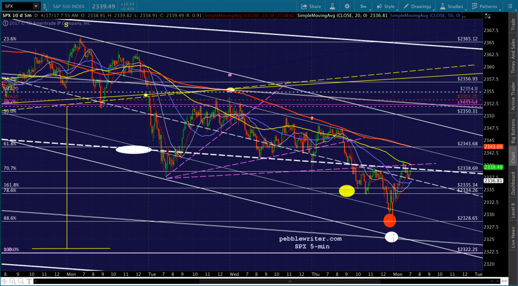 Furthermore, the ES chart shows a tag on the larger white channel .786 line that suggests a drop through to the .236 which is 2310ish — only 10 points above the SMA100. Today’s highs came very close to the top of the falling purple channel.