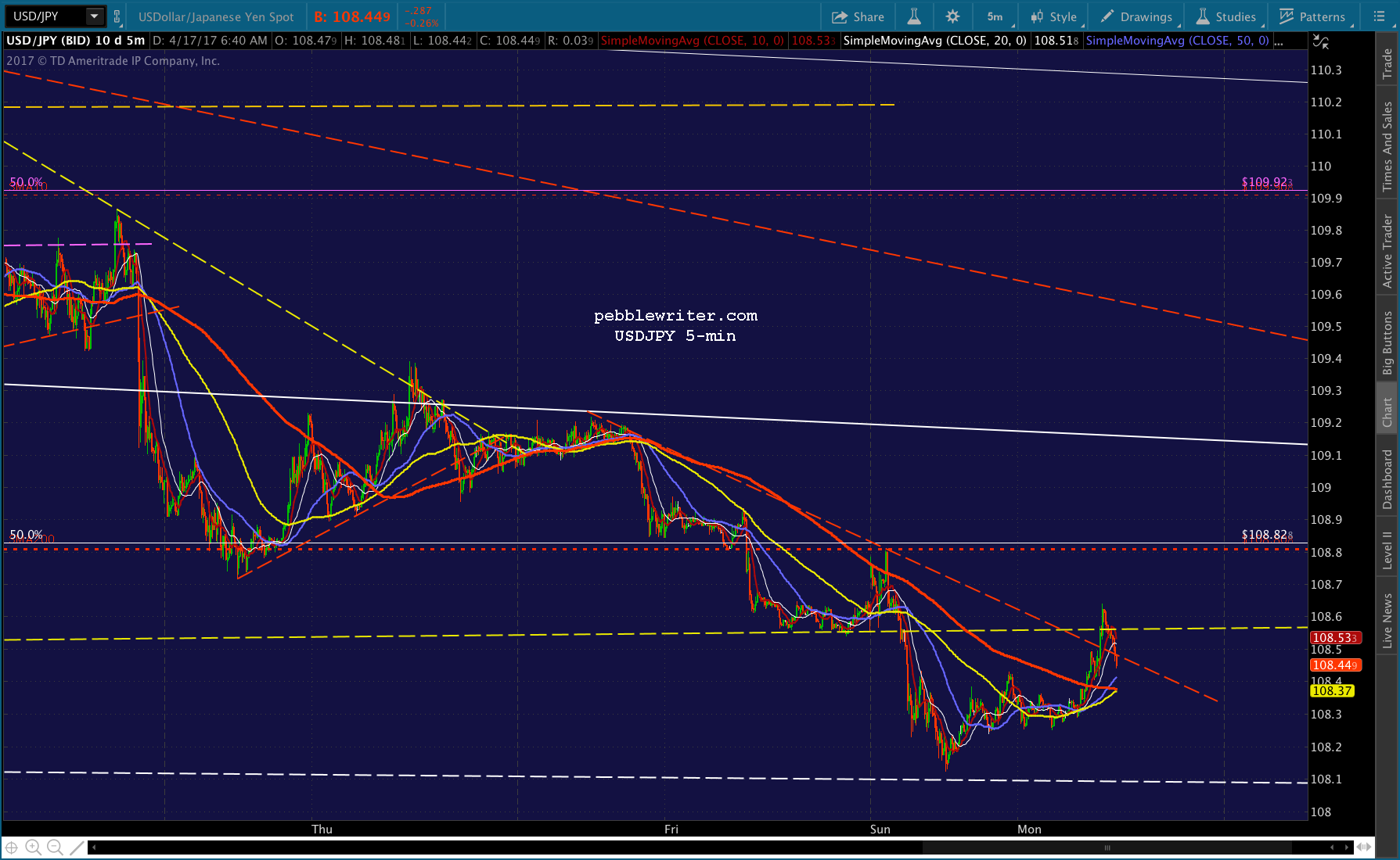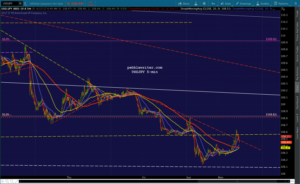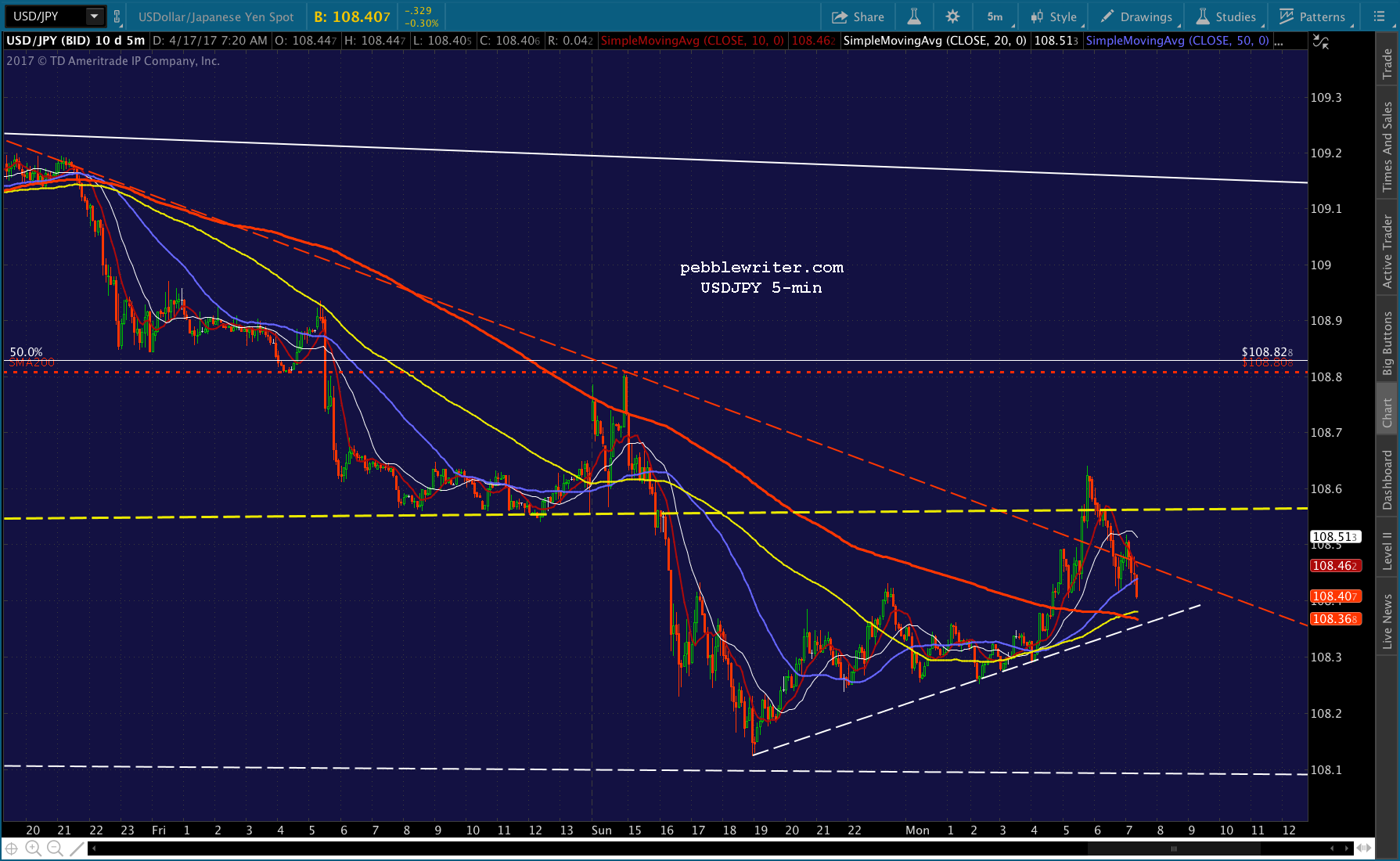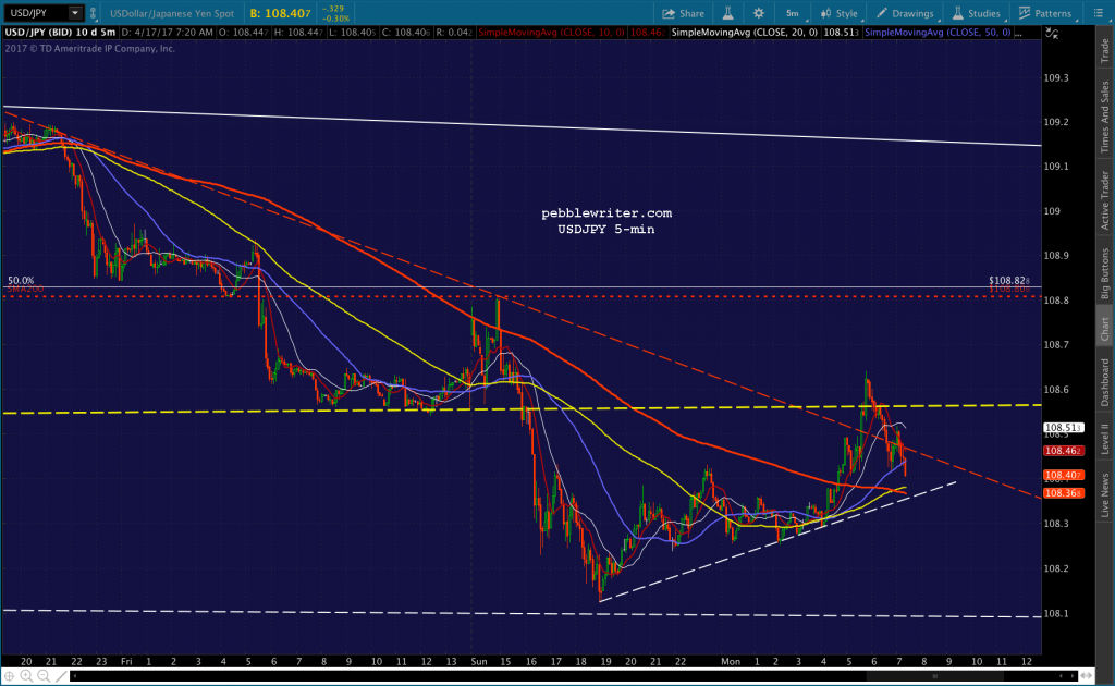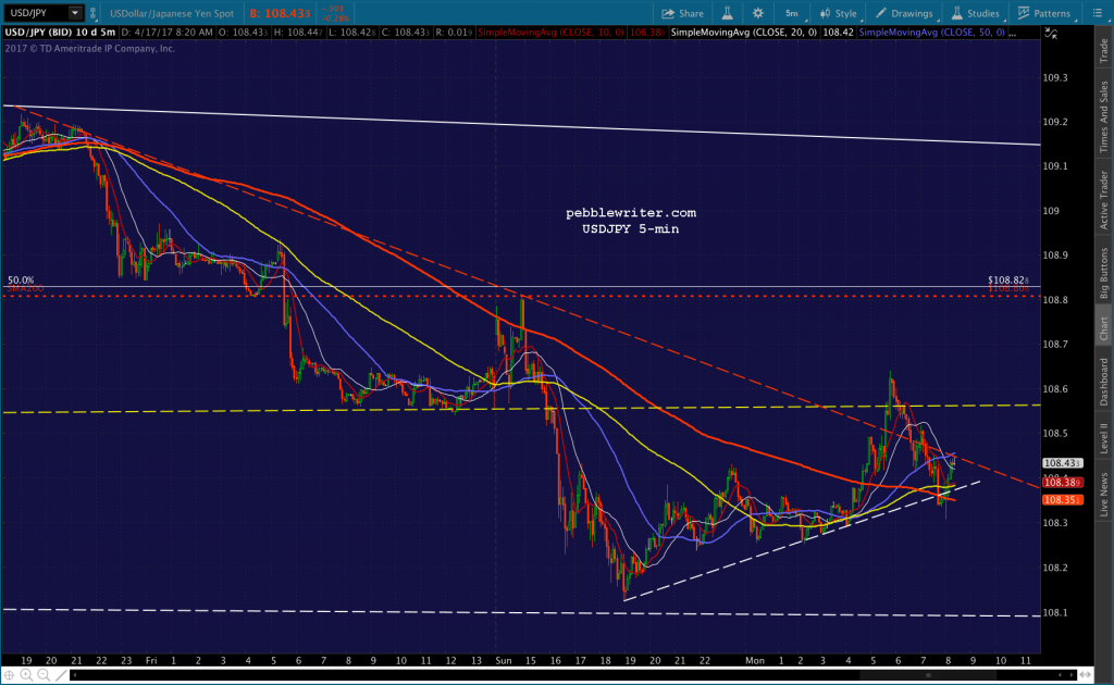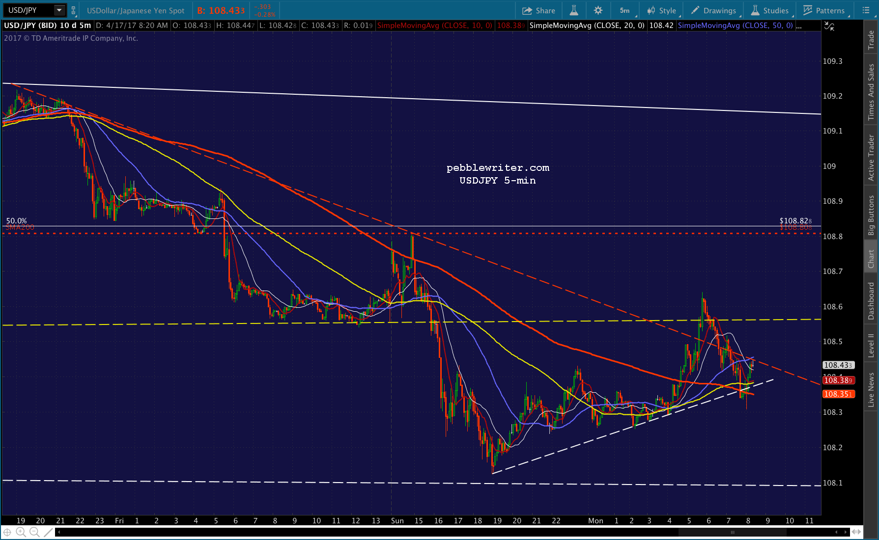 SPX has backtested of the white midlines and is threatening to push up to the SMA5 200. A reminder, this is exactly when Thursday’s initial spike ran out of steam. I’d hold on to the short position here, as I believe USDJPY is about to break down.