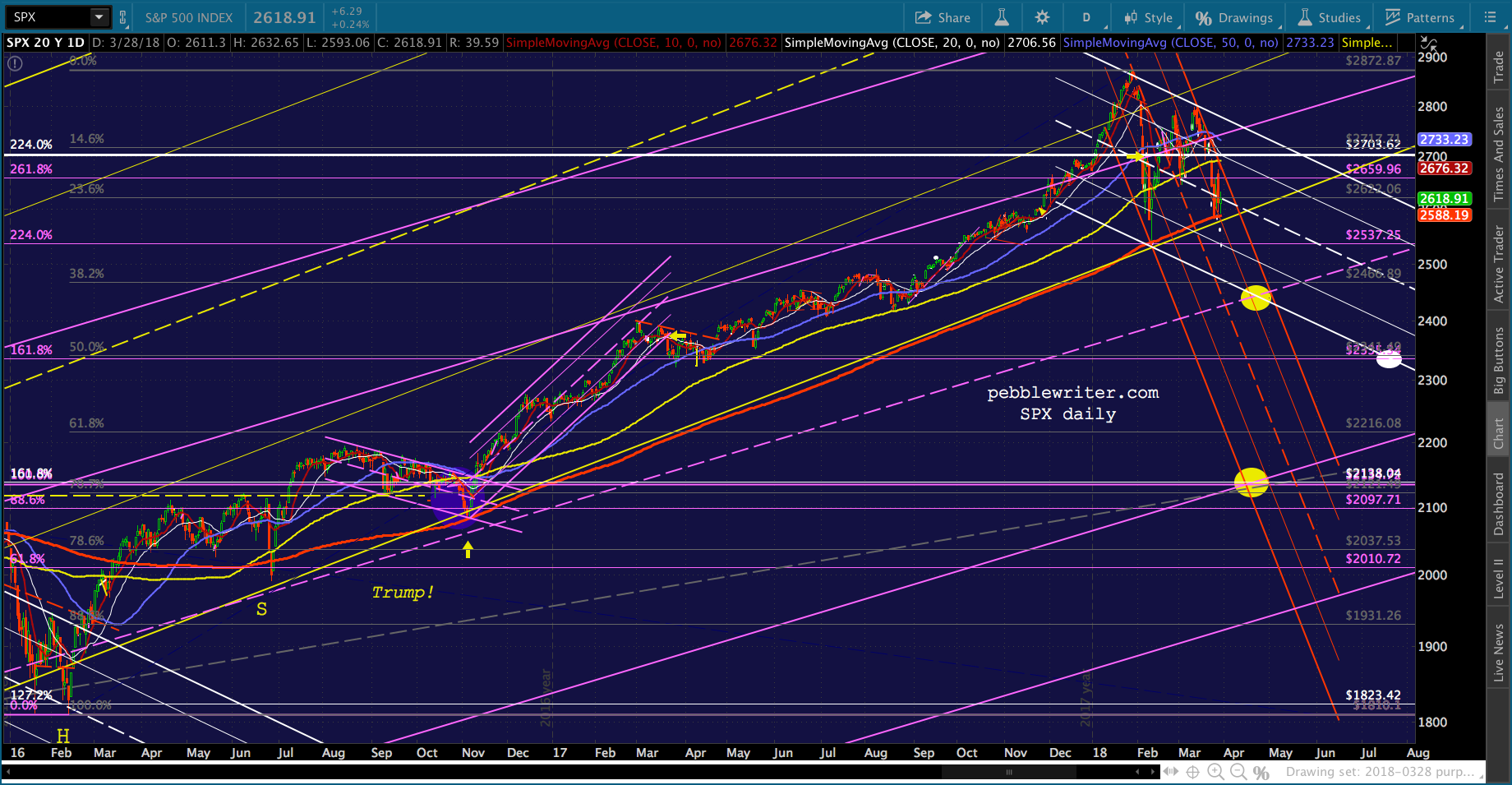 If it is allowed to decline in line with the falling white channel towards a Feb 2019 backtest, it would certainly not help any Trump-supporting incumbents come November 2018. Just thinking out loud…