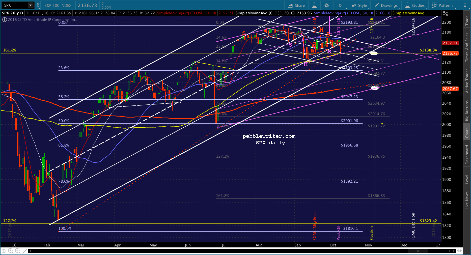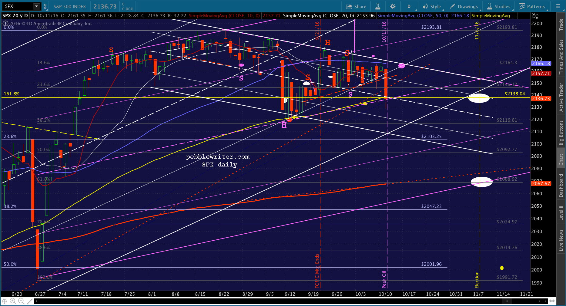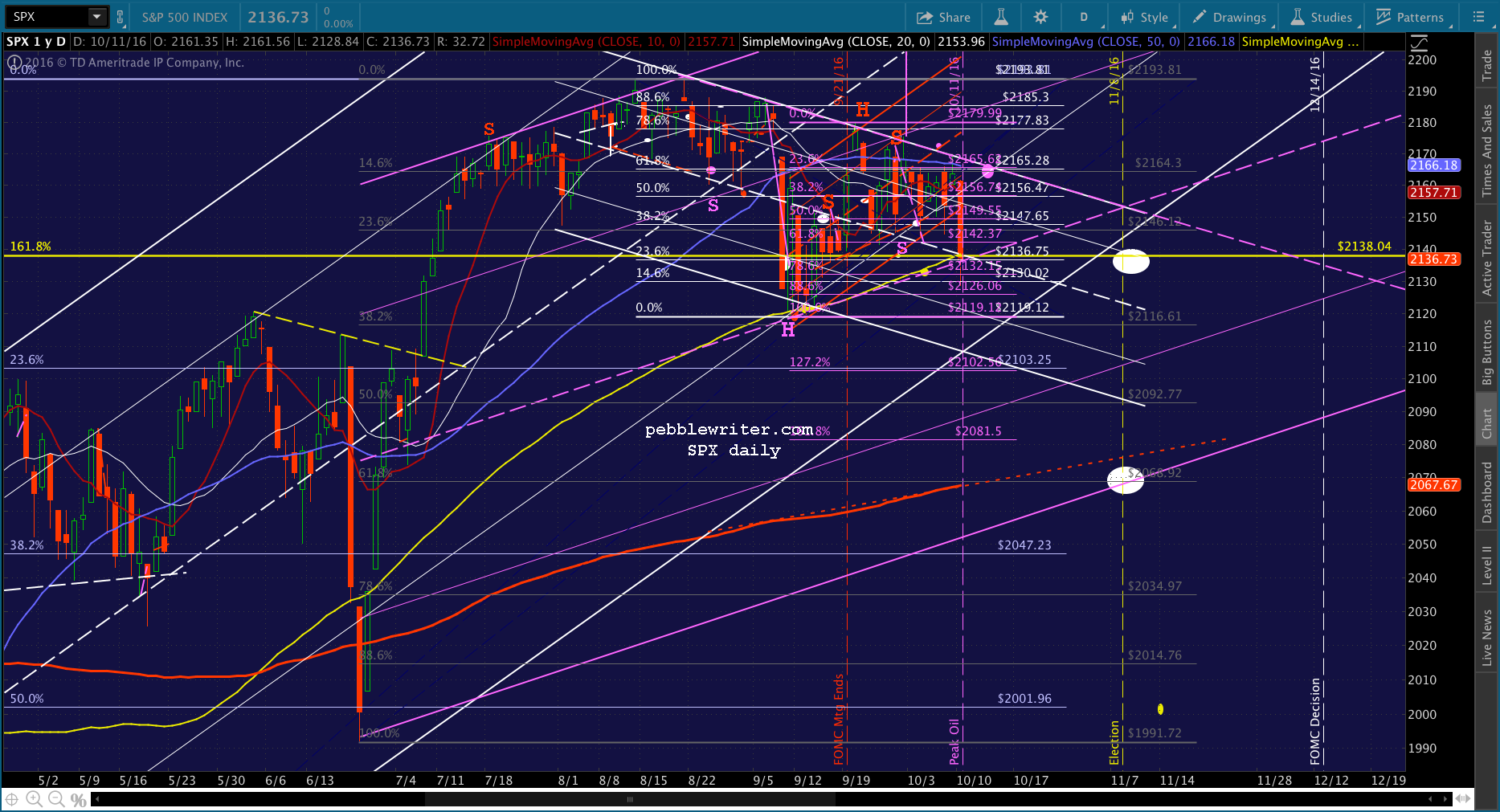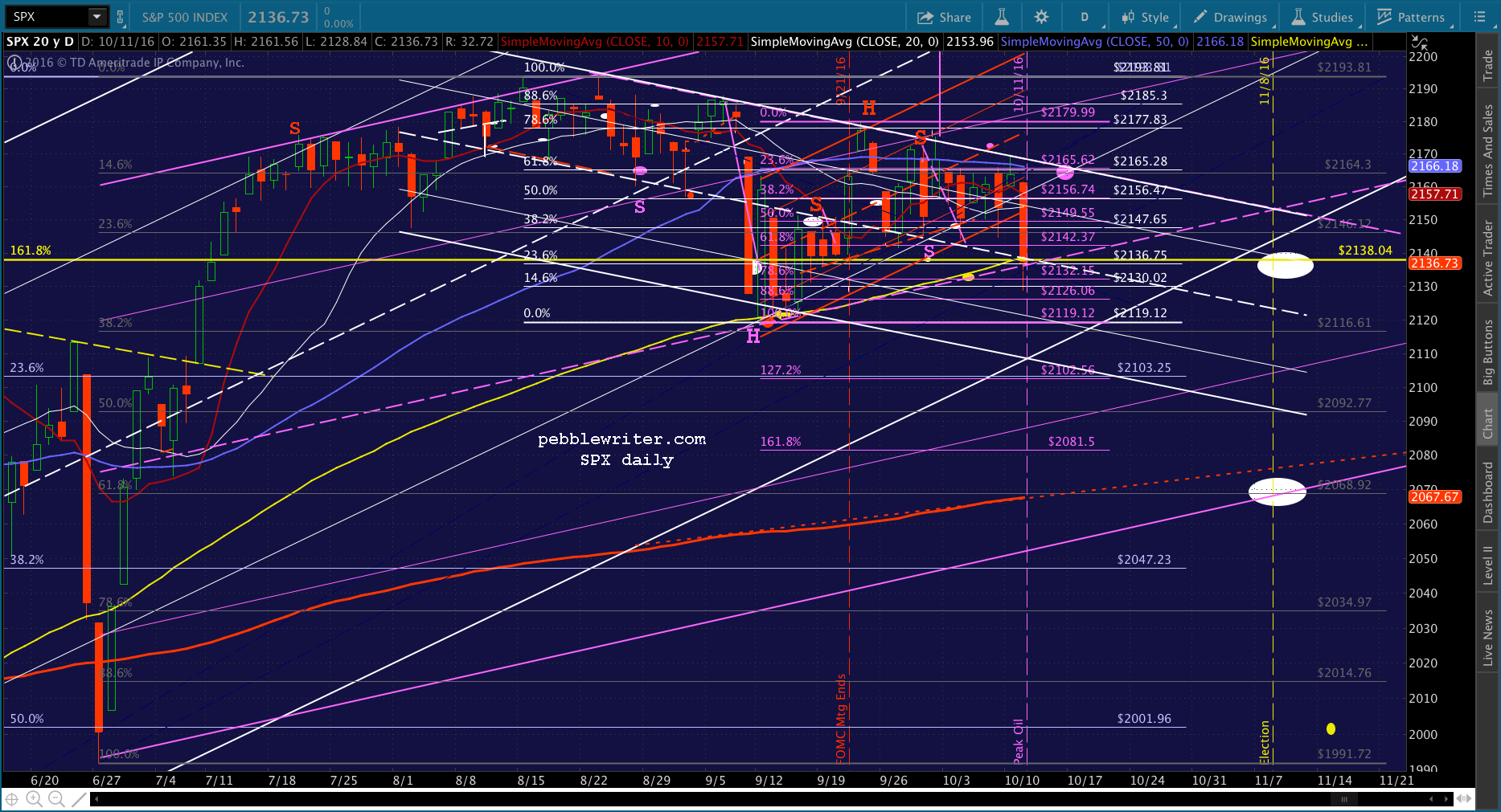 Note the white dot down at 2068 on election day. Remember, this is the target should Trump win the election, as presumably the Fed’s power would be diminished going forward. The SMA200 might level off and decline just enough to cross the Fib at that point. Even if Clinton does prevail, this might represent a good “sell the news” target.