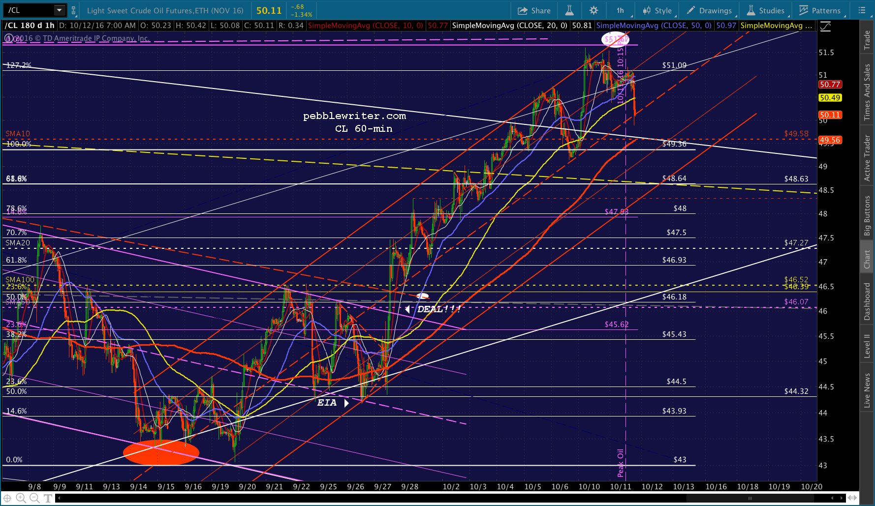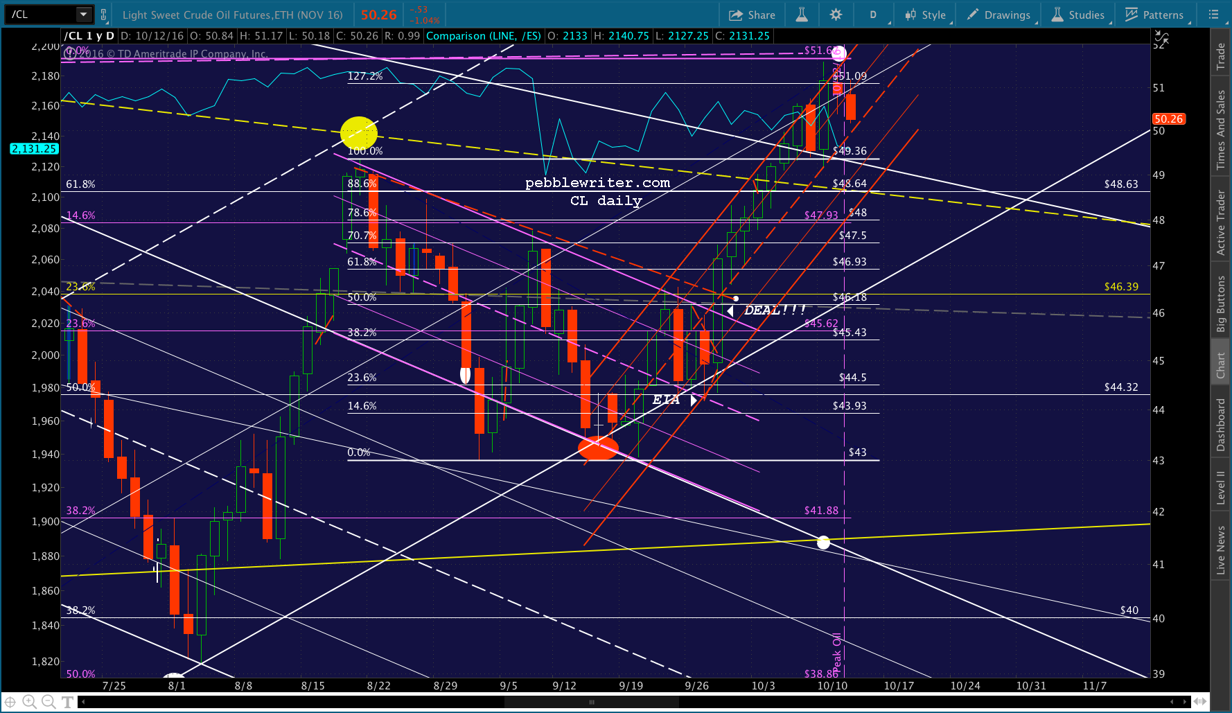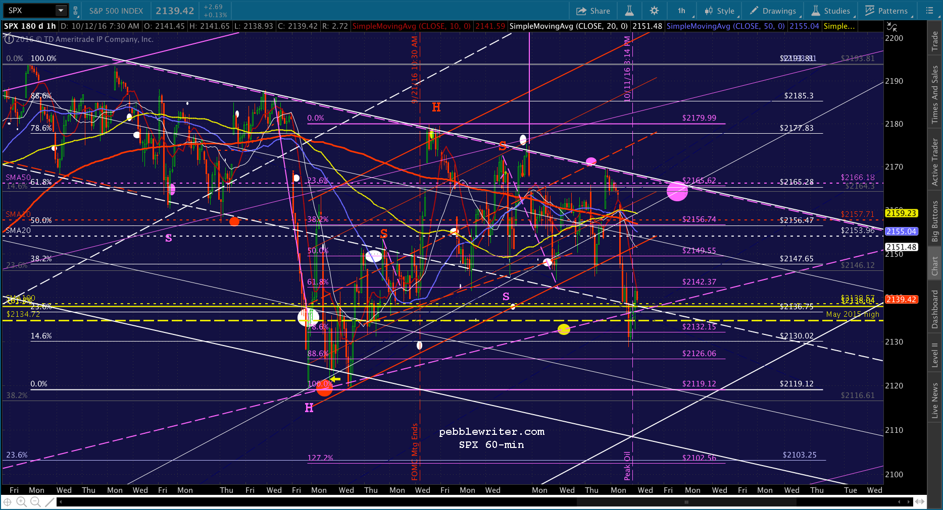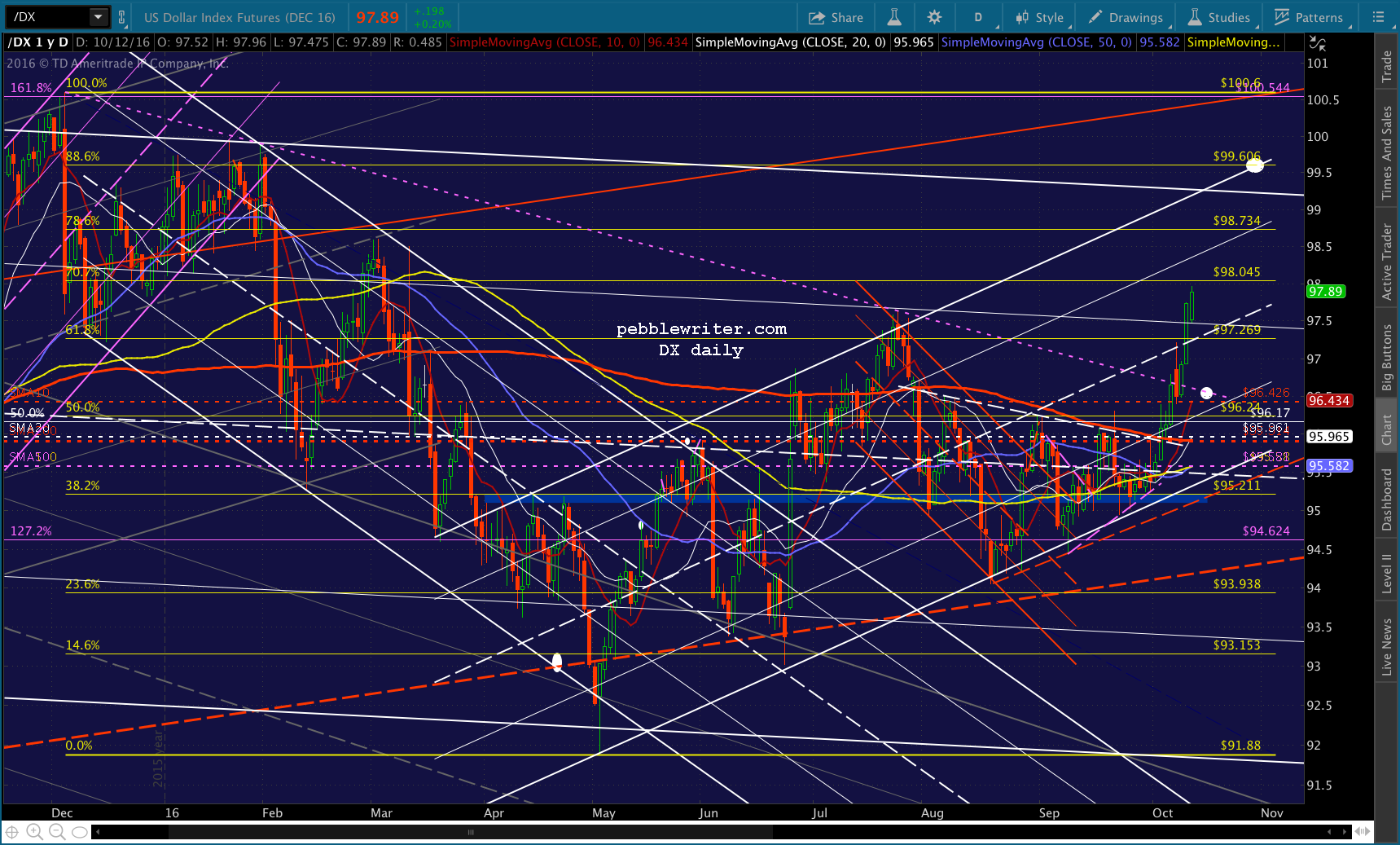 Note the white dot down at 2068 on election day. Remember, this is the target should Trump win the election, as presumably the Fed’s power would be diminished going forward. The SMA200 might level off and decline just enough to cross the Fib at that point. Even if Clinton does prevail, this might represent a good “sell the news” target.