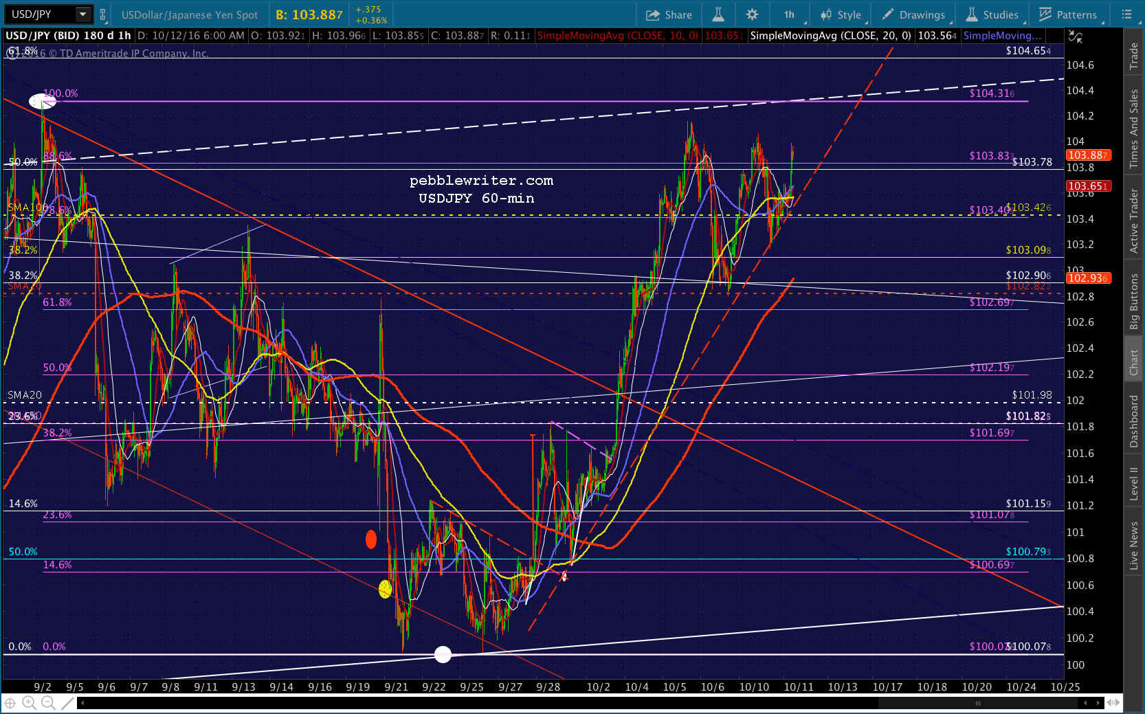 It’s strength, though, is largely a reflection of rising expectations of higher rates. We see it in DX, which recently broke out. Depending on what the minutes indicate (coming up at 2PM ET) we could see further dollar strength to the yellow .886 at 99.606 or a reversal to do some much-needed backtesting. The SMA10 and purple TL at 96.50 would be a good start.